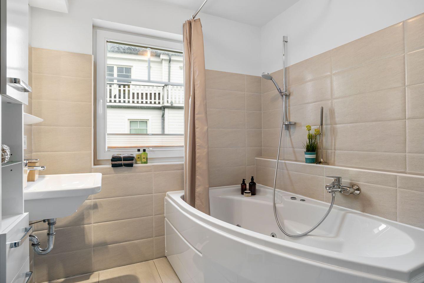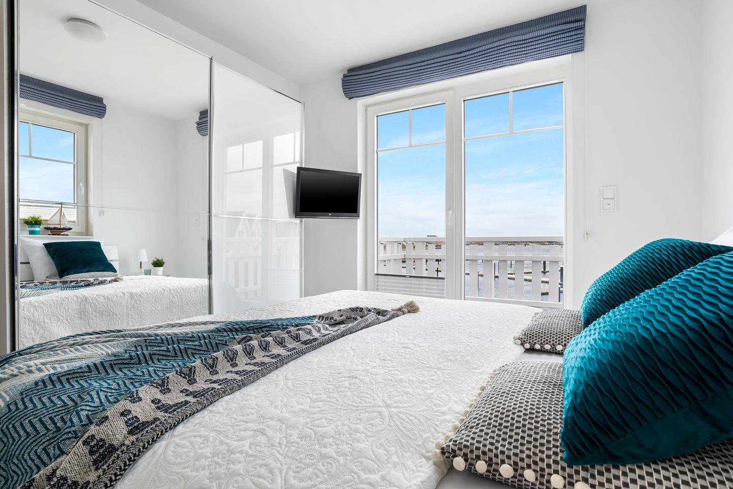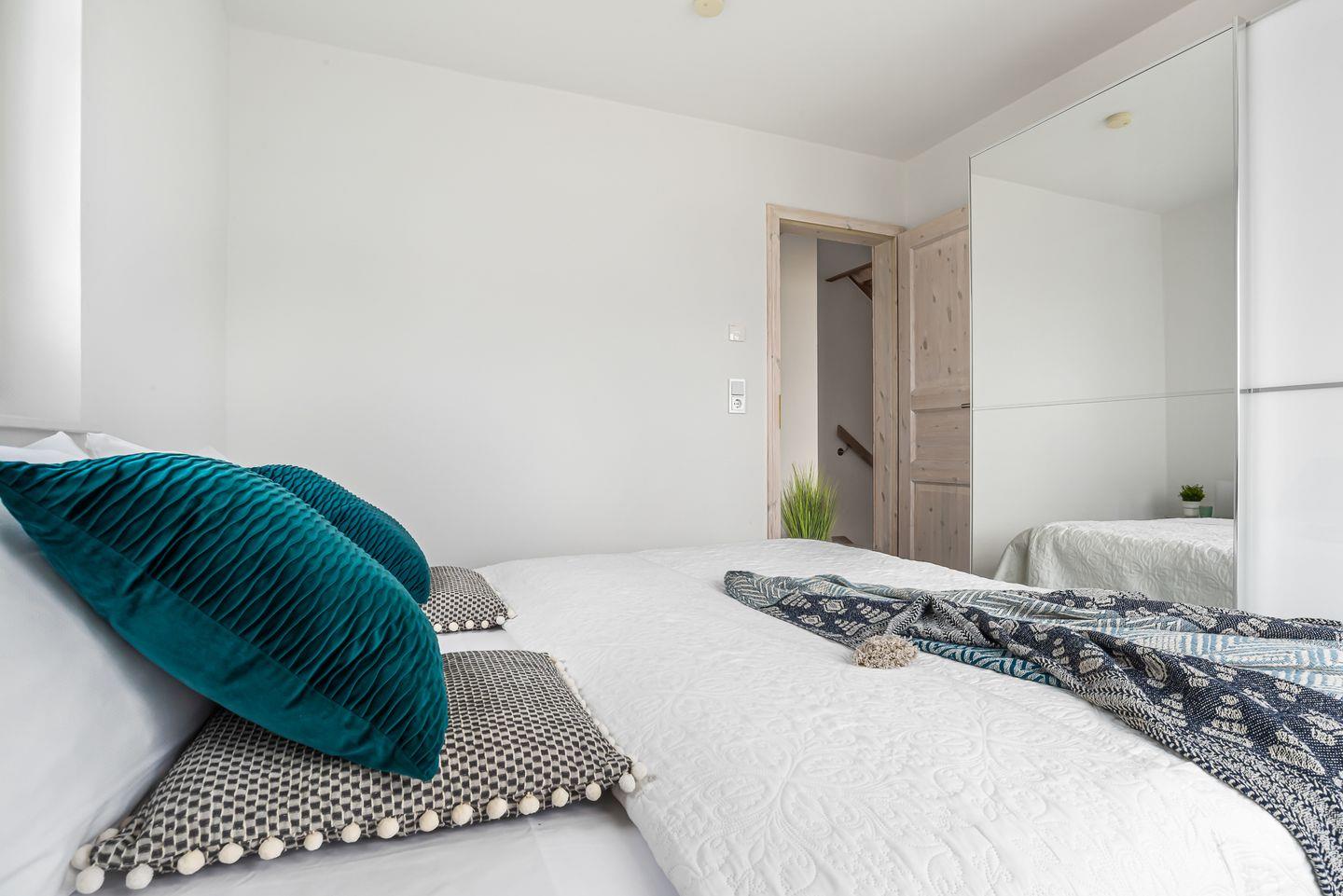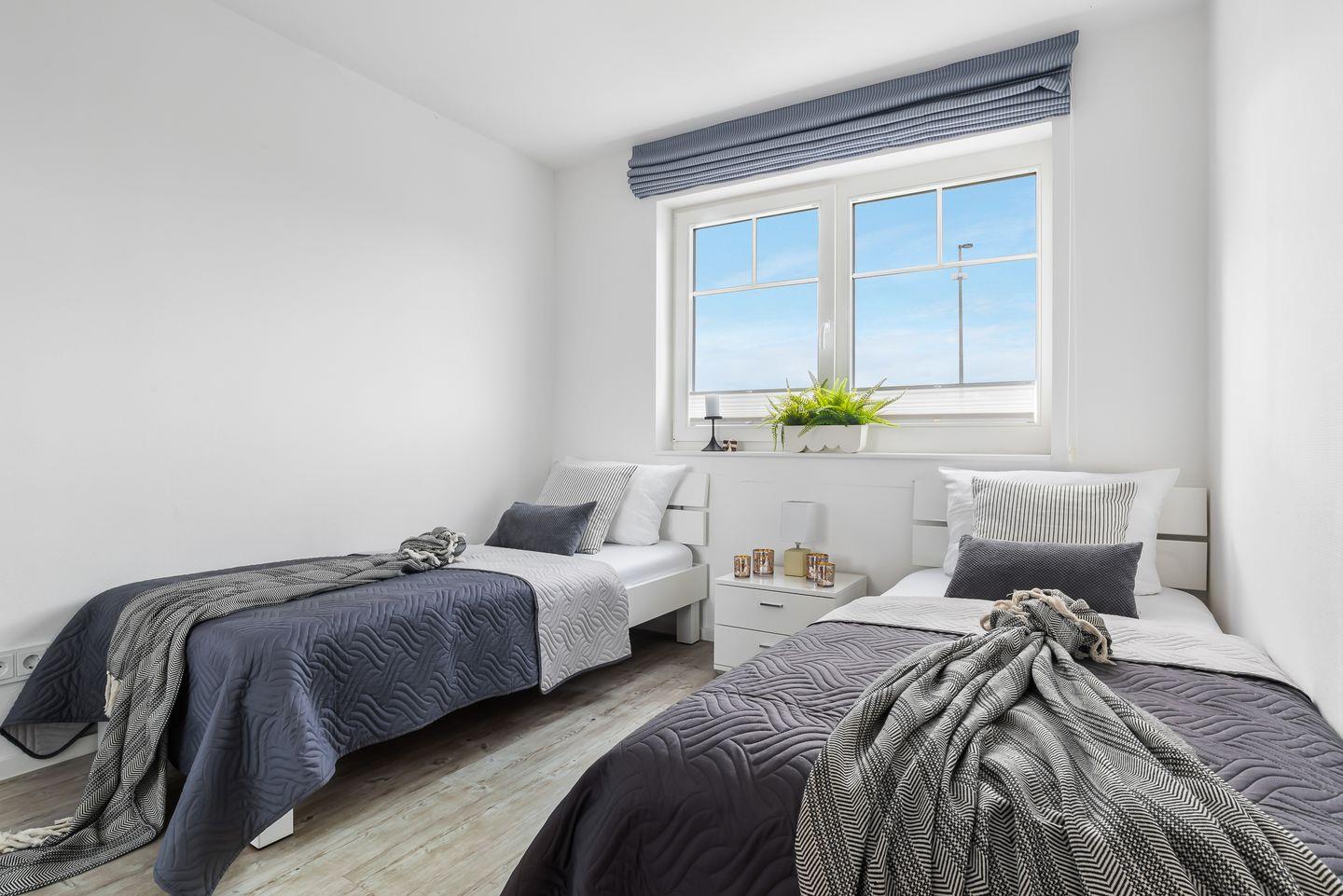 Eine Treppe führt in das erste Obergeschoss, in dem sich zwei freundliche Schlafzimmer und das Badezimmer befinden. Das Hauptschlafzimmer verfügt über ein bequemes Doppelbett, einen Fernseher und einen eigenen Südbalkon. Das zweite Schlafzimmer ist mit zwei Einzelbetten ausgestattet, die eine angenehme Nachtruhe versprechen. Das angrenzende Badezimmer mit großer Whirlpool-Badewanne lädt auch bei ungünstigem Wetter zu entspannenden Stunden im Beach House ein.