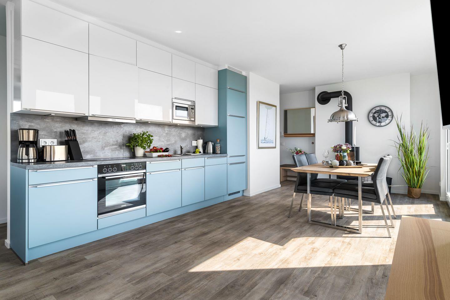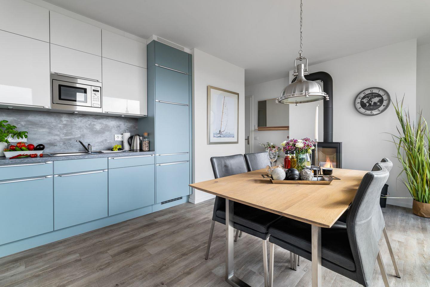 Der großzügige Wohn- und Essbereich ist der perfekte Ort für gesellige Stunden. Ausgestattet mit einer vollintegrierten Küche, können Sie hier leckere Mahlzeiten für Familie und Freunde zubereiten, während Sie den Blick auf die vorbeiziehenden Segelboote genießen. In der kühleren Jahreszeit sorgt der Kamin für gemütliche Atmosphäre.
