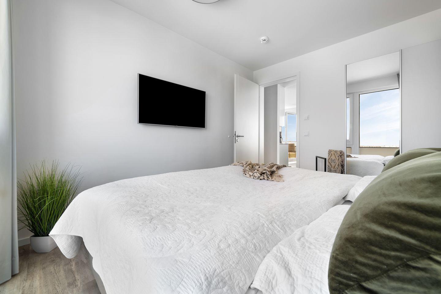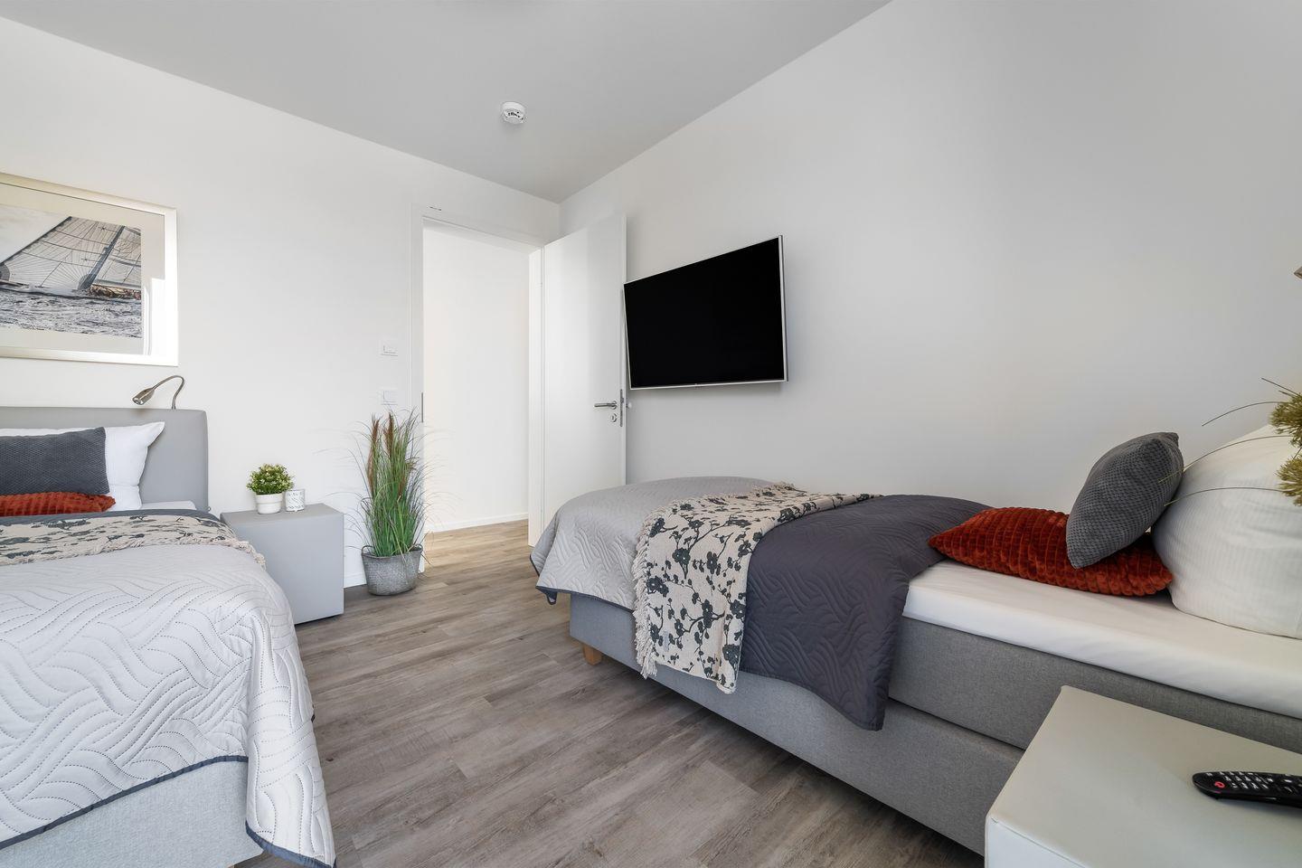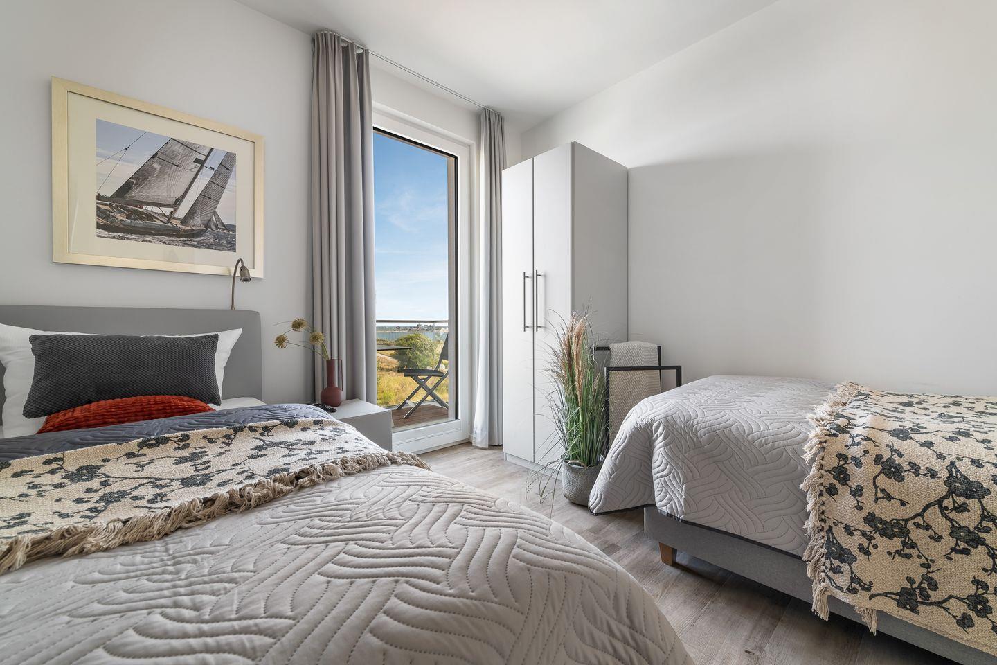 Das Apartment "BeachViewOne" bietet zwei Schlafzimmer, ausgestattet mit hochwertigen Boxspringbetten für einen erholsamen Schlaf. Entspannen Sie sich in der finnischen Sauna oder genießen Sie ein Bad in der großzügigen Wanne.