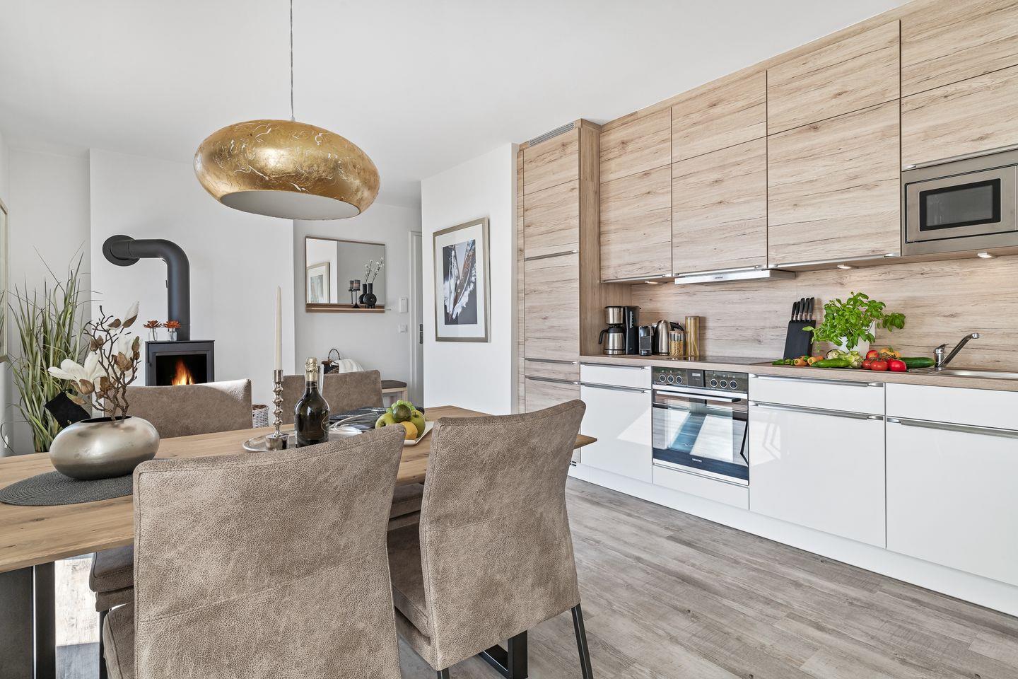 Der großzügige Wohn- und Essbereich ist der perfekte Ort für gesellige Stunden. Ausgestattet mit einer vollintegrierten Küche, können Sie hier leckere Mahlzeiten für Familie und Freunde zubereiten, während Sie den Blick auf die vorbeiziehenden Segelboote genießen. In der kühleren Jahreszeit sorgt der Kamin für gemütliche Atmosphäre.