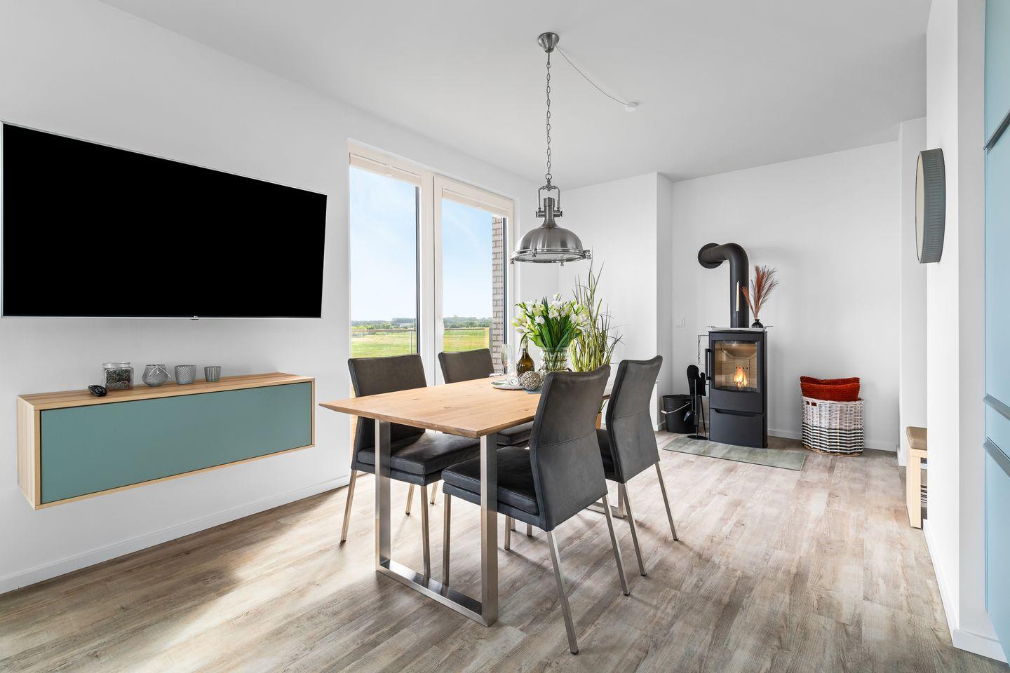 Der großzügige Wohn- und Essbereich ist der perfekte Ort für gesellige Stunden. Ausgestattet mit einer vollintegrierten Küche, können Sie hier leckere Mahlzeiten für Familie und Freunde zubereiten, während Sie den Blick auf die vorbeiziehenden Segelboote genießen. In der kühleren Jahreszeit sorgt der Kamin für gemütliche Atmosphäre.