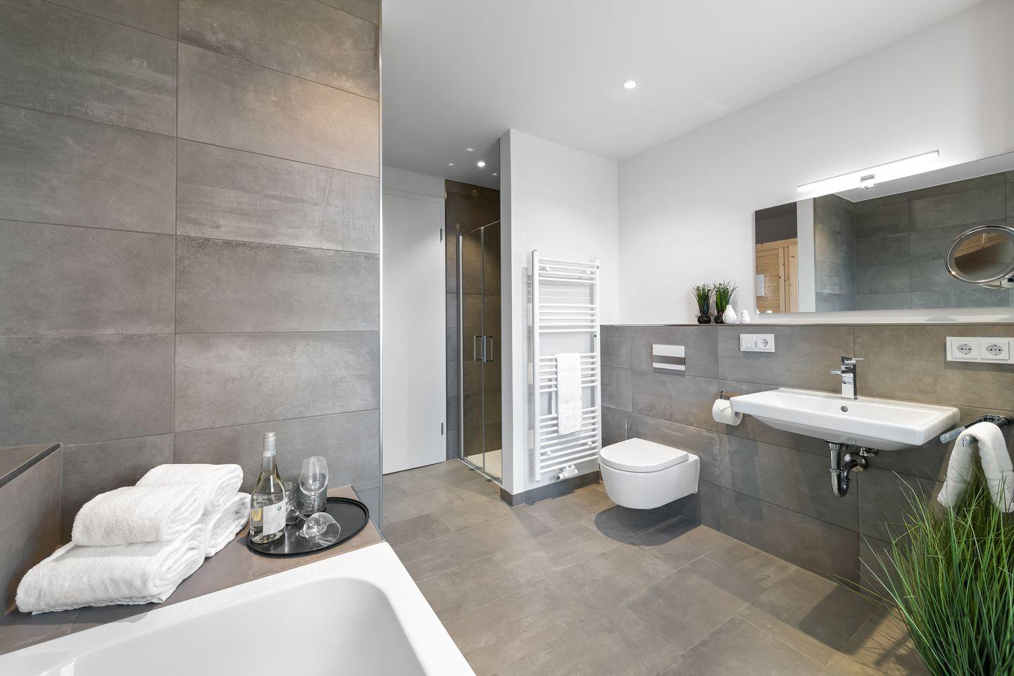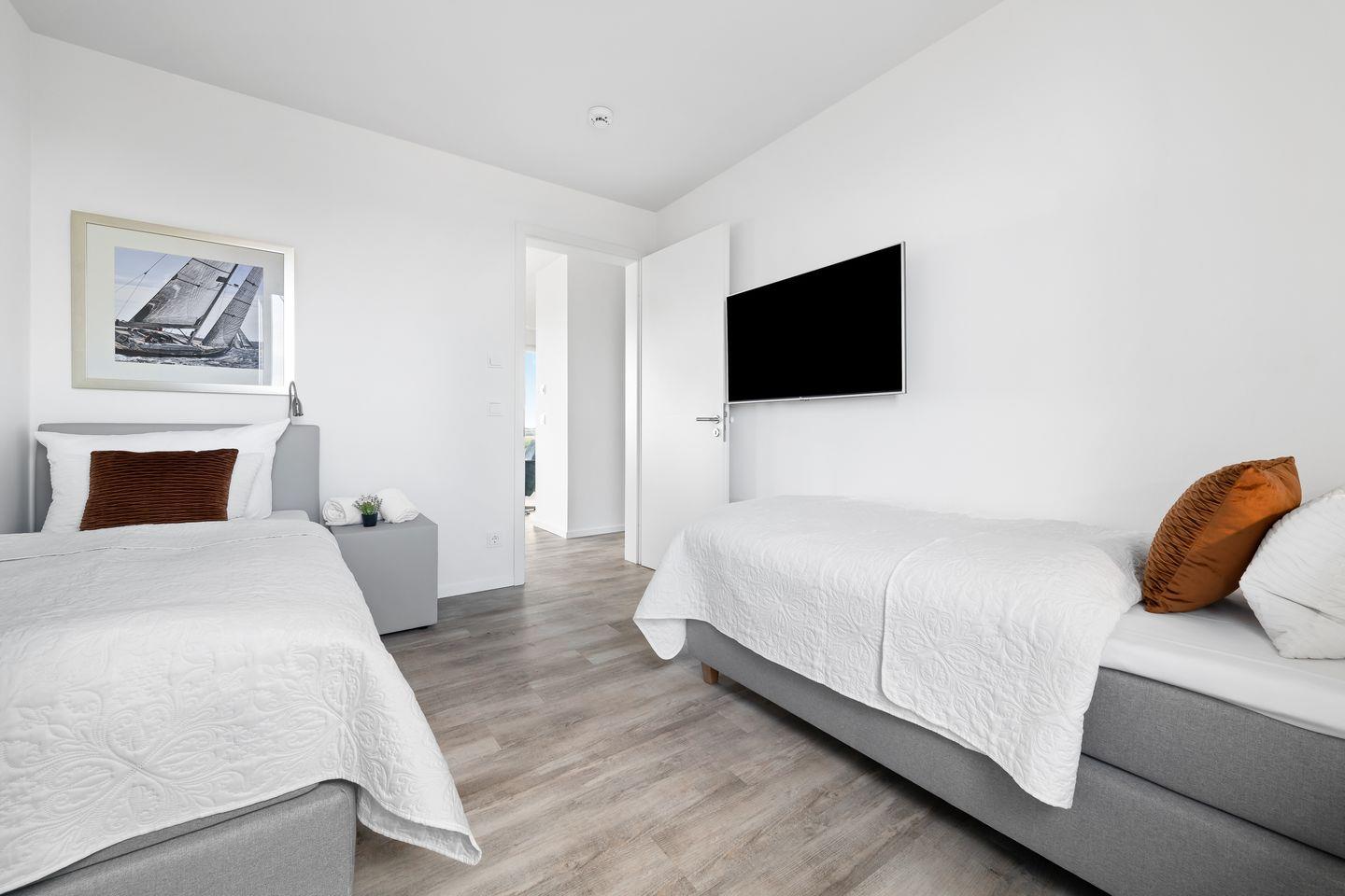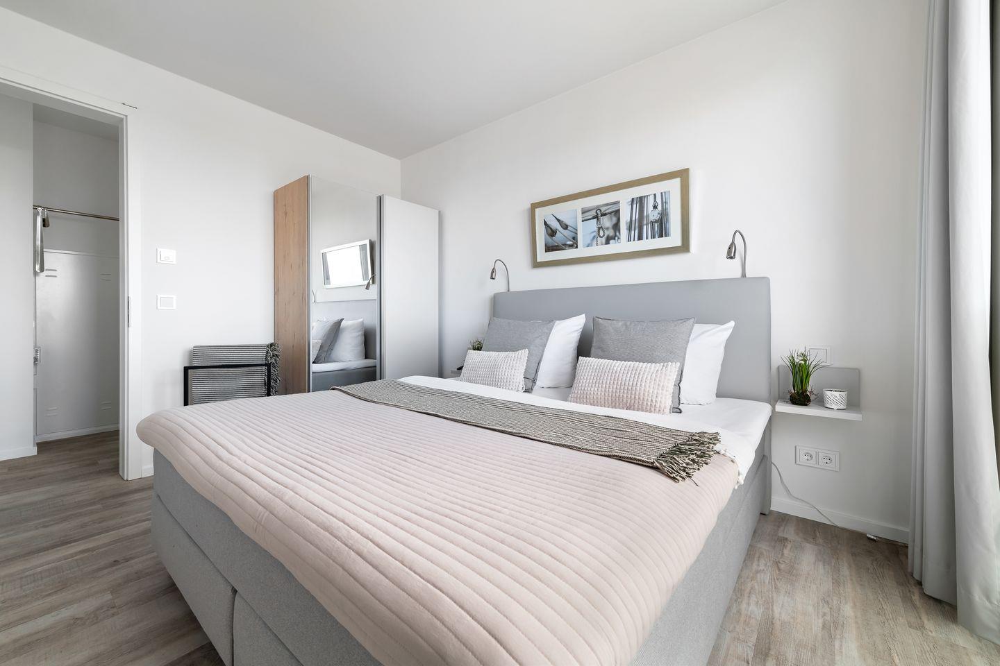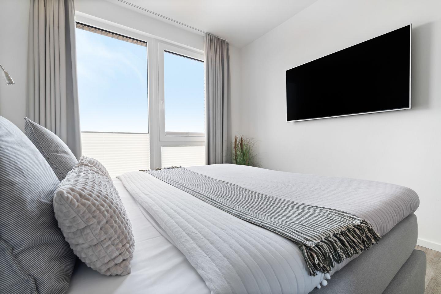 Das Apartment "BeachViewFour" bietet zwei Schlafzimmer, ausgestattet mit hochwertigen Boxspringbetten für einen erholsamen Schlaf. Entspannen Sie sich in der finnischen Sauna oder genießen Sie ein Bad in der großzügigen Wanne.