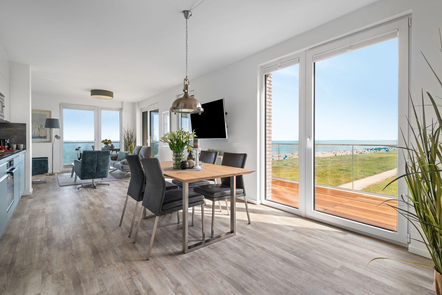 Luxus-Ferienwohnung "BeachViewFour" im 3. OG, direkt am Ostseestrand, mit Panoramafenstern und großem Meerblickbalkon. Der großzügige Wohn-Essbereich, die integrierte Küche und ein Kamin bieten ideale Bedingungen für gemütliche Stunden. Zwei Schlafzimmer mit Boxspringbetten, eine Badewanne und eine finnische Sauna sorgen für Erholung im Ostseeurlaub. Der große Eckbalkon und der nahegelegene Strand laden zum Entspannen ein. Ein Parkplatz, eine E-Ladestation sowie ein Fahrradkeller sind vor Ort.