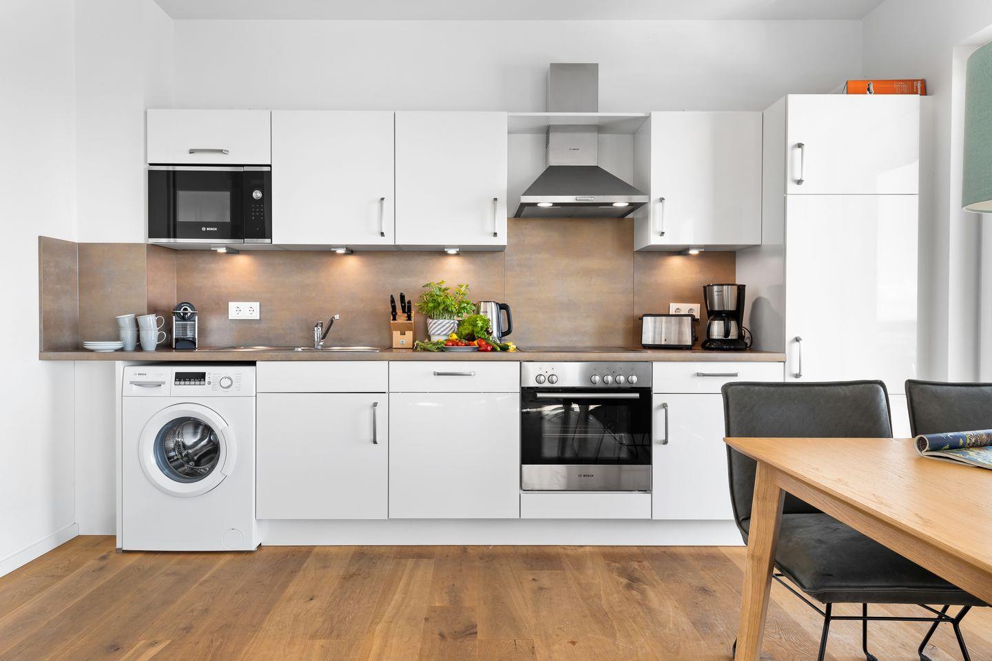 Die moderne Einbauküche bietet alles, was das Herz eines Hobbykochs begehrt. Die dort zubereiteten Mahlzeiten können anschließend entweder am direkt angrenzenden Esstisch oder, je nach Wetterlage, auf dem großzügigen Balkon verspeist werden. Ein Elektro-Grill steht den Gästen zur freien Verfügung.