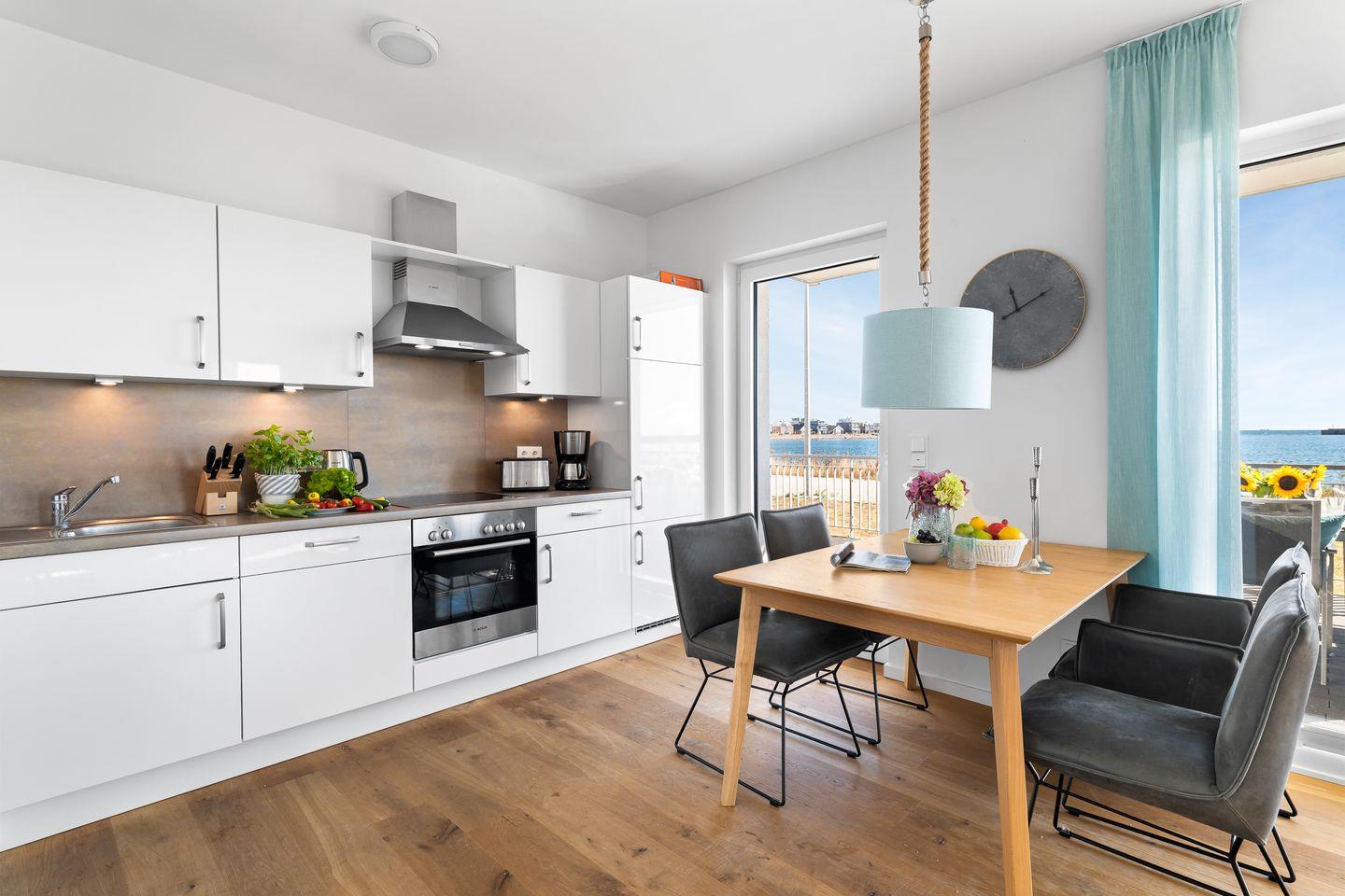 Durch die bodentiefe Fensterfront dringt viel Licht in die Wohnung und bietet vom Wohn-, als auch vom Essbereich einen unvergleichlichen Blick auf die Wasserkulisse von Schlei und Ostsee.