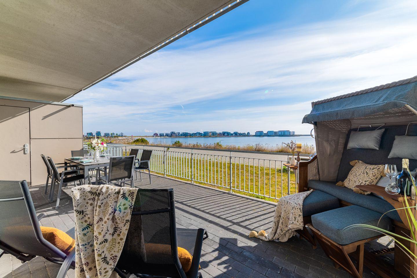 Ein wahrer Wohlfühlort ist der stilvoll möblierte Wohnbereich mit hellem Parkettboden, der durch die Panoramafront einen herrlichen Blick auf die Ostsee bietet. Für Gemütlichkeit sorgt außerdem ein Kaminofen und bequeme Sitzmöbel. Direkt an den Wohnbereich schließt die hochwertige Einbauküche an, sie ist mit allem ausgestattet, was das Hobbykoch-Herz begehrt. Während des Kochens blickt man auf die vorbeiziehenden Segelschiffe - was will man Meer?