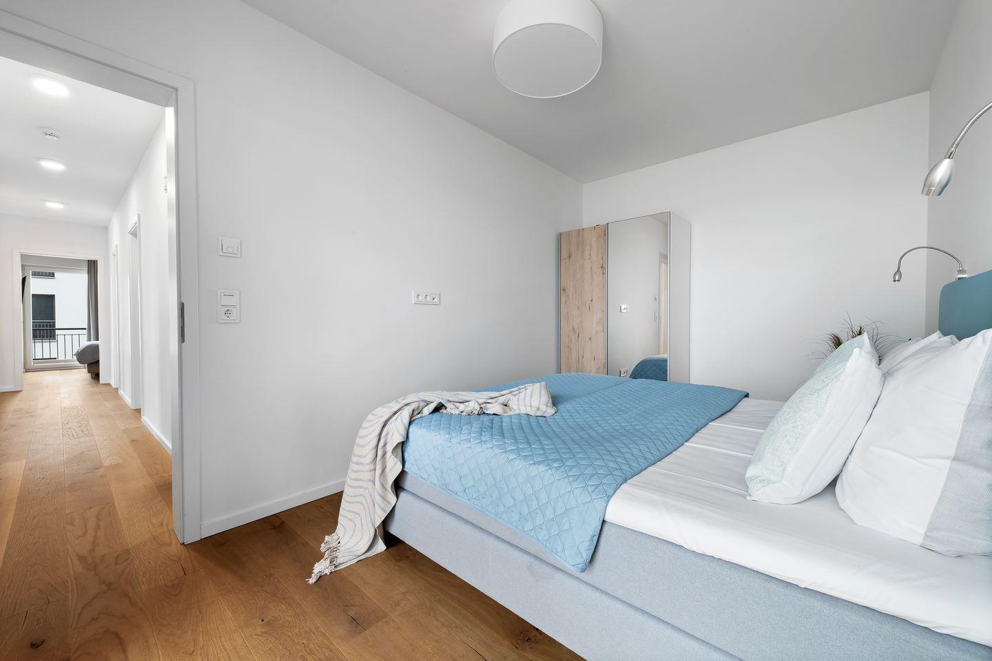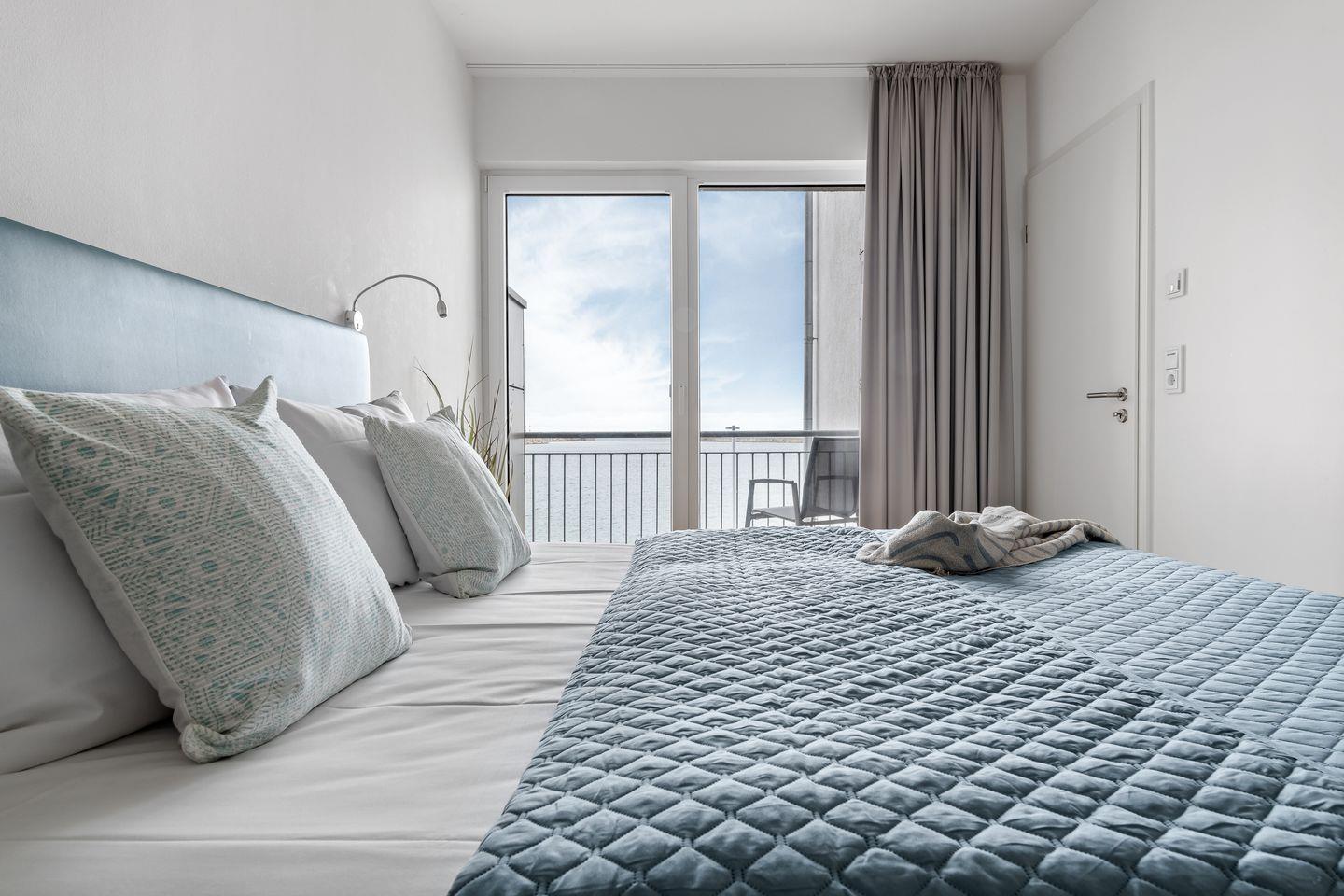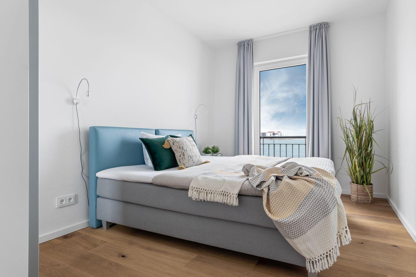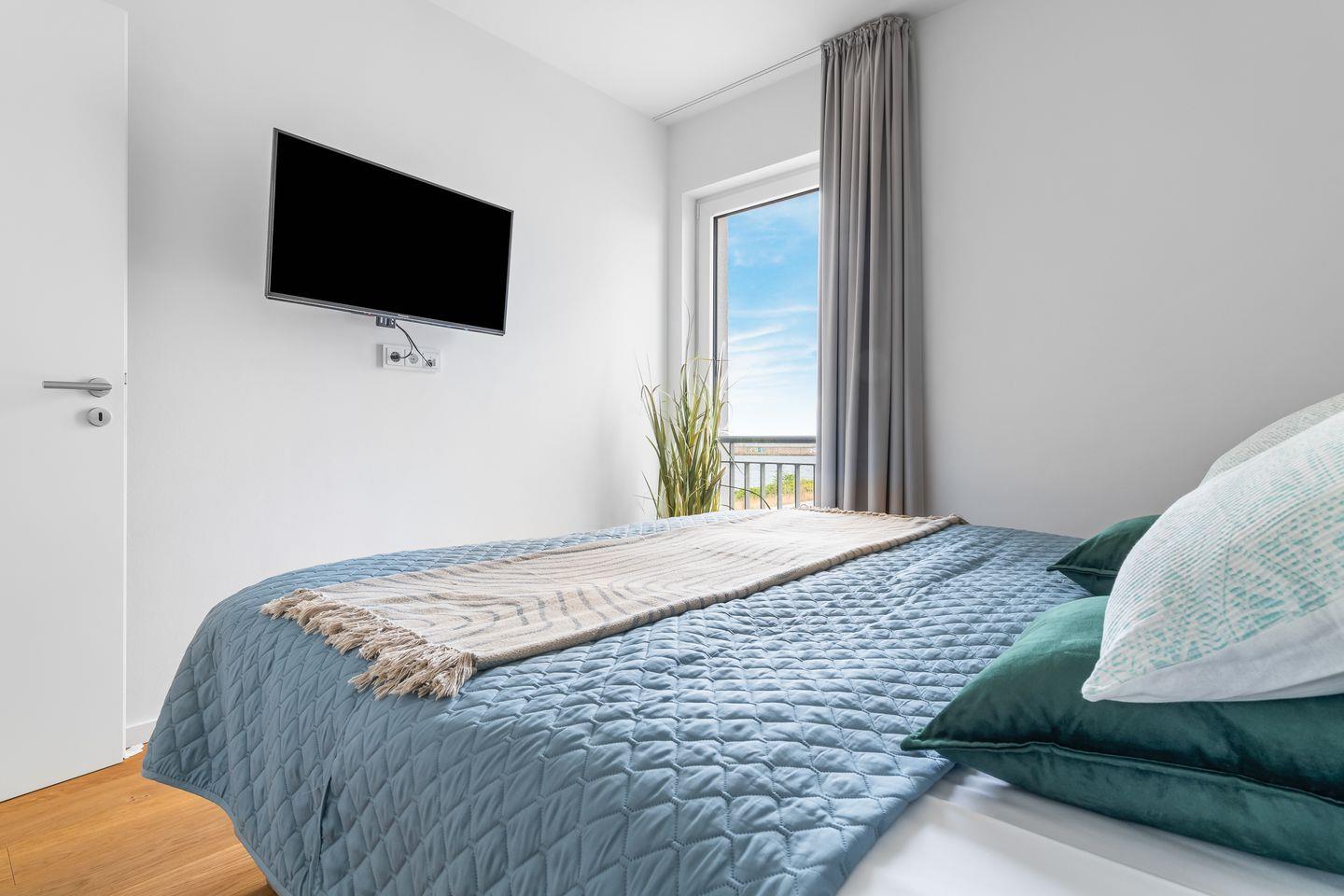 Drei Schlafzimmer bieten Platz für insgesamt sechs Personen und verfügen alle über hochwertige Boxspringbetten, die einen entspannten und erholsamen Schlaf versprechen. Die bodentiefen Fenster lassen sich mittels Gardinen abdunkeln und in einem der drei Schlafzimmer befindet sich ein weiterer Flatscreen TV.
