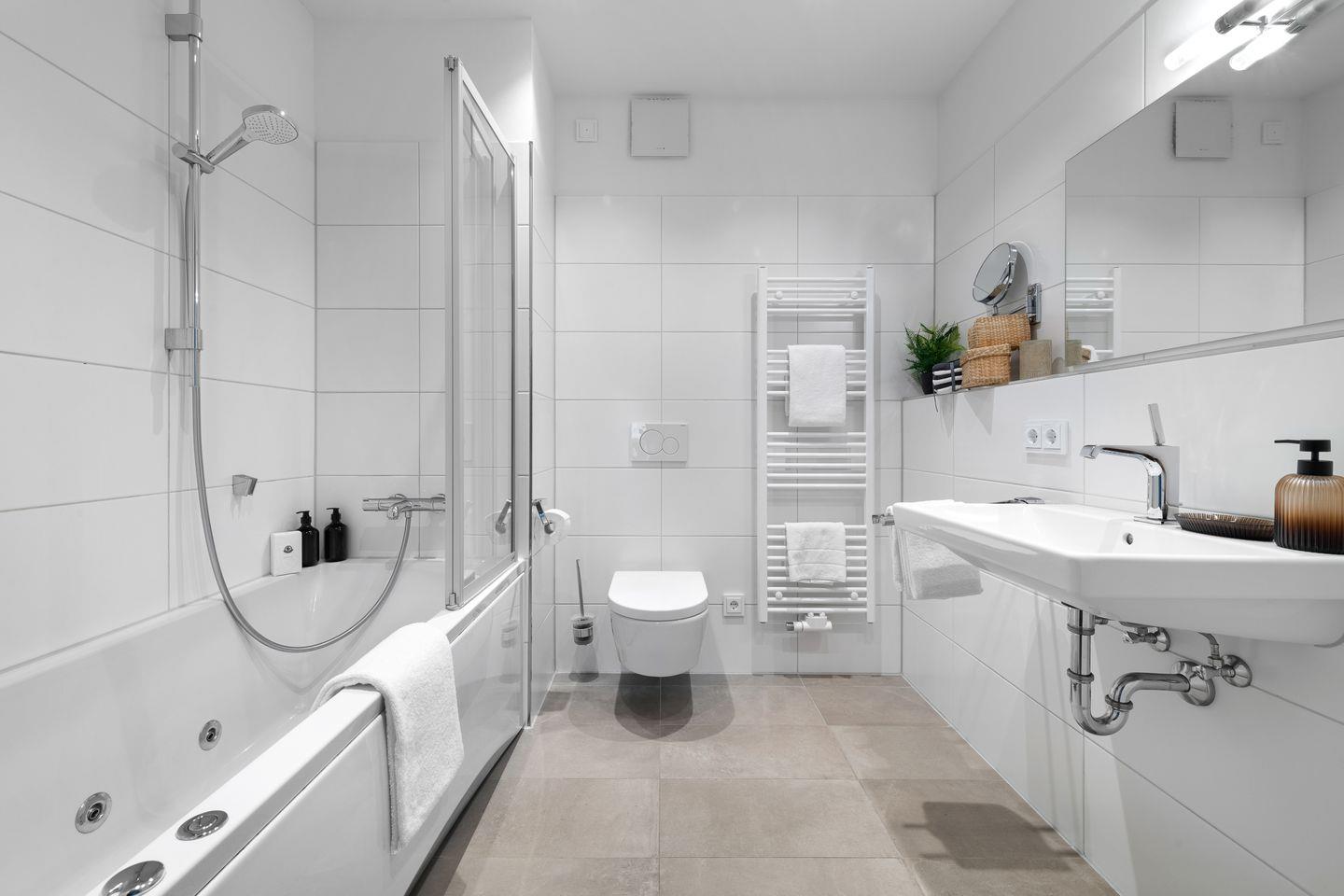 Zu dem modernen Badezimmer, dass mit einer Badewanne mit Dusche und WC ausgestattet ist, steht den Gästen noch ein separates WC zur Verfügung.