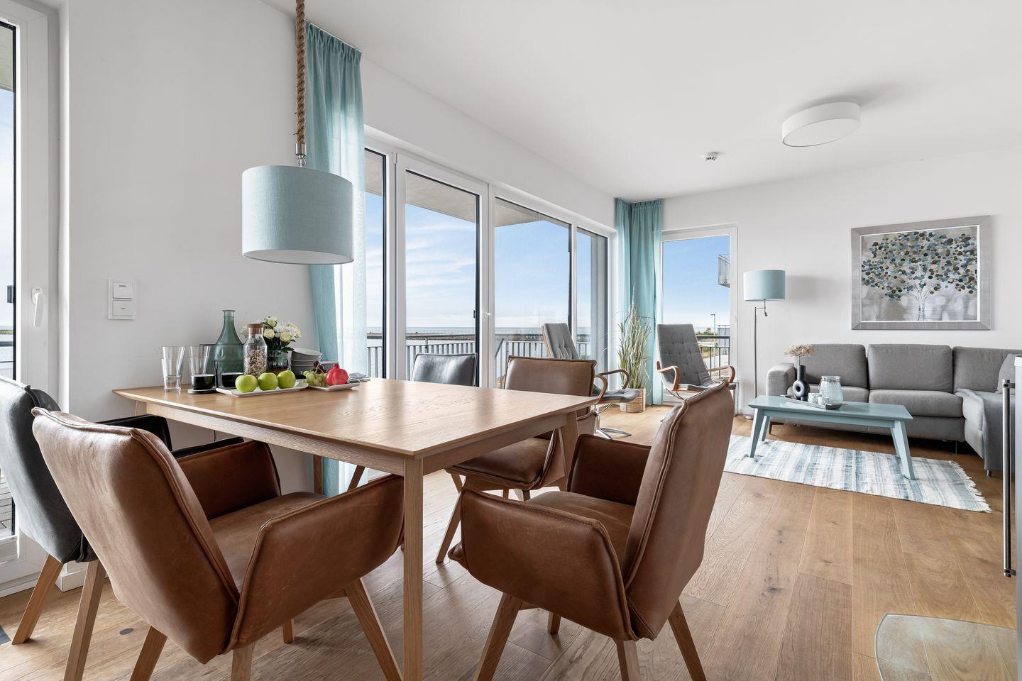 Durch die bodentiefe Fensterfront dringt viel Licht in die Wohnung und bietet vom Wohn-, als auch vom Essbereich einen unvergleichlichen Blick auf die Wasserkulisse von Schlei und Ostsee.