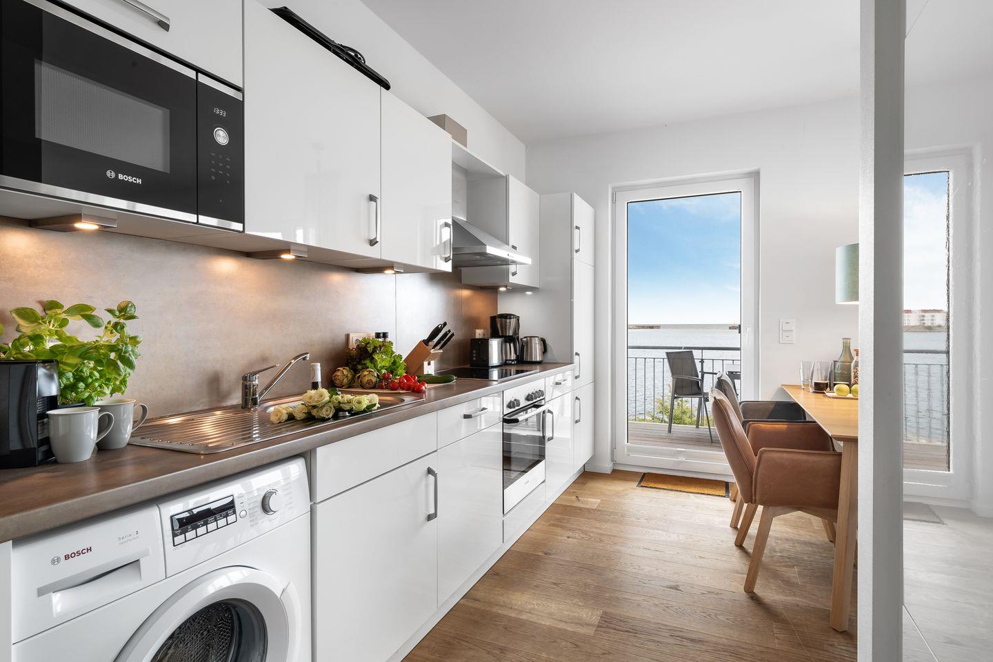 Die moderne Einbauküche bietet alles, was das Herz eines Hobbykochs begehrt. Die dort zubereiteten Mahlzeiten können anschließend entweder am direkt angrenzenden Esstisch oder, je nach Wetterlage, auf dem großzügigen Balkon verspeist werden. Ein Elektro-Grill steht den Gästen zur freien Verfügung.