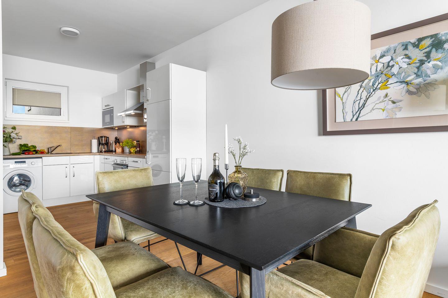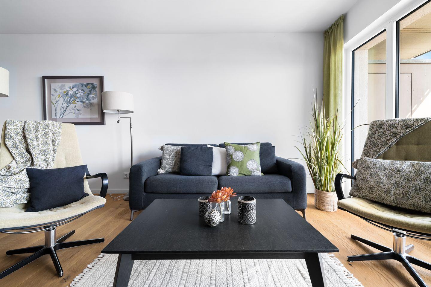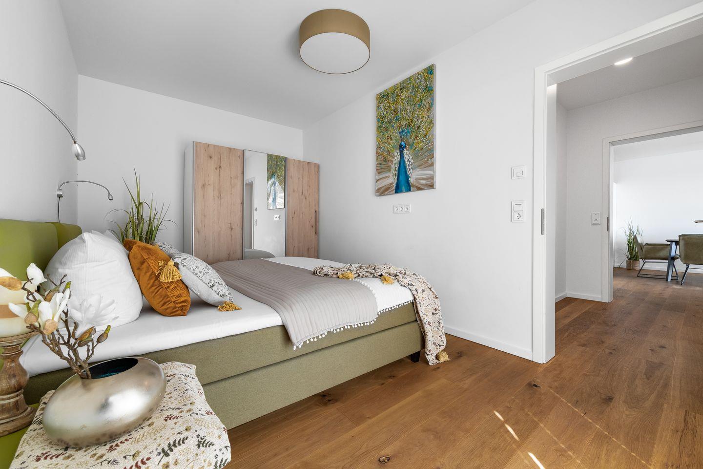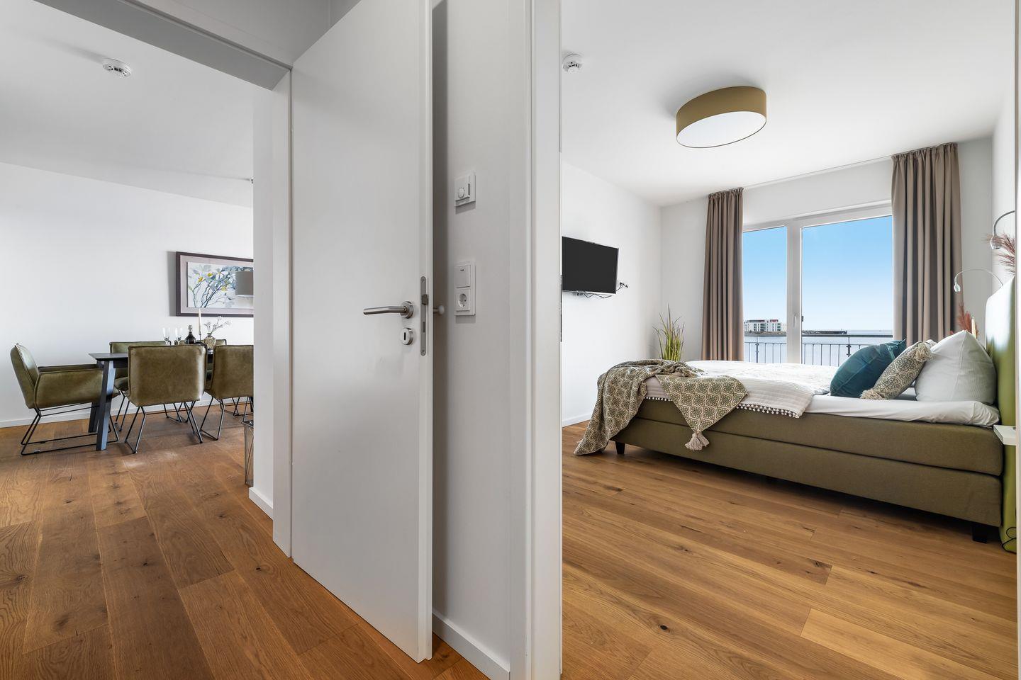 Die zwei Schlafzimmer leuchten in einem hellen Grünton und verfügen über große, gemütliche Boxspringbetten, Kleiderschränke und bodentiefe Fenster. Aufwachen mit Meerblick, was gibt es Schöneres?