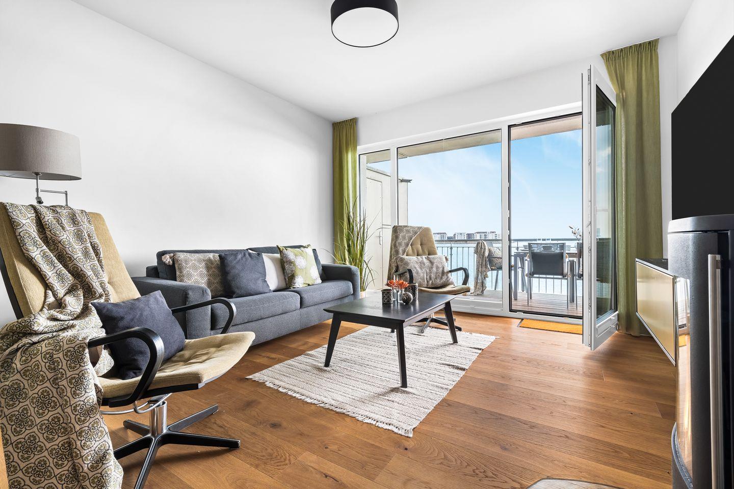 Der hochwertig möblierte Wohnbereich des "Ocean Water" besticht durch die Panoramafront mit direktem Blick ins Blaue. Auch an Tagen, an denen die Ostsee tobt, sorgt ein Kaminofen und ein Flatscreen für Urlaubsgemütlichkeit. Der Wohnbereich erstreckt sich direkt in den voll ausgestatteten Koch- und Essbereich, hier wird jeder Hobby-Koch glücklich. Der offen gestaltete Raum ermöglicht ein herrliches Beisammensein, beim Kochen und Entspannen.