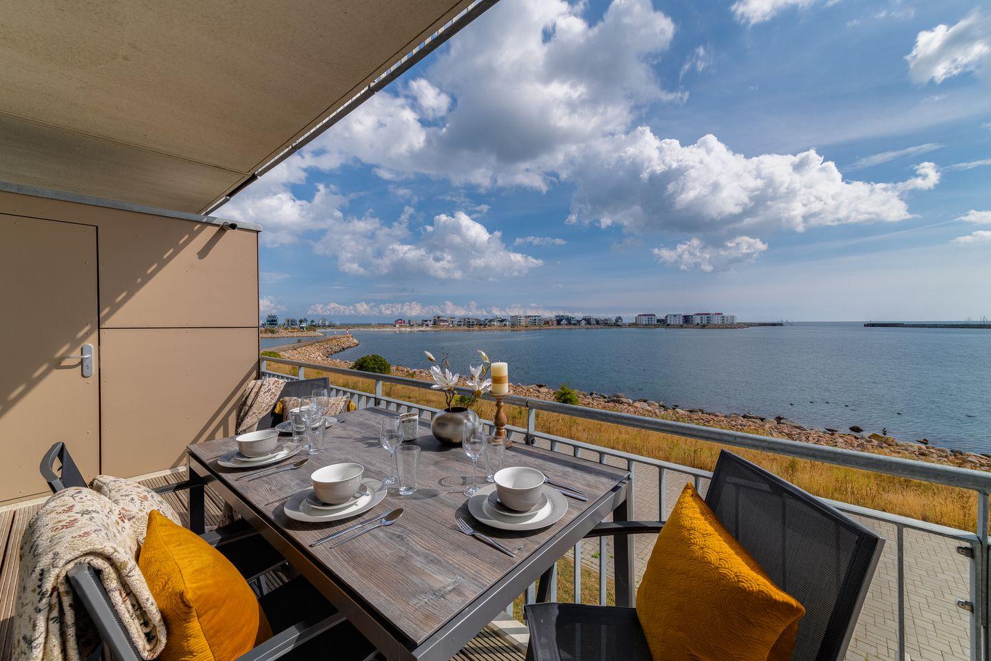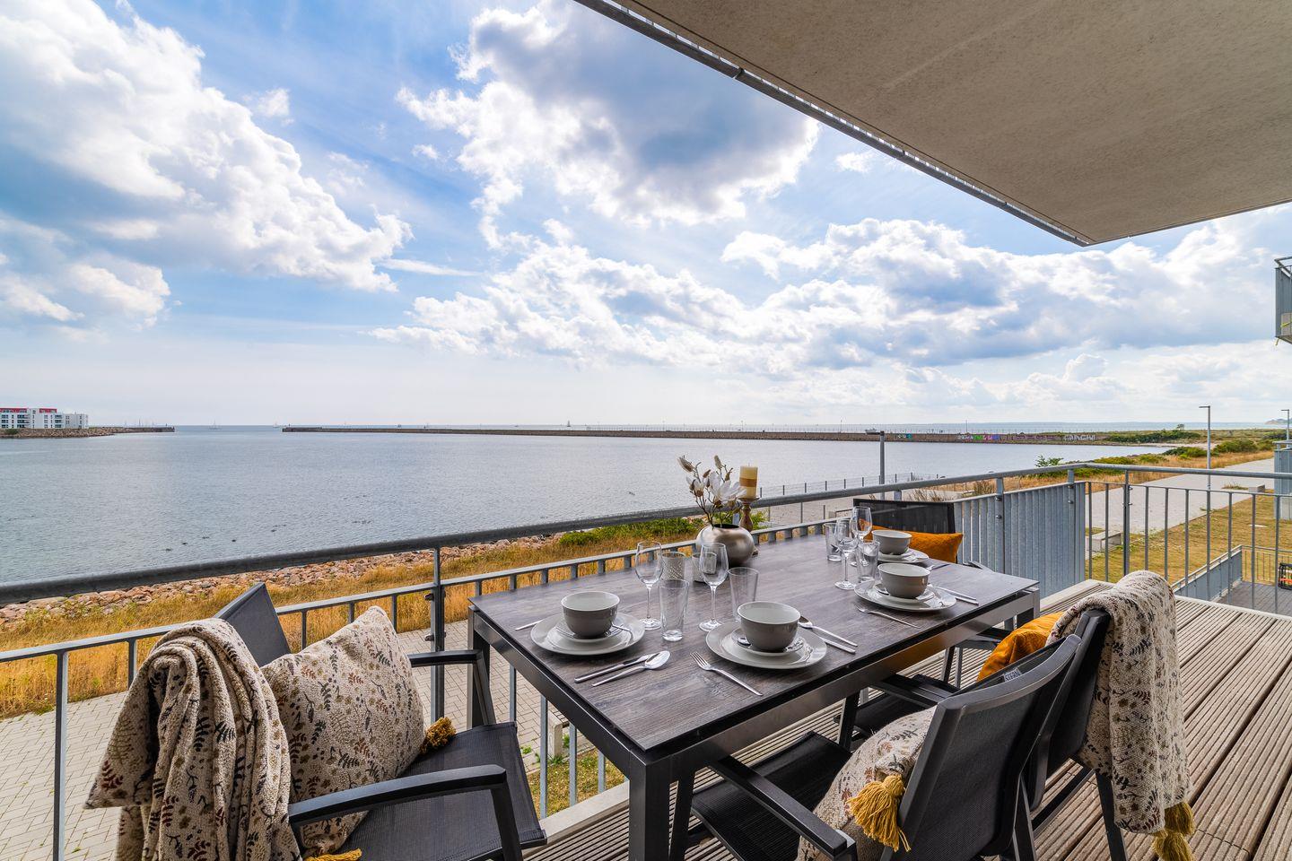 Der traumhafte Balkon bietet einen weiten Blick auf das Hafenkino und die vorbeiziehenden Segelschiffe. Eine hochwertige Sitzgarnitur sowie Sonnenliegen stehen bereit um erholsame Sonnenstunden zu genießen.