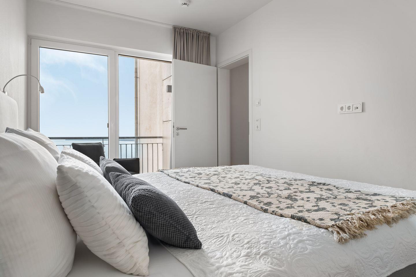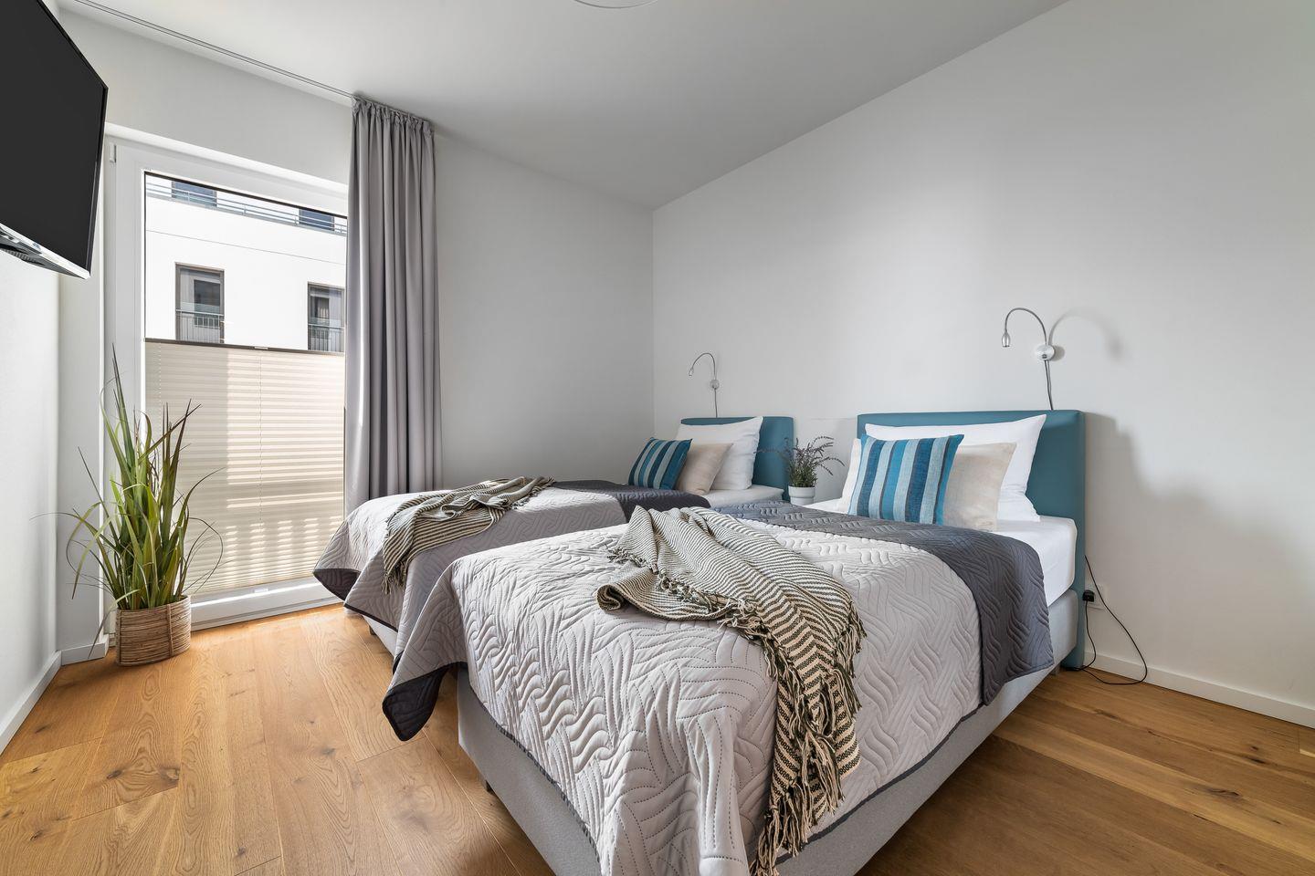 Die drei Schlafzimmer bieten Platz für sechs Personen und verfügen alle über hochwertige Boxspringbetten und bodentiefe Fenster, die sich mit Gardinen abdunkeln lassen. Eins der drei Schlafzimmer hält außerdem einen Flatscreen für Entertainment bereit.