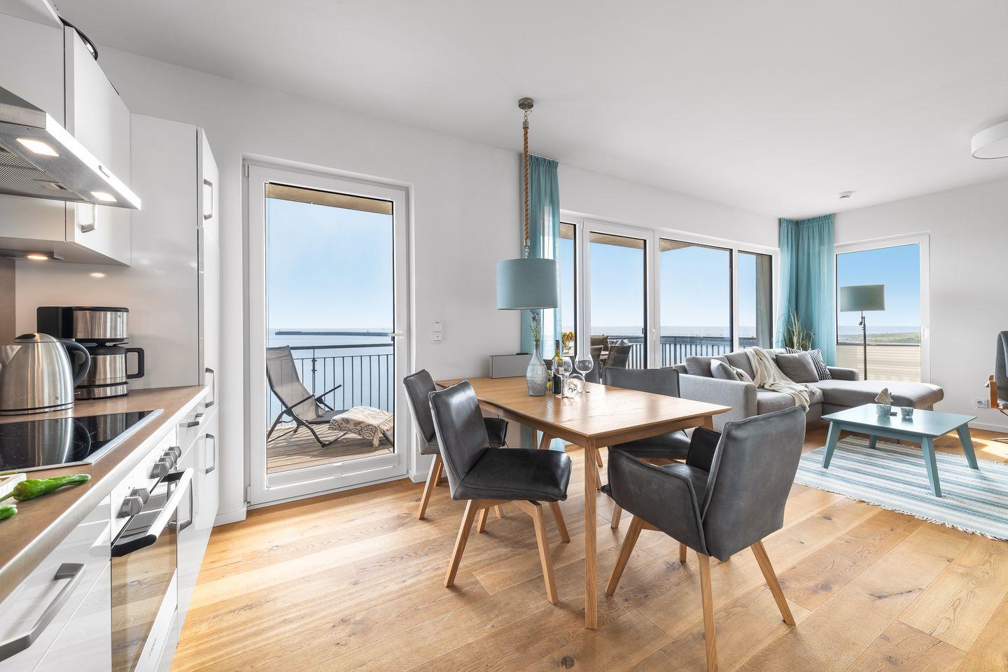 Die offene, moderne Einbauküche bietet alles, was das Hobbykoch-Herz begehrt! Die frisch zubereiteten Köstlichkeiten können im Anschluss mit herrlichem Meerblick am direkt angrenzenden Esstisch oder auf dem großzügigen Balkon verspeist werden. Außerdem bietet der Balkon den perfekten Ort für ein herrliches Sonnenbad. Hier ist Urlaubsstimmung vorprogrammiert!