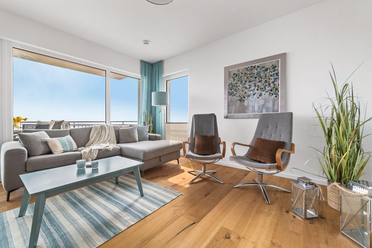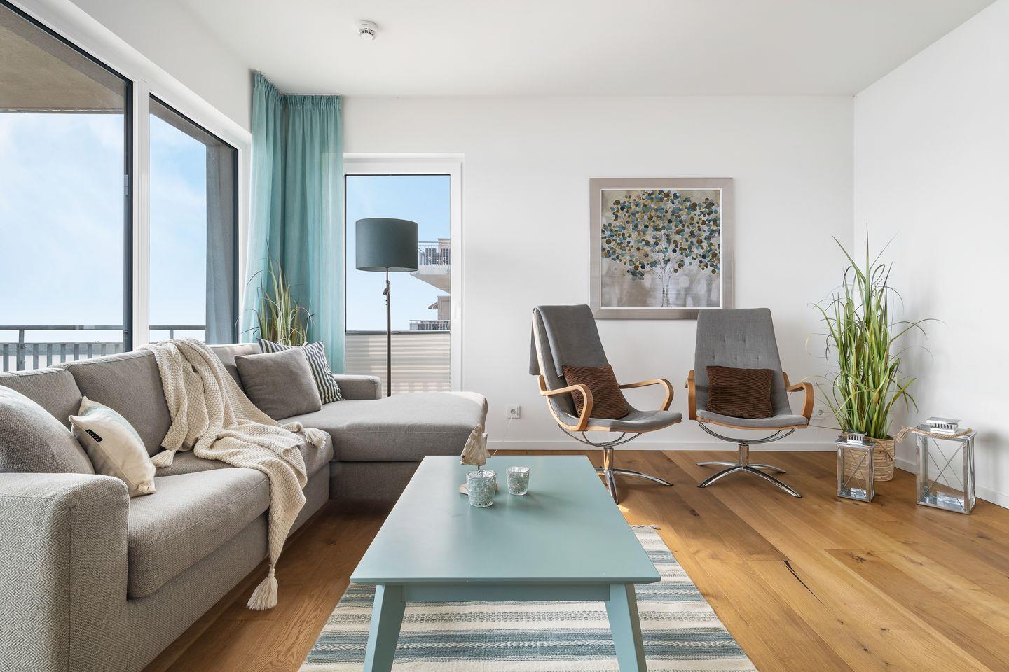 Das elegant maritim eingerichtete Apartment "Ocean Lodge2" besticht besonders durch den traumhaft freien Blick auf die Ostsee. Durch die verglaste Front des Koch- und Wohnbereichs fällt der Blick immer ins Blaue, während man es sich auf den bequemen Sitzmöbeln gemütlich macht. Ein Kamin trägt, besonders in der kalten Jahreszeit, zur wohligen Stimmung bei. Mit einem Glas Wein in der Hand vor knisterndem Kaminfeuer, während draußen die Ostsee tobt - was gibt es Schöneres?