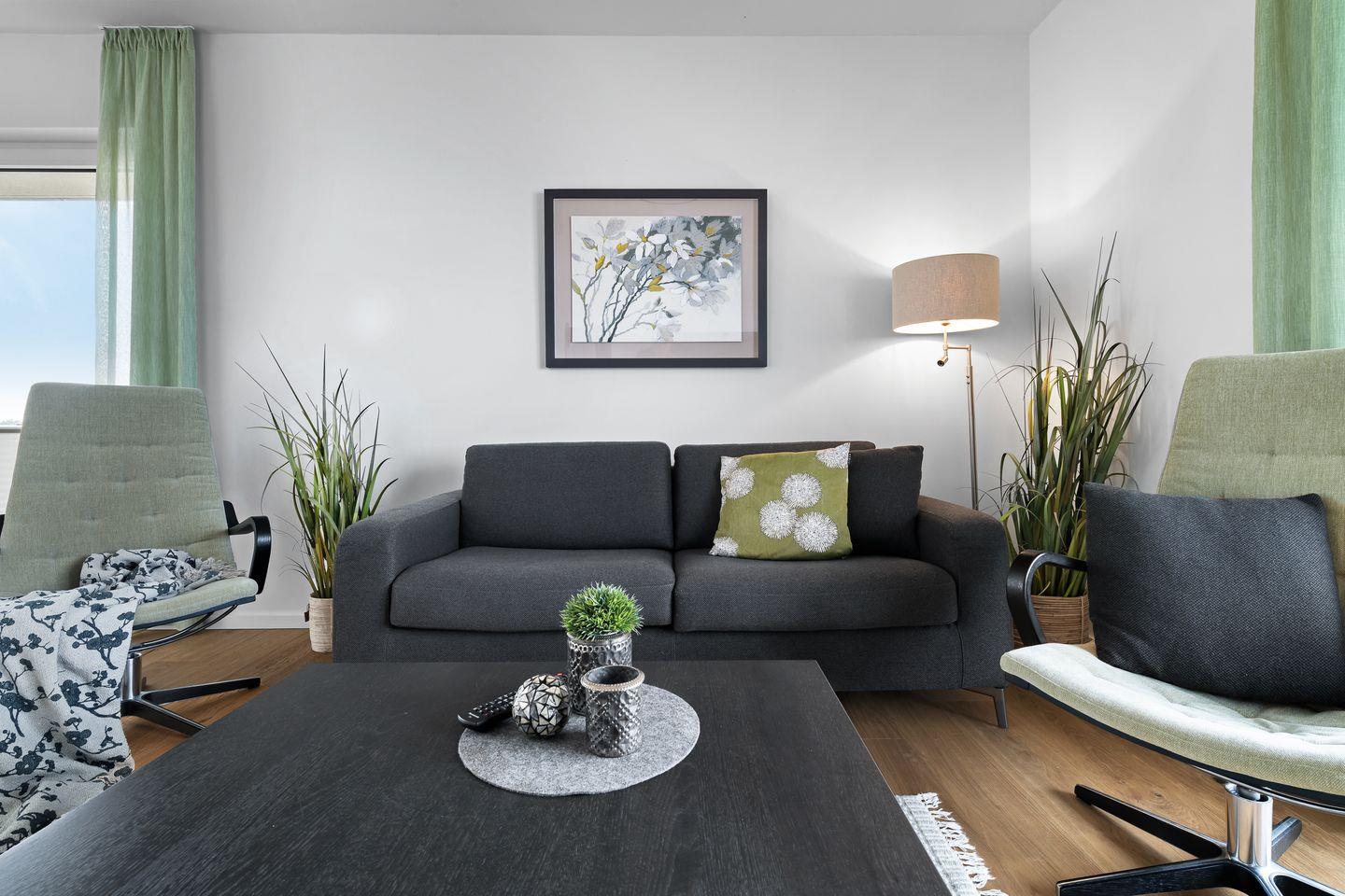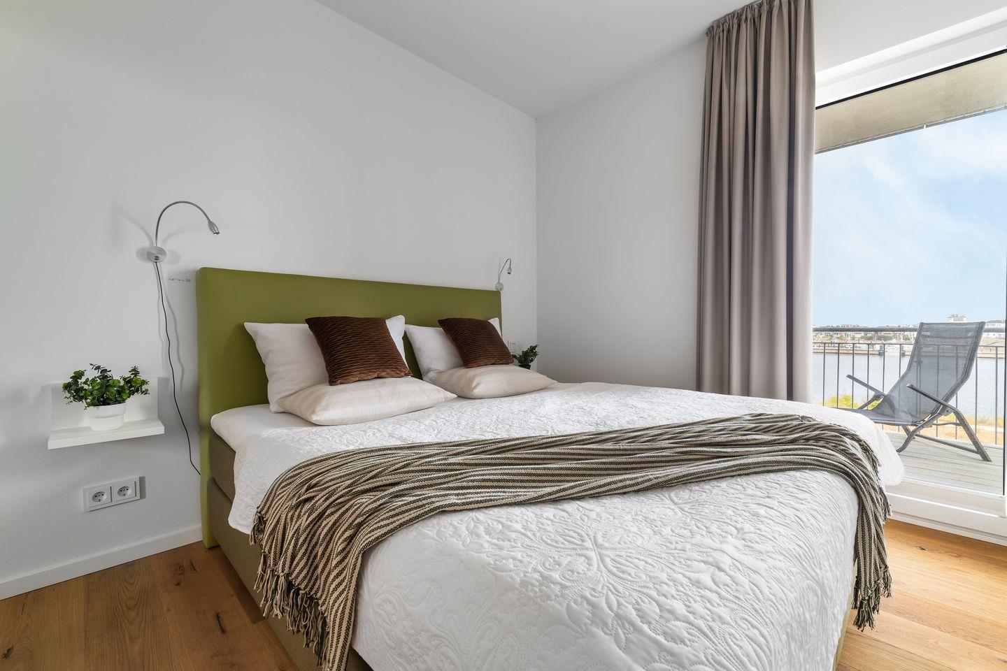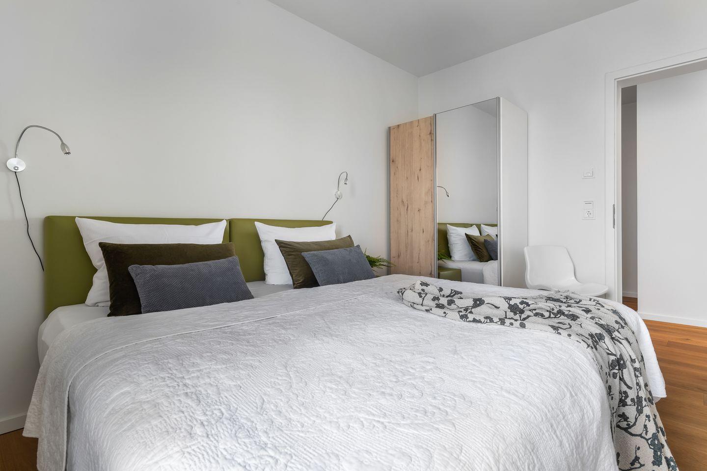 Die Schlafzimmer erwarten unsere Gäste in gemütlichen Grün- und Erdtönen. Sie verfügen über großzügige Boxspringbetten und bodentiefe Fenster, die sich durch Gardinen verdunkeln lassen. Eines der Schlafzimmer besitzt außerdem einen Smart-TV.