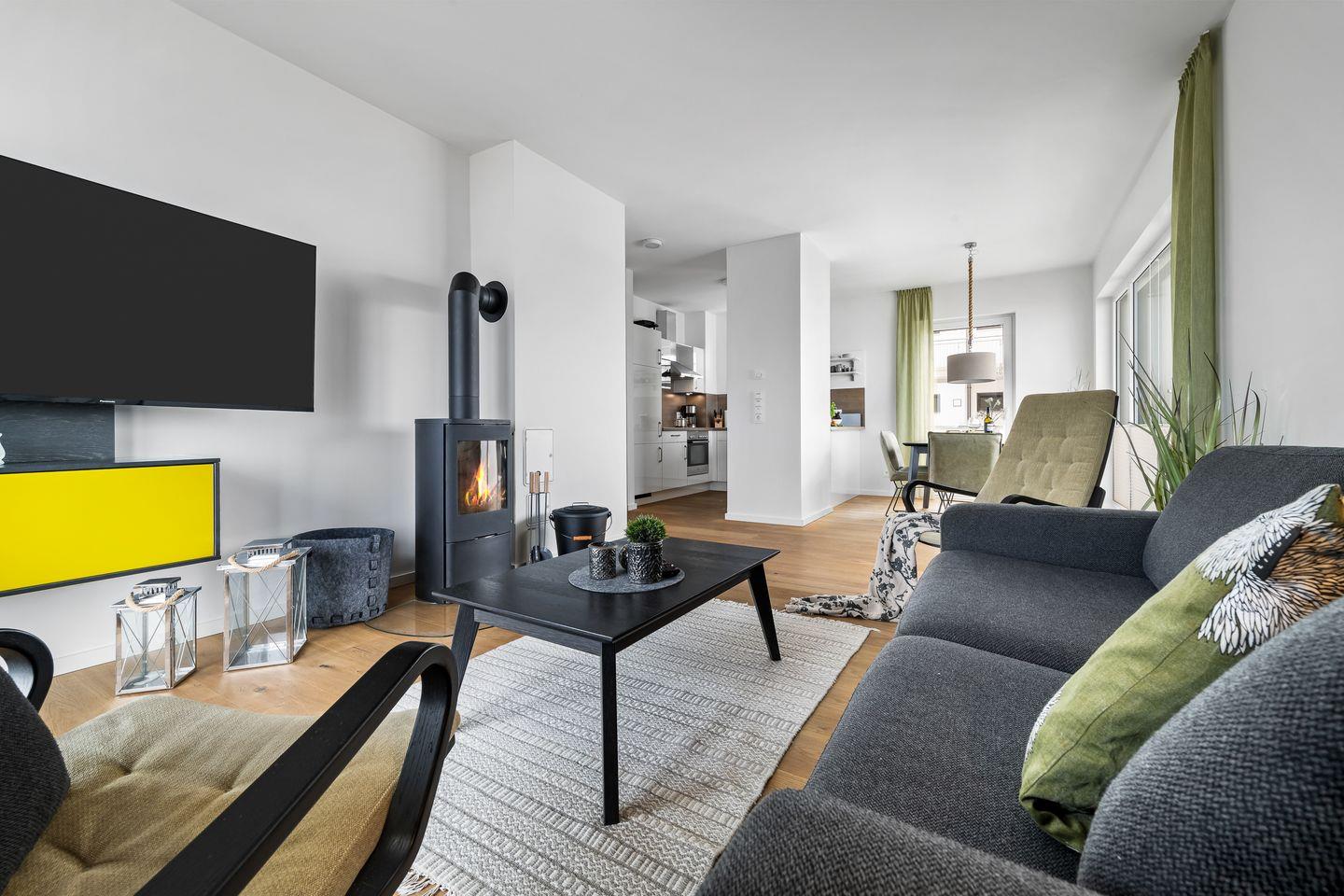 Im hellen Wohnbereich erwartet unsere Gäste bequeme Sitzmöbel, ein Kaminofen sowie ein Flatscreen für gemütliche Filmabende. Ein Glas Rotwein zu knisterndem Kaminfeuer, was gibt es Schöneres. Durch die Panoramafront hat man einen traumhaften Blick auf das Hafenkino.