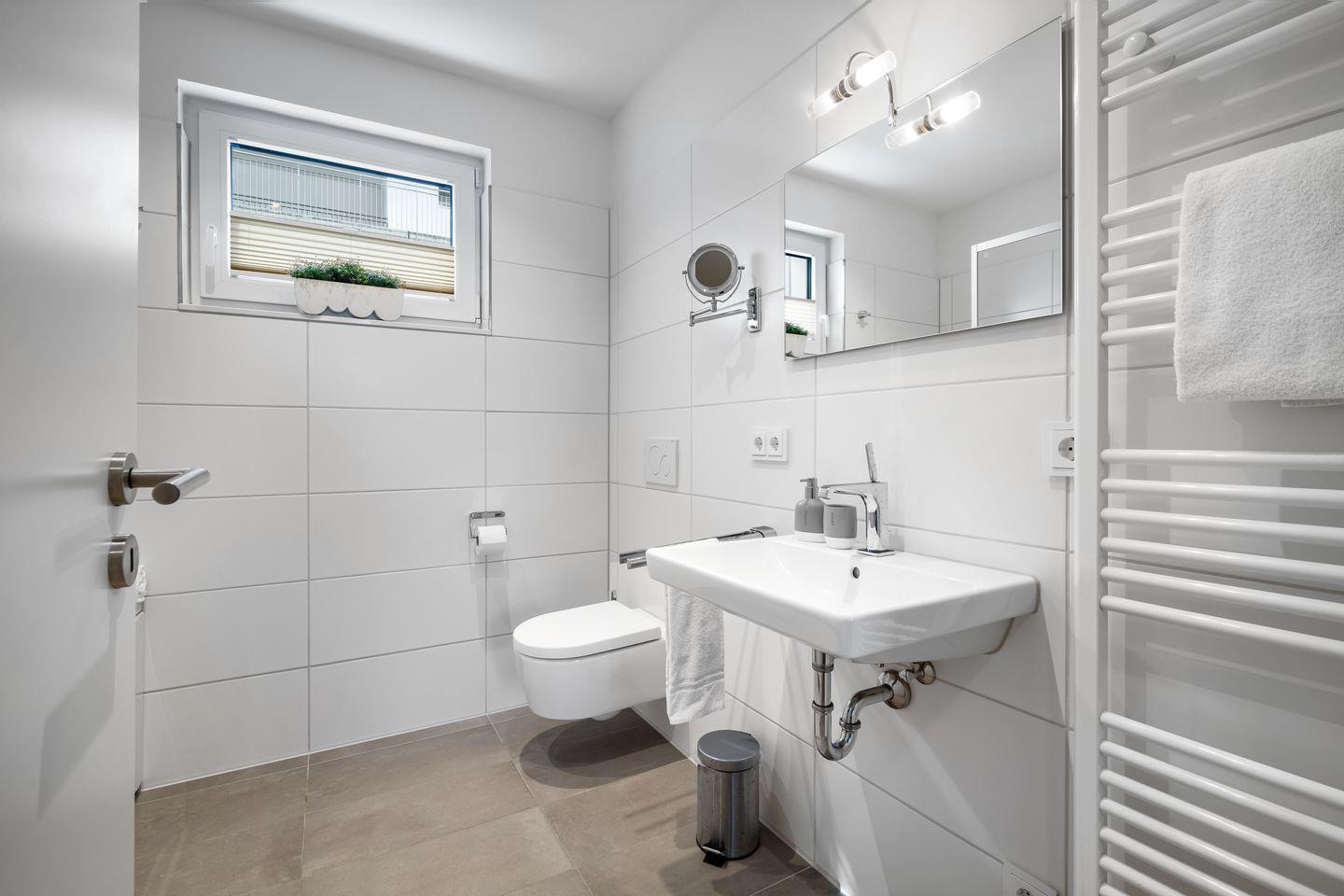 Das moderne Badezimmer hat sowohl Fußbodenheizung, als auch eine Whirlbadewanne - hier wird die Urlaubsentspannung perfekt!
