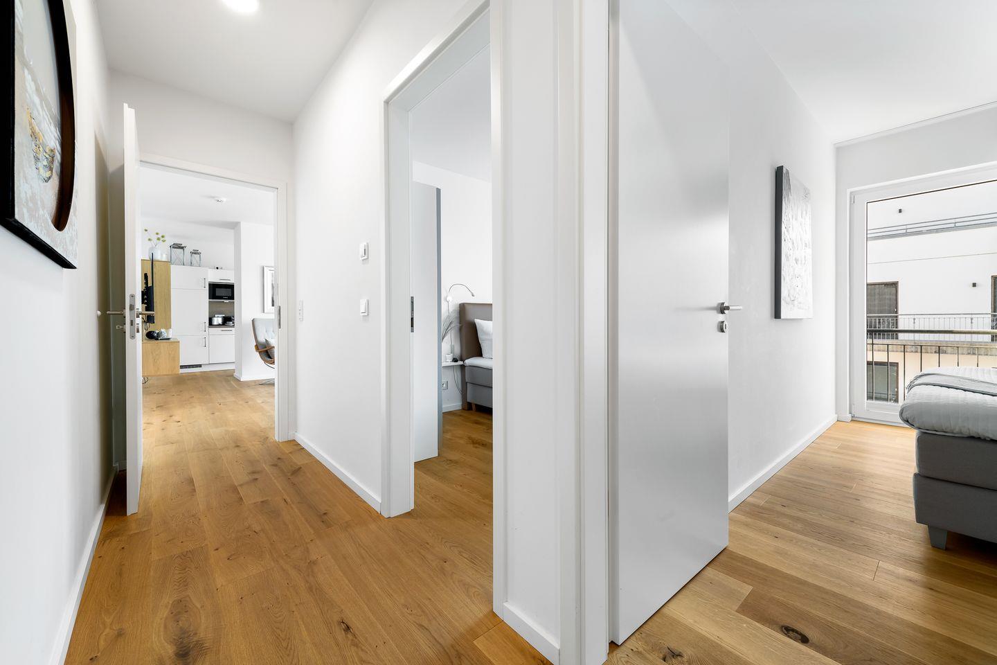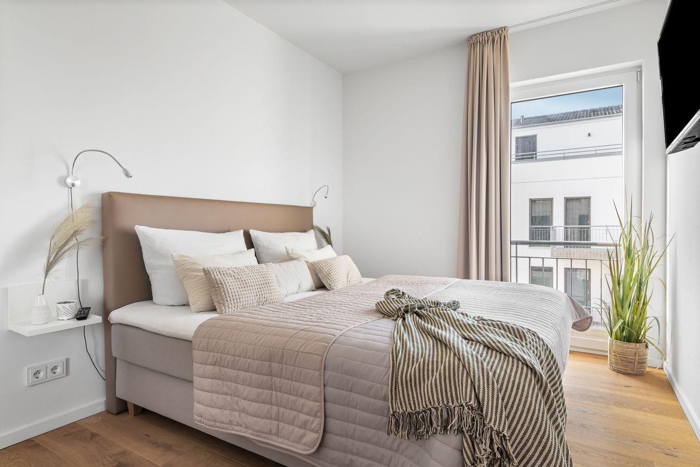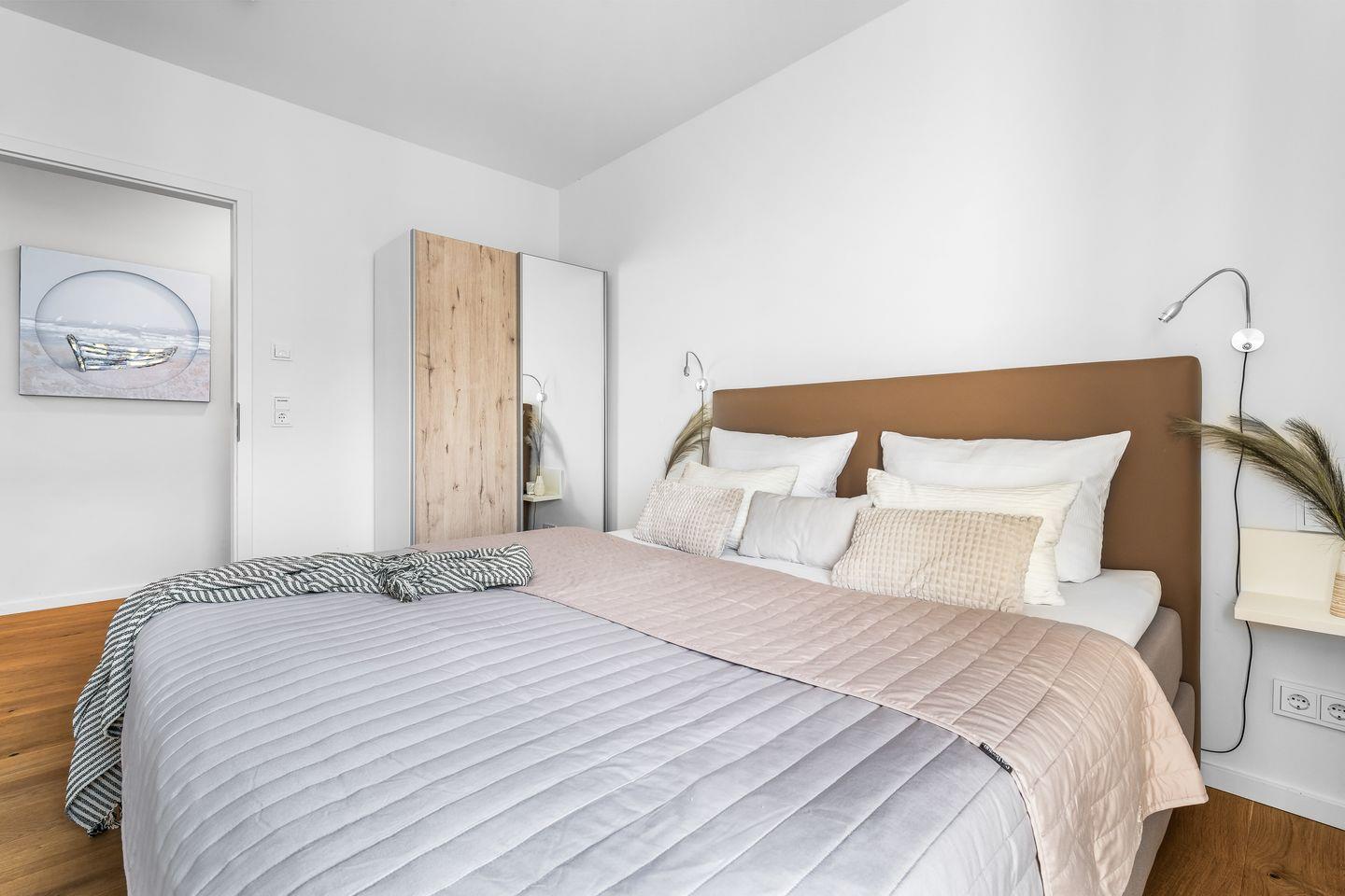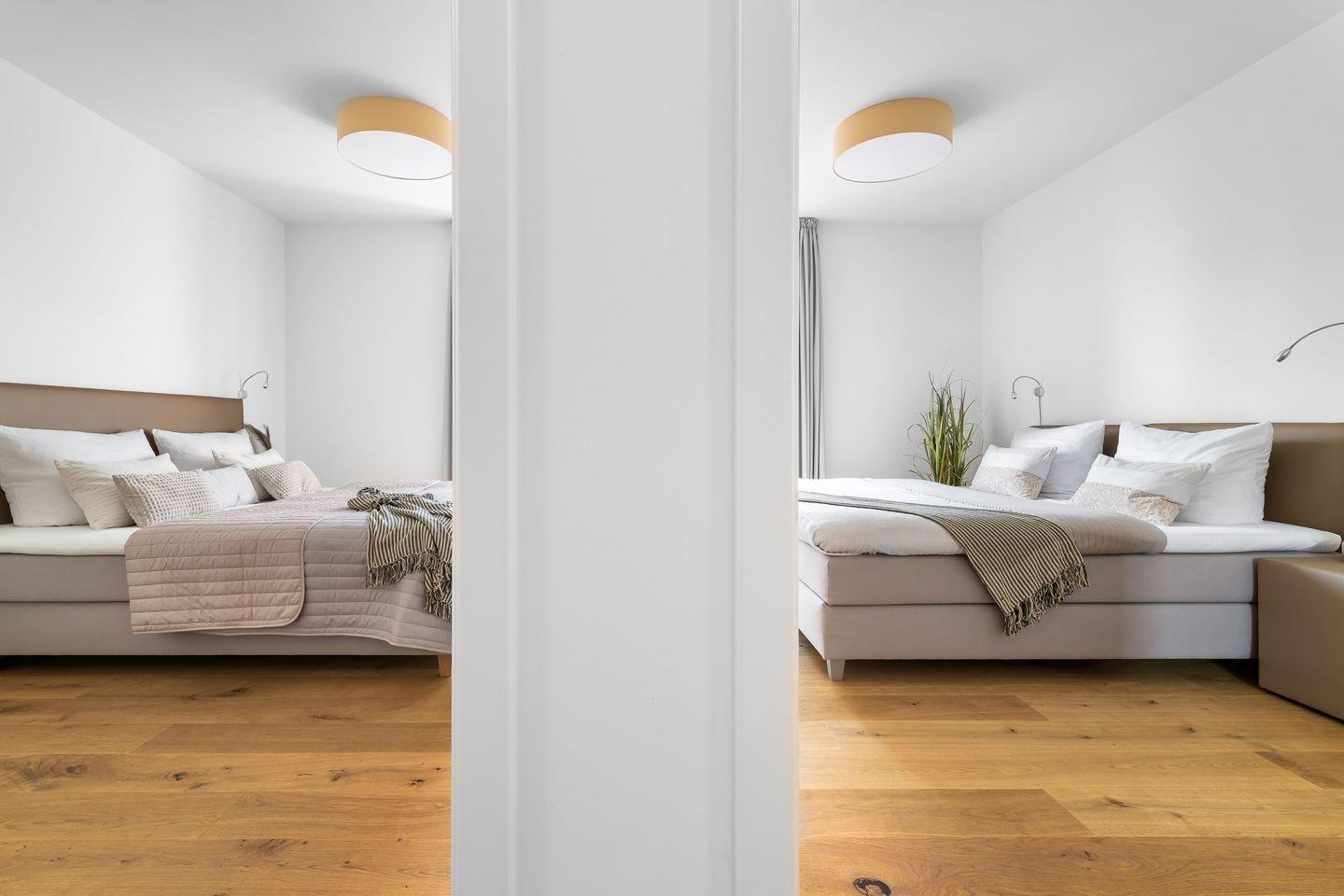 Die zwei Schlafzimmer verfügen über bequeme Boxspringbetten und hochwertige Kleiderschränke, in einem der beiden befindet sich ebenfalls ein Smart-TV.