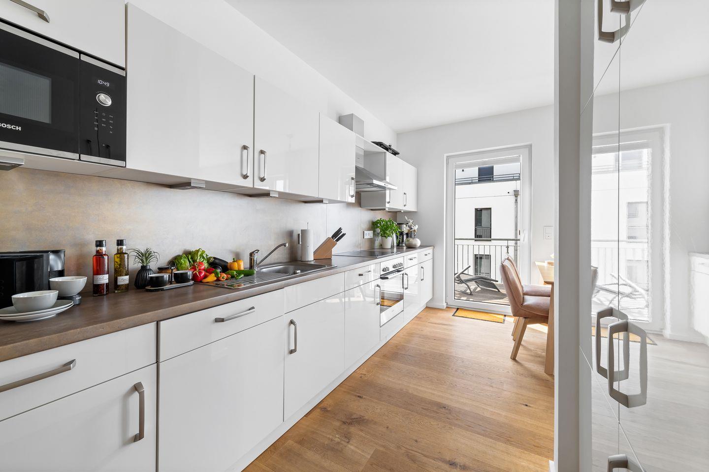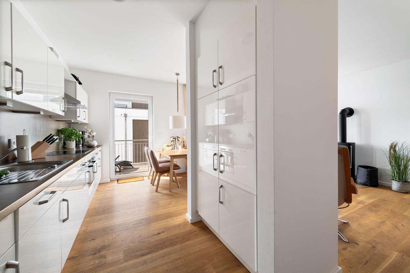 Die helle Einbauküche ist voll ausgestattet und lässt für Hobby-Köche keine Wünsche offen. Ob frischer Fisch vom Kappelner Fischmarkt oder regionalen Produkten von Biobente, hier lassen sich herrliche Mahlzeiten zubereiten. Durch den offenen Koch- und Wohnbereich lässt sich das Kochen und Beisammensein perfekt vereinbaren.