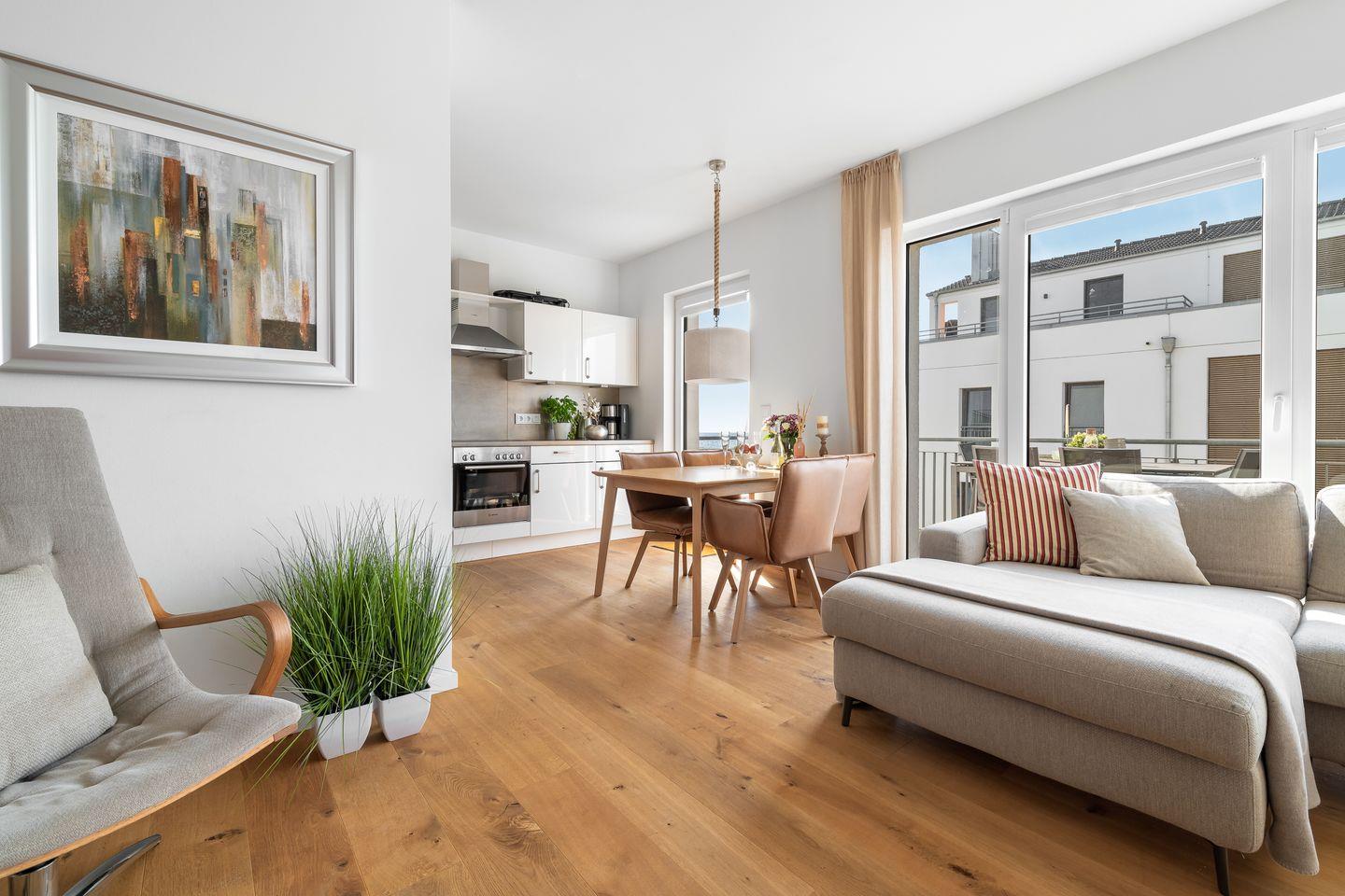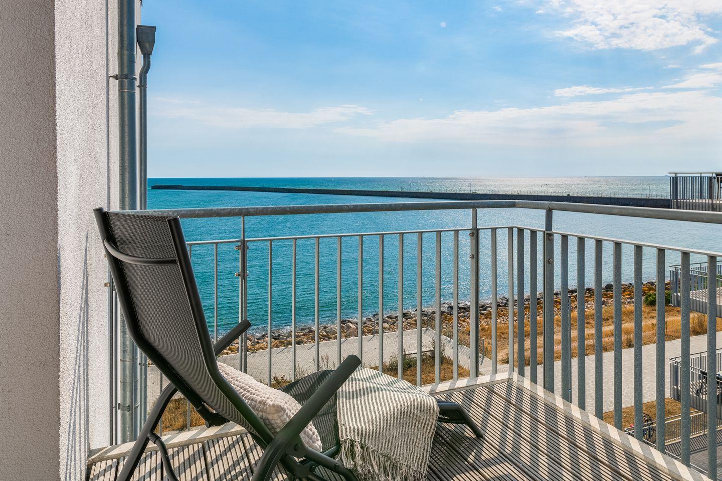 Vom lichtdurchfluteten Wohnbereich aus gelangt man direkt auf den Balkon, der einen herrlichen Blick auf die Ostsee bietet. Ob Sonnenbad oder eine ausgiebige Grillerei, hier ist Urlaubsflair garantiert!