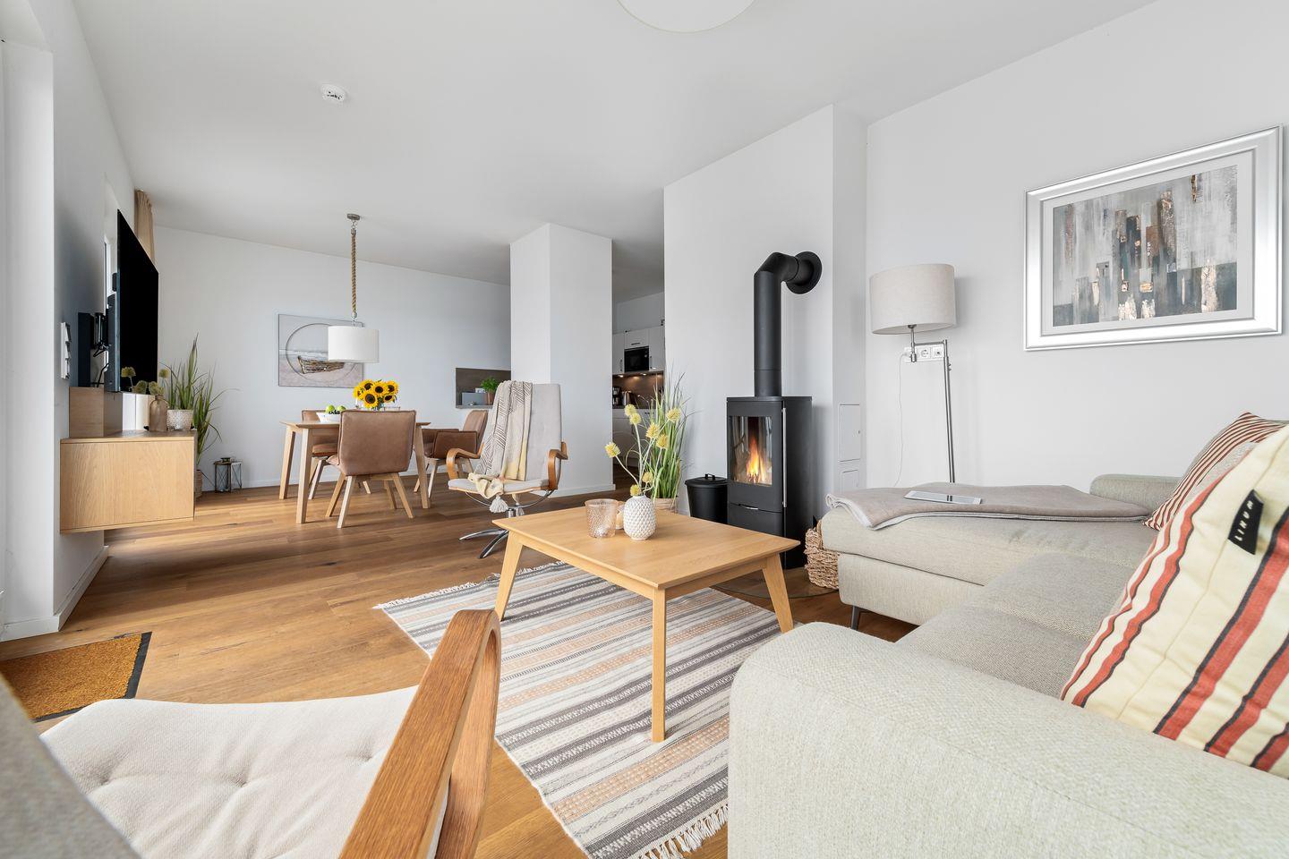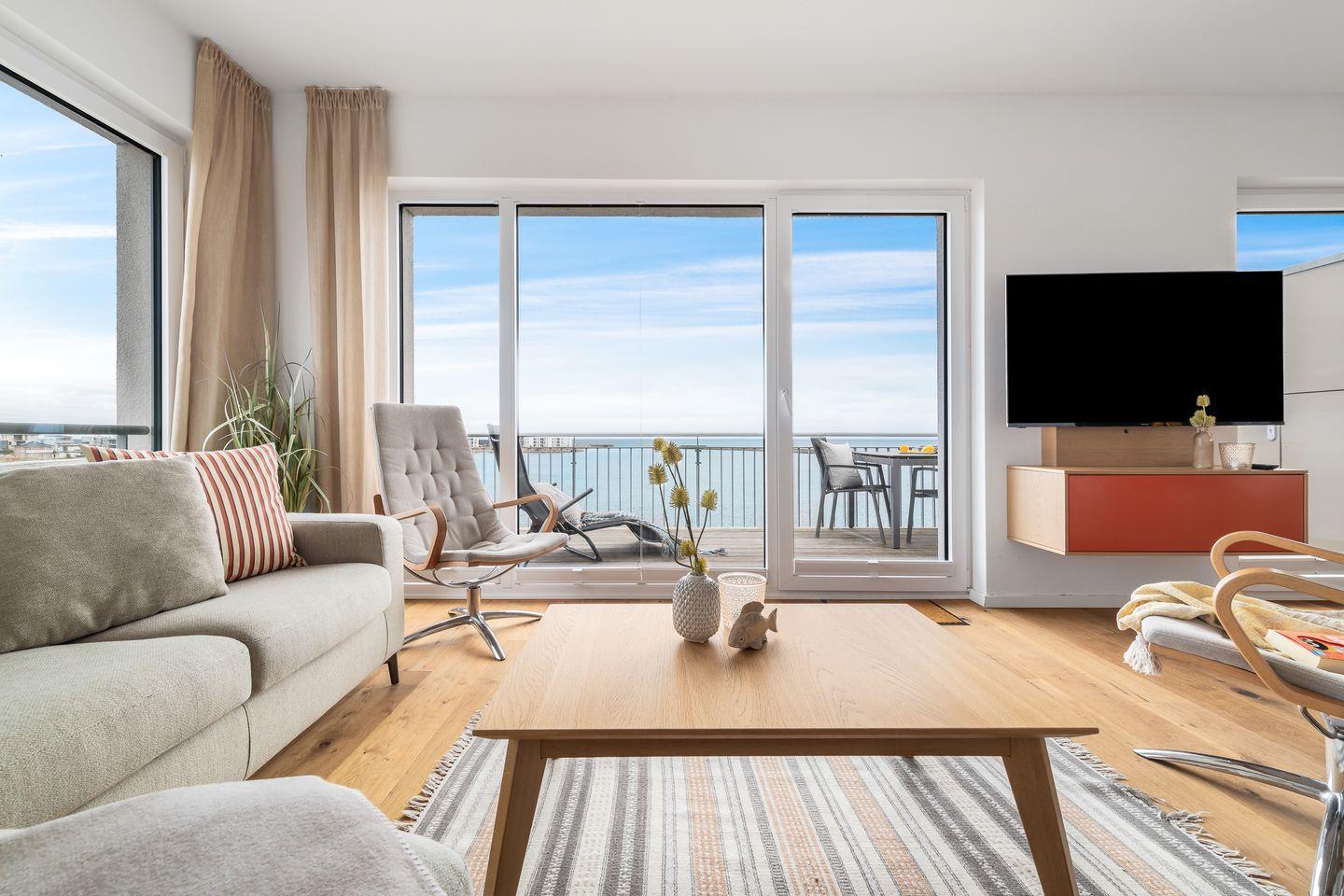 Der nordisch helle Wohnbereich lädt mit einer bequemen Sofalandschaft zu entspannten Stunden vor herrlichem Kaminfeuer ein. Für Entertainment sorgt hier ein großer Flatscreen. Die bodentiefen Panoramafenster spiegeln die unterschiedlichen Lichtverhältnisse perfekt wieder und ermöglichen zu jeder Zeit einen Blick auf die Weite des Meeres.