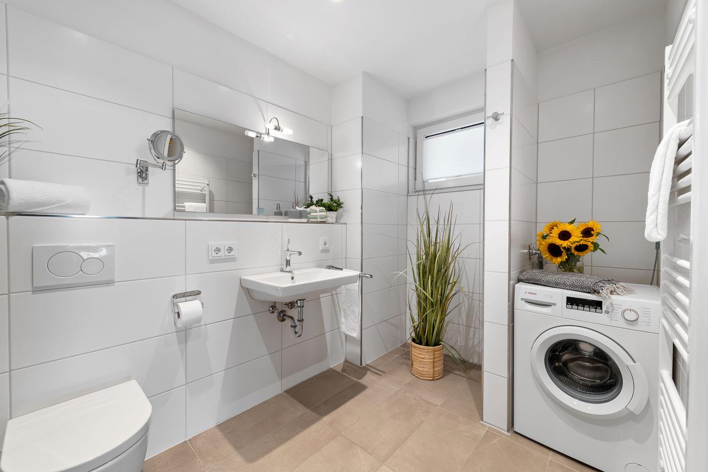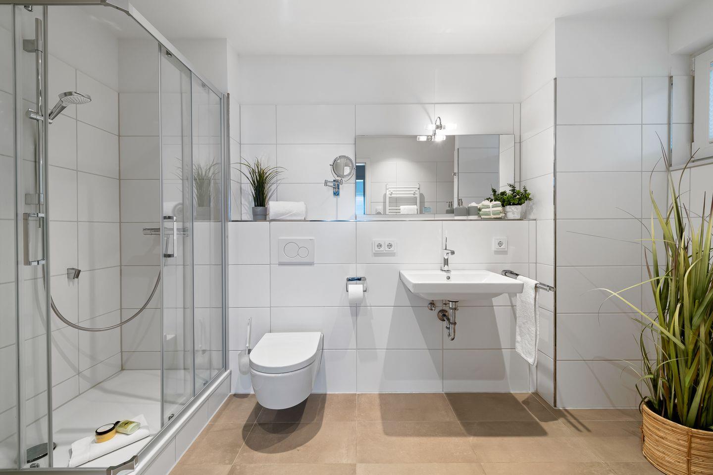 Das moderne Badezimmer verfügt über eine große Dusche und ist ein wahrer Wohlfühlort.