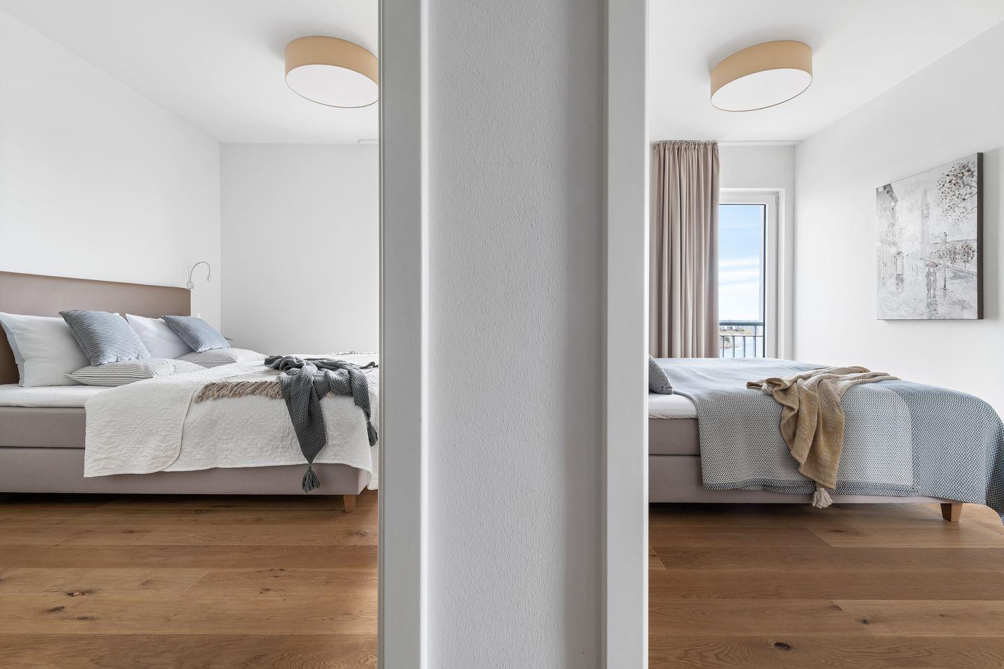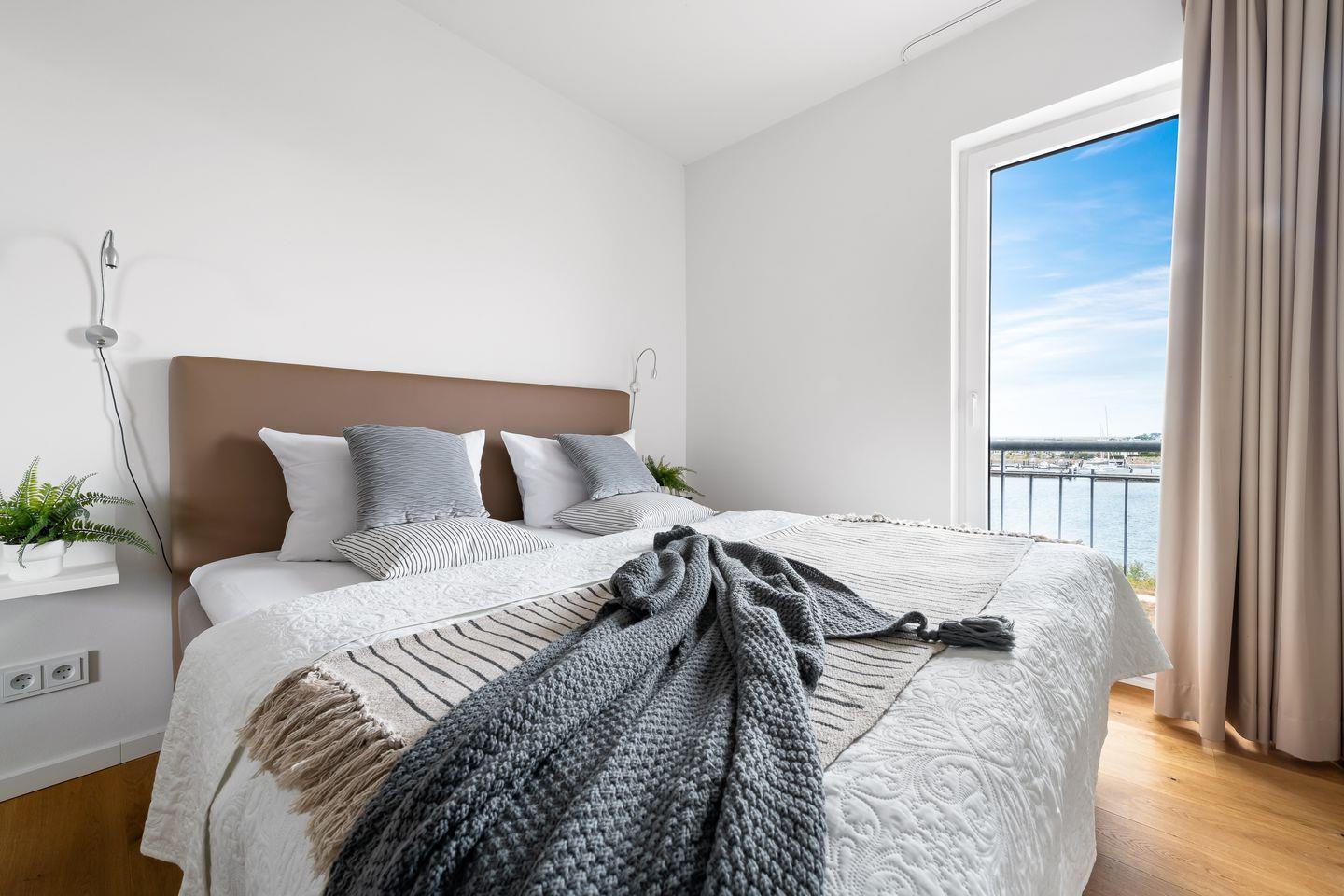 Zwei Schlafzimmer mit bodentiefen Fenstern, die sich durch Gardinen abdunkeln lassen, und bequemen Boxspringbetten garantieren geruhsame Nächte. Von hier aus haben unsere Gäste ebenfalls einen schönen Blick auf das Hafenkino.