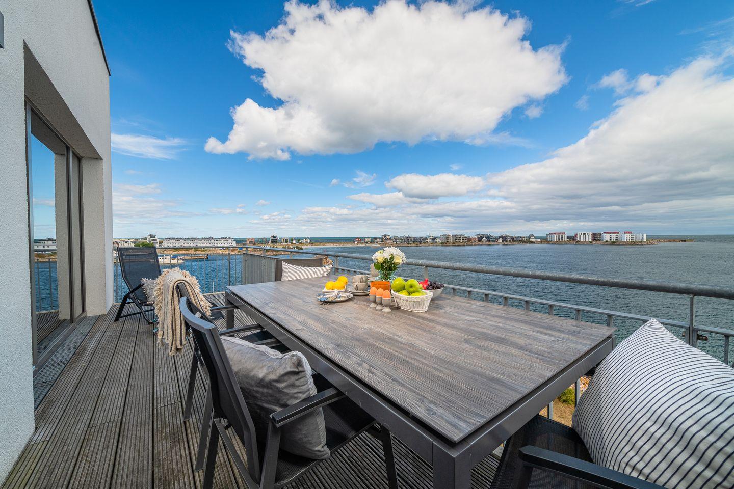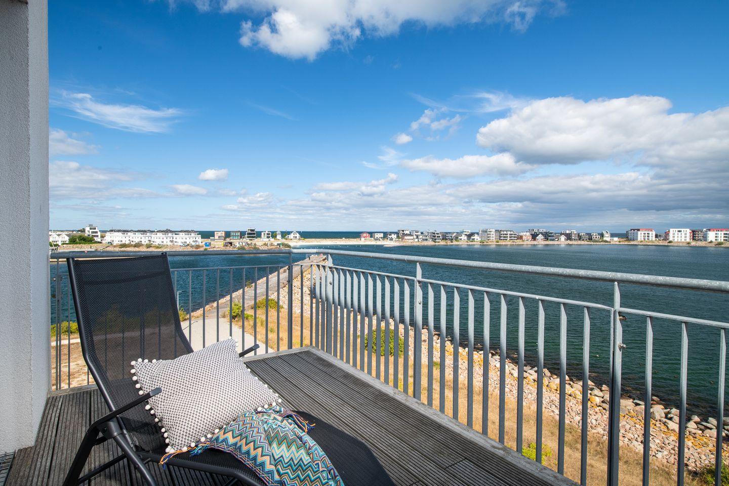 Der traumhafte Balkon bietet einen weiten Blick auf das Hafenkino und die vorbeiziehenden Segelschiffe. Eine hochwertige Sitzgarnitur sowie Sonnenliegen stehen bereit um erholsame Sonnenstunden zu genießen.