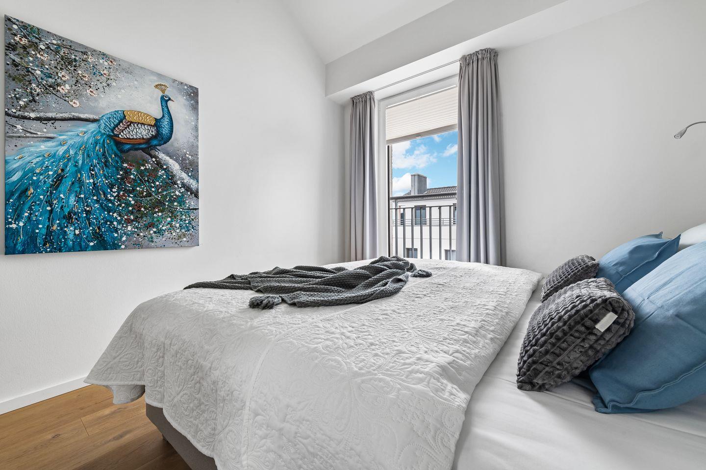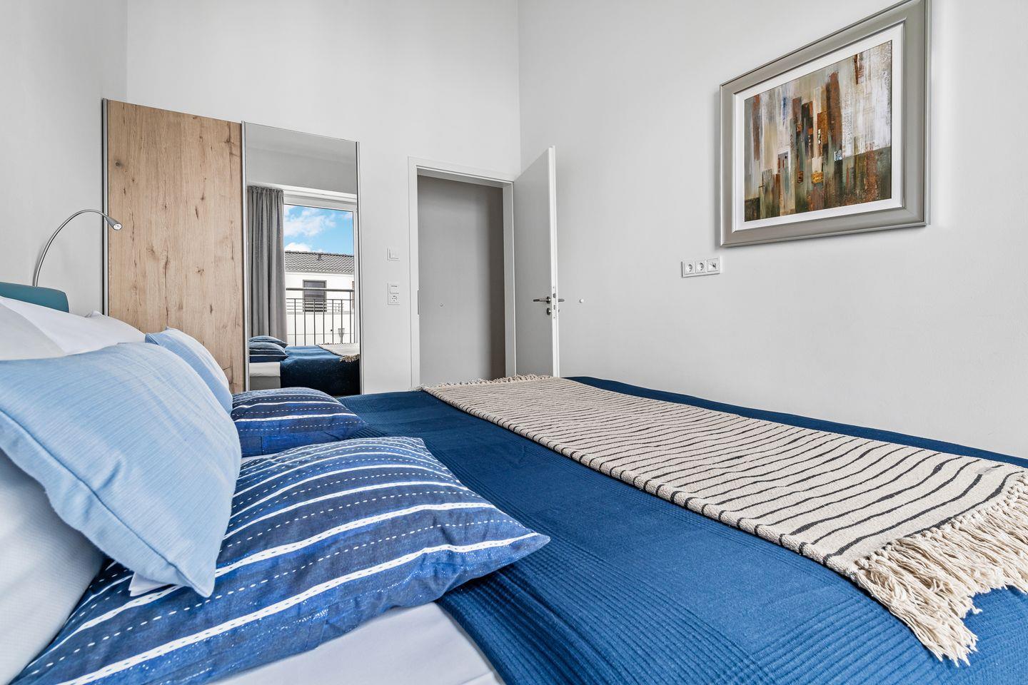 Drei Schlafzimmer mit bodentiefen Fenstern, welche sich durch Gardinen abdunkeln lassen, und bequemen Boxspringbetten versprechen geruhsame Nächte. Eines der Schlafzimmer ist mit einem Flatscreen ausgestattet.