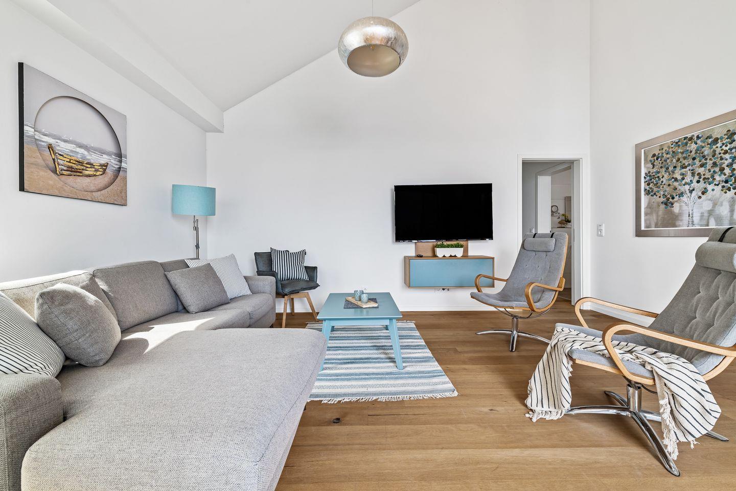 Ein wahrer Wohlfühlort ist der offene, stilvoll eingerichtete Wohnbereich mit Panoramafront. Diese bietet zu jeder Jahreszeit einen atemberaubenden Blick aufs Meer. Um die Gemütlichkeit perfekt zu machen, steht eine Sofalandschaft bereit. Hier kann man es sich vor knisterndem Kaminfeuer mit einem Glas Wein gemütlich machen. Für Entertainment ist mit einem großen Flatscreen gesorgt.