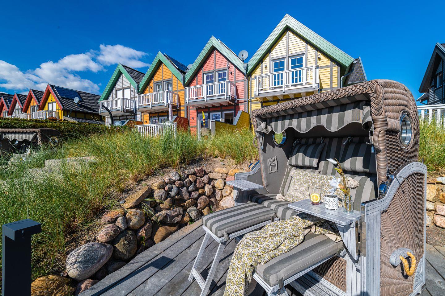 Das Ferienhaus „Hafenglück" zeichnet sich durch einen behaglichen Landhausstil aus. Der Wohn- und Essbereich im Erdgeschoss ist zur Wasserseite ausgerichtet. Bodentiefe Panoramafenster eröffnen einen weiten Blick auf den Segel- und Sportboothafen sowie die Ostsee. Das helle Wohnzimmer ist mit zwei Sofas, einem großen Smart-TV und einem Kamin ausgestattet.