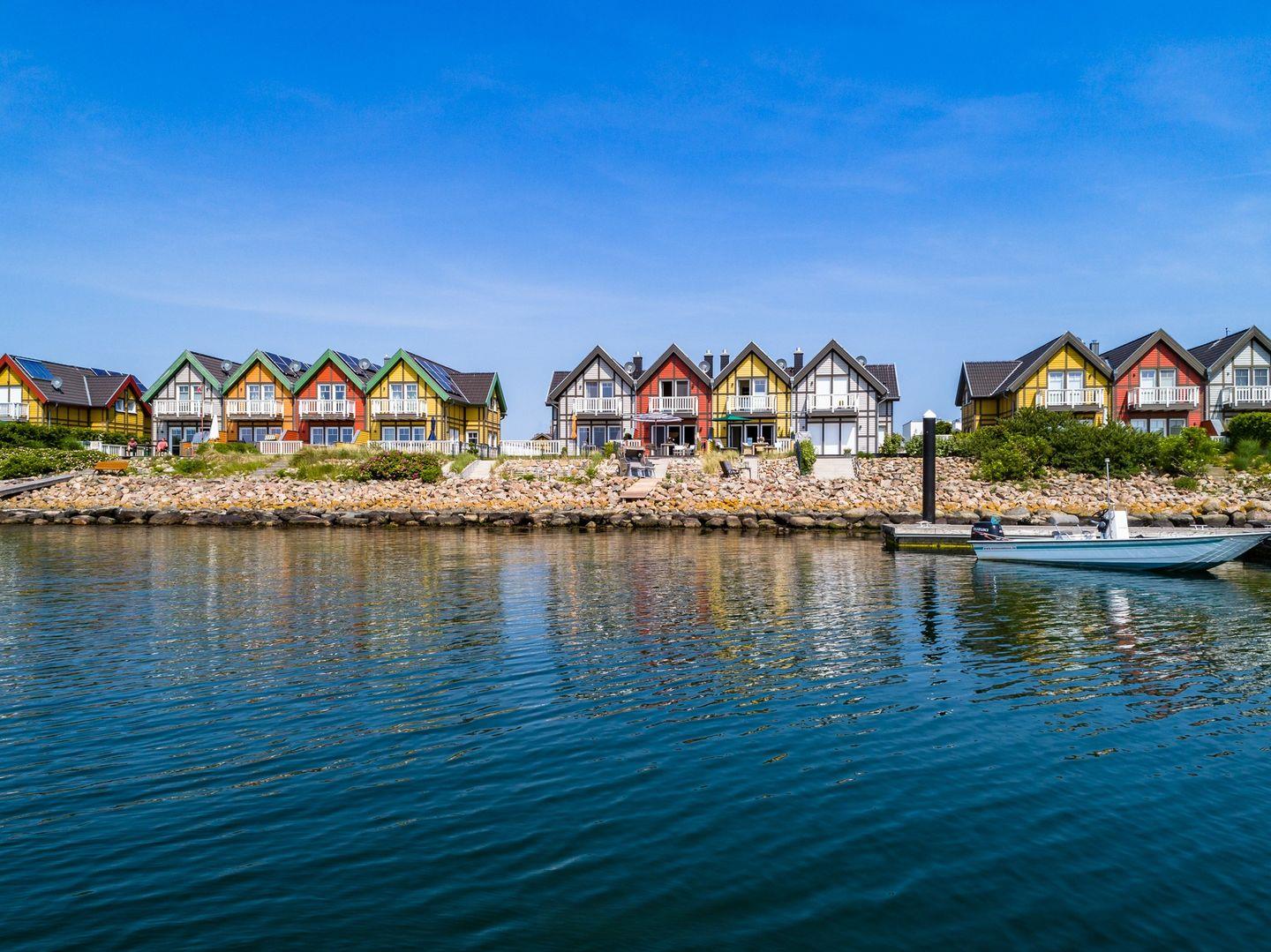 Das Ferienhaus „Hafenglück" im Ostseeresort Olpenitz bietet mit seiner sonnigen, gelben Fassade einen einladenden Anblick. Die Wohnfläche beträgt circa 130 Quadratmeter. Das Interieur ist in warmen Gelbtönen gehalten und bietet Platz für bis zu vier Personen.