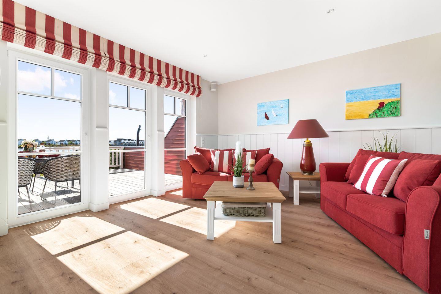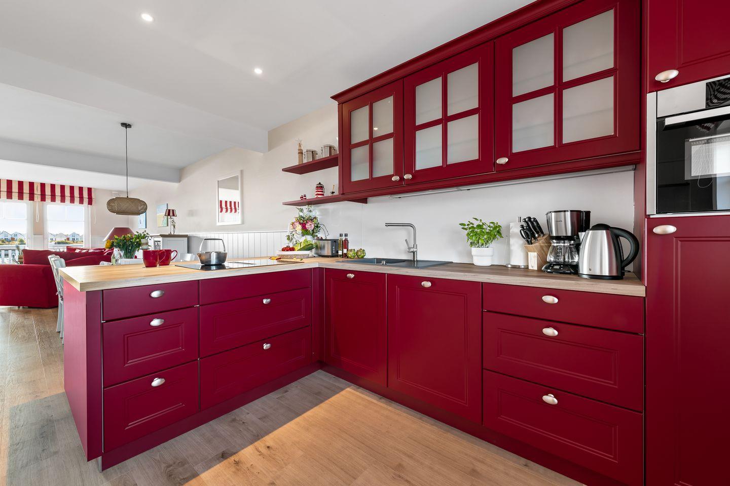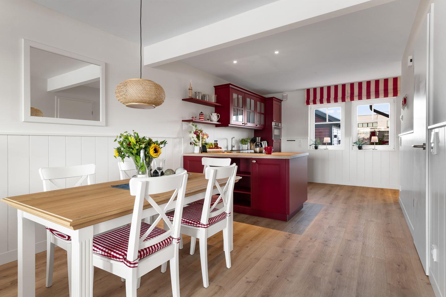„Hafenliebe" – hier ist der Name Programm. Das romantisch eingerichtete, ca. 100qm große Ferienaus, sticht schon beim Vorbeifahren mit seiner roten Fassade unter den anderen Ferienobjekten heraus. Es wird genug Platz für bis zu 4 Personen geboten und überzeugt mit seiner herzlichen, in Rot gehaltenen Inneneinrichtung.
