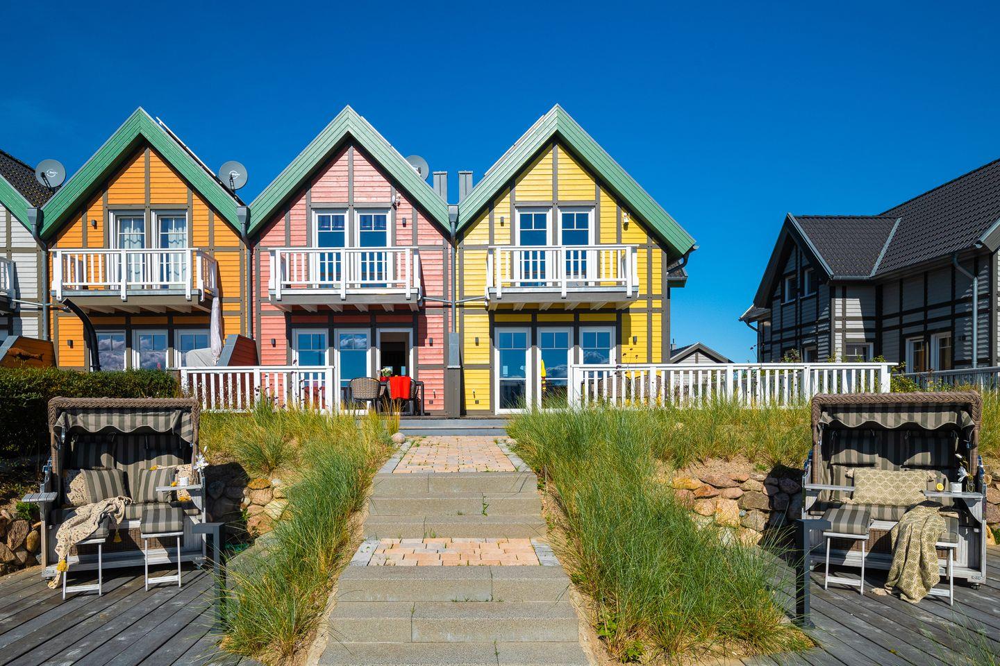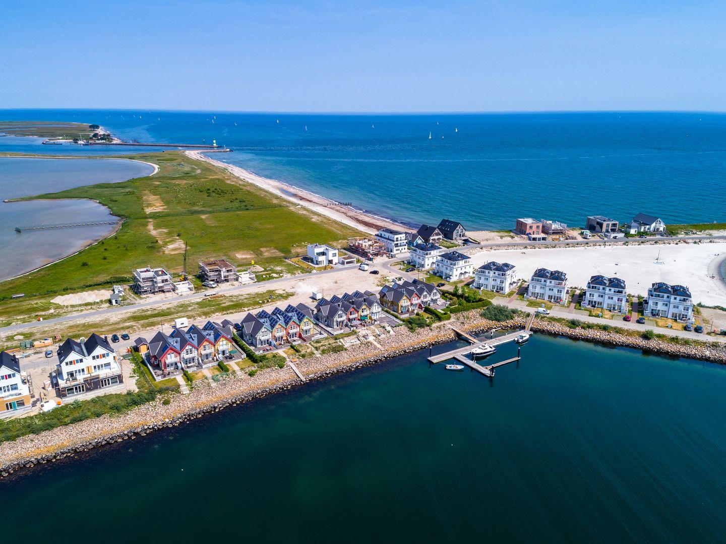 Auch die Lage des Ferienhauses "Hafenliebe" ist ideal für jeden, der nicht nur den traumhaften Blick vom Balkon oder der Terrasse aus genießen möchte, sondern auch selbst in das funkelnde Wasser der Ostsee springen möchte. – Der gemeinsame Badesteg des Doppelhauses befindet sich direkt am Haus und auch der weiße Sandstrand des Ostseeresorts mit Badebucht ist schnell zu Fuß zu erreichen.