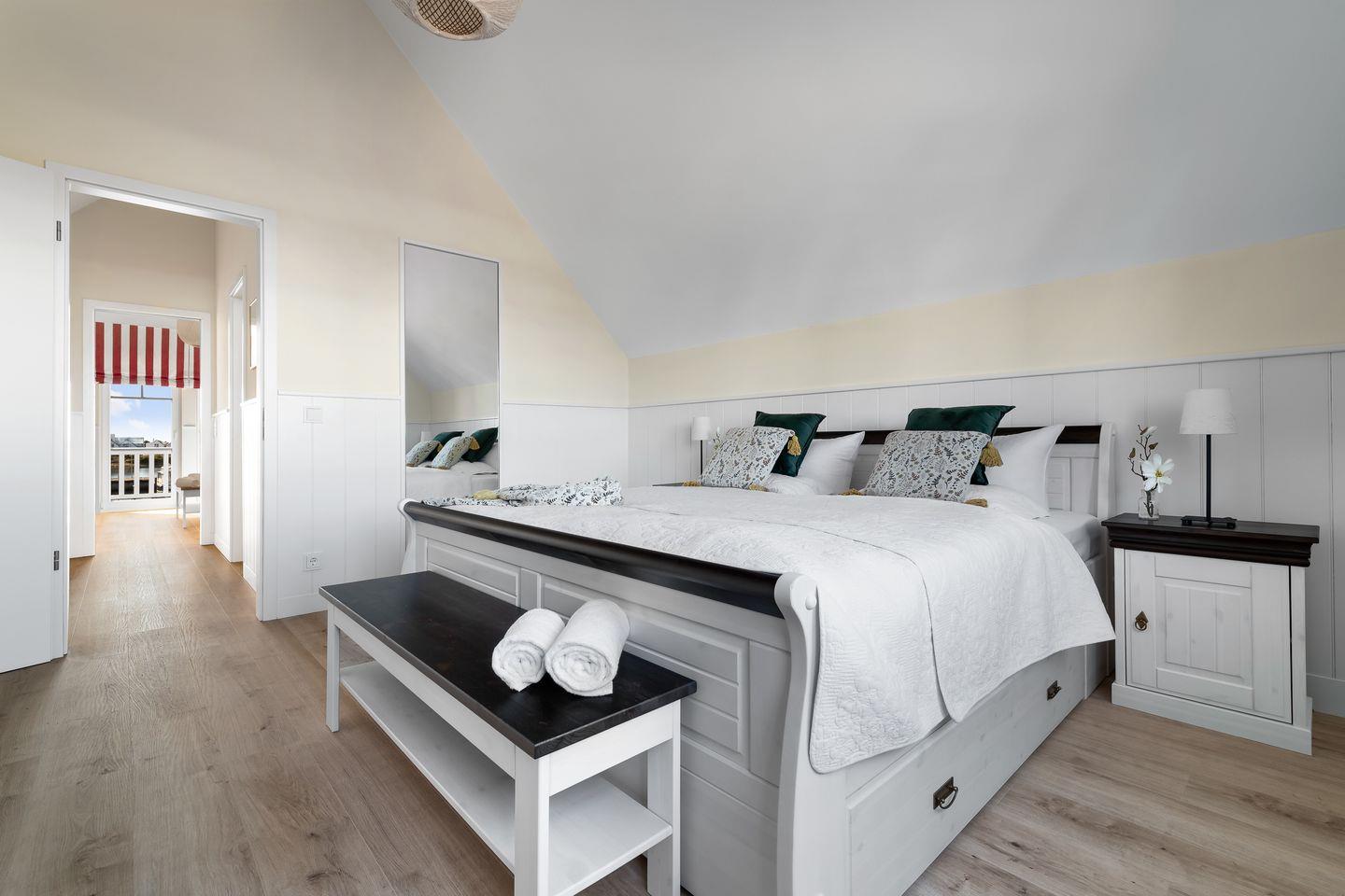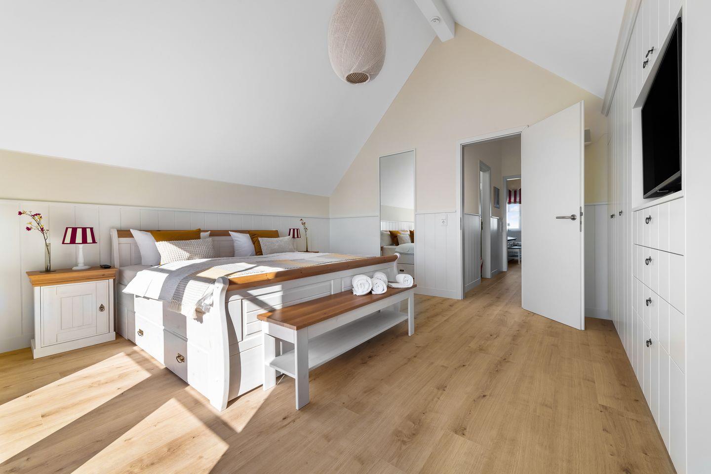 Im Obergeschoss des Ferienauses befinden sich zwei Schlafzimmer mit komfortablem Doppelbett (1,80m x 2,00m), großem Flatscreen, geräumigen Kleiderschrank und einem kleinen Sessel. In der Mitte des Obergeschosses befindet sich ein Badezimmer mit WC, Waschbecken, Spiegel, bodengleicher Dusche und toller finnischer Sauna. Das dem Wasser zugewandte Schlafzimmer verfügt zusätzlich über einen eigenen Balkon mit traumhaftem Panoramablick über den Hafen bis zur Ostsee. – Hier können Sie morgens die ersten Sonnenstrahlen genießen und den Vögeln lauschen.