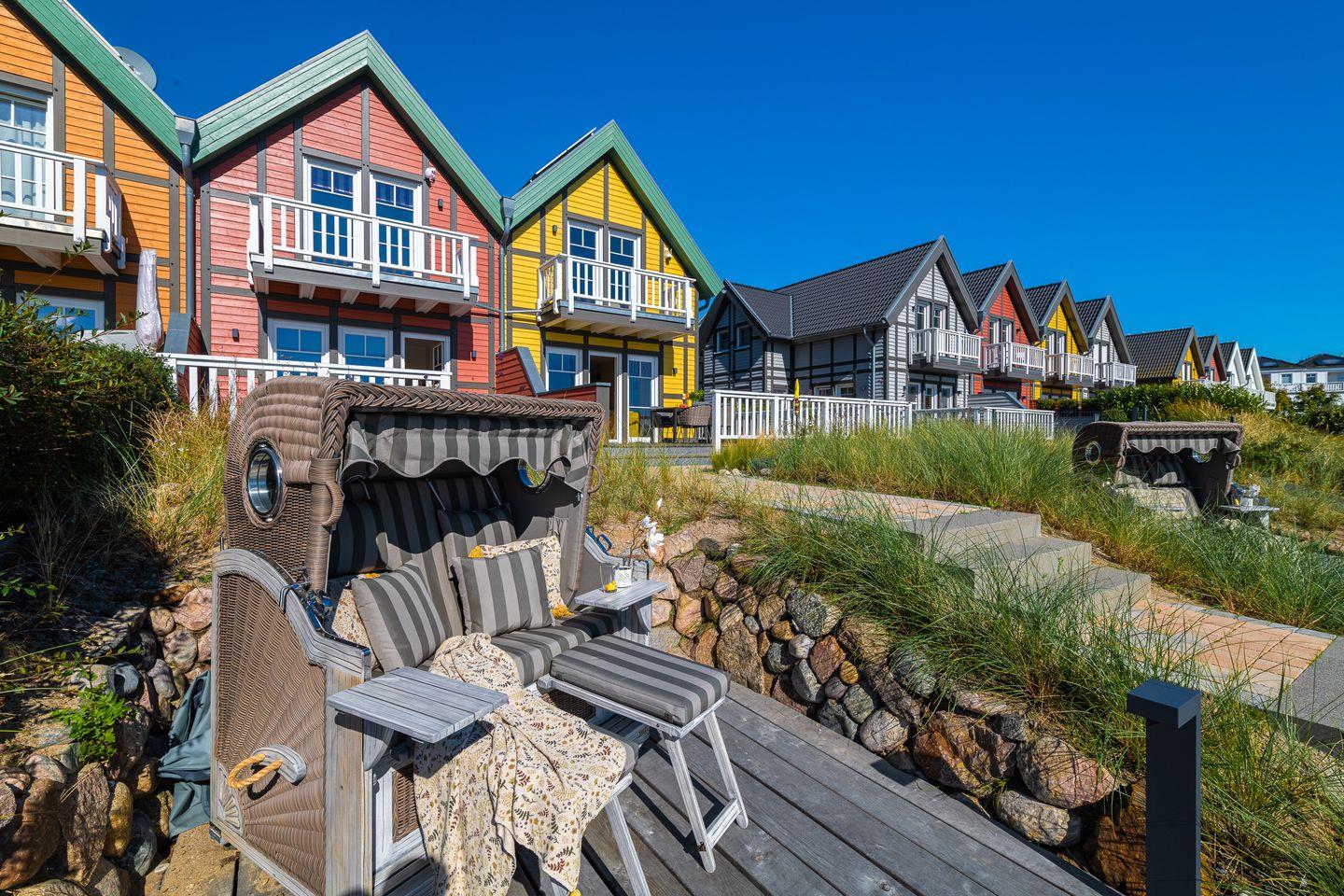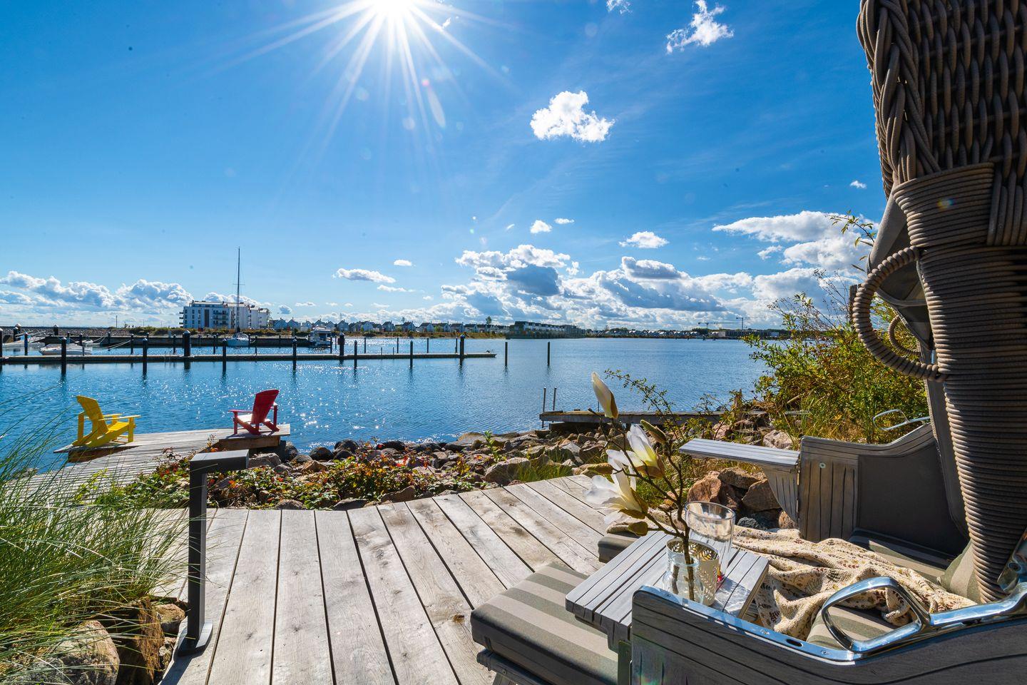 Das Ferienhaus "Hafenliebe" verfügt über zwei Terrassen, eine mit Zugang vom Wohnzimmer, ausgestattet mit Sitzgarnitur und Elektrogrill. Die zweite Terrasse ist am Steg, mit gemütlichem Strandkorb und lädt ganztags zum Sonnenbaden und Entspannen ein.