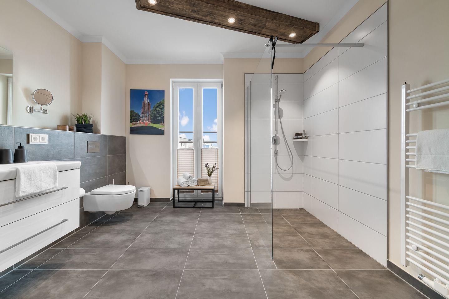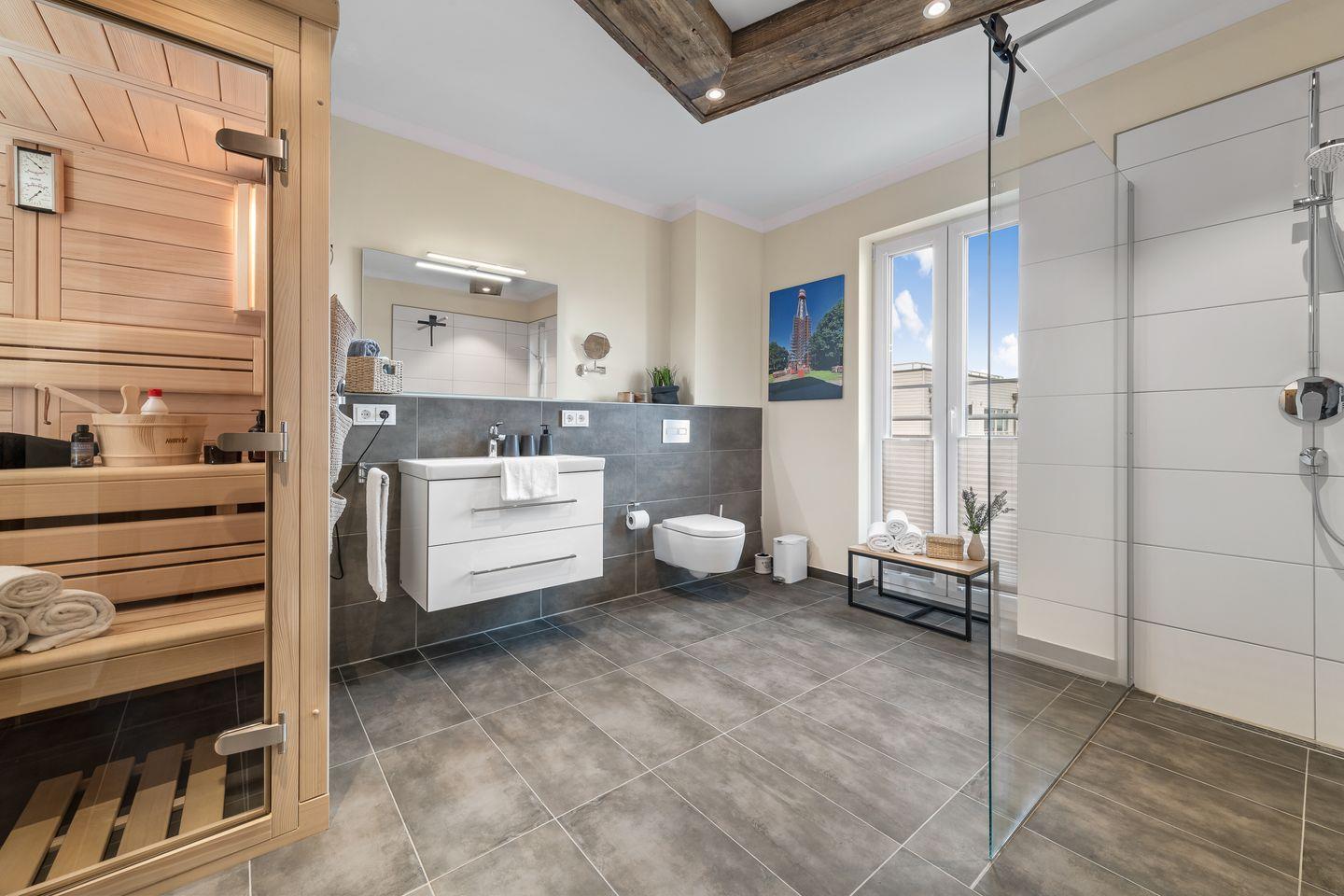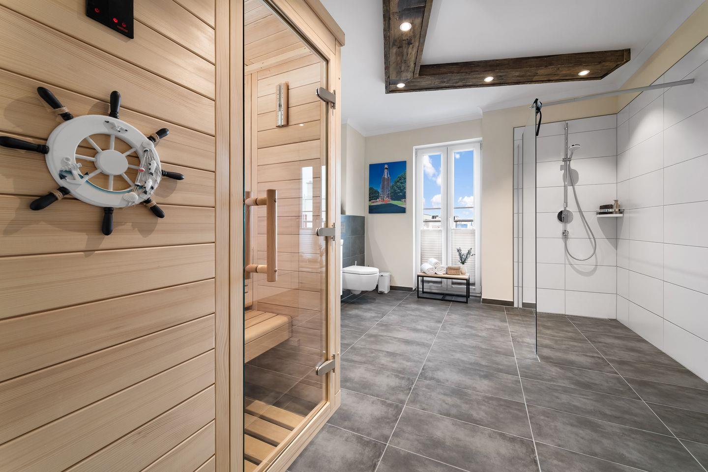 Im großzügigen Bad mit bodengleicher Dusche und WC lädt außerdem die finnische Sauna ein, die Seele baumeln zu lassen und zu entschleunigen.