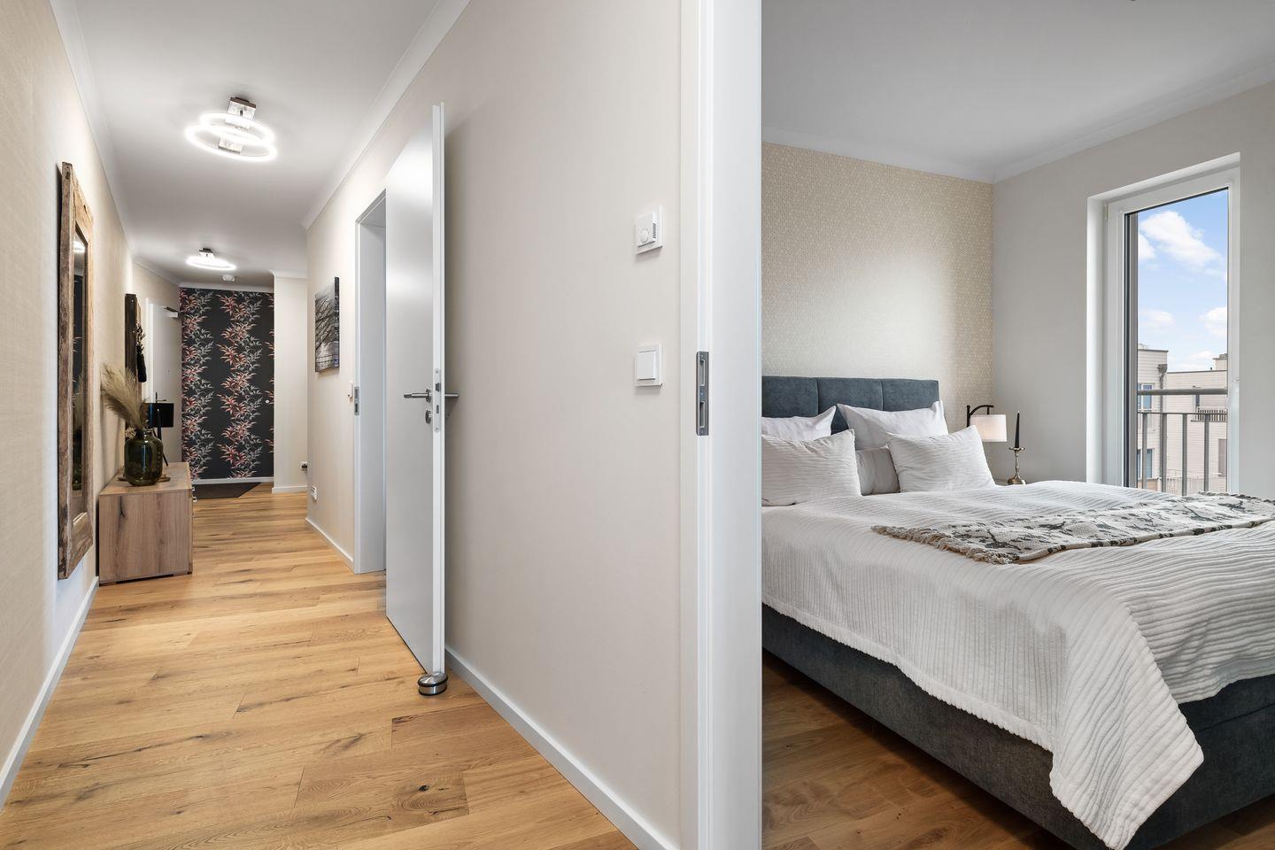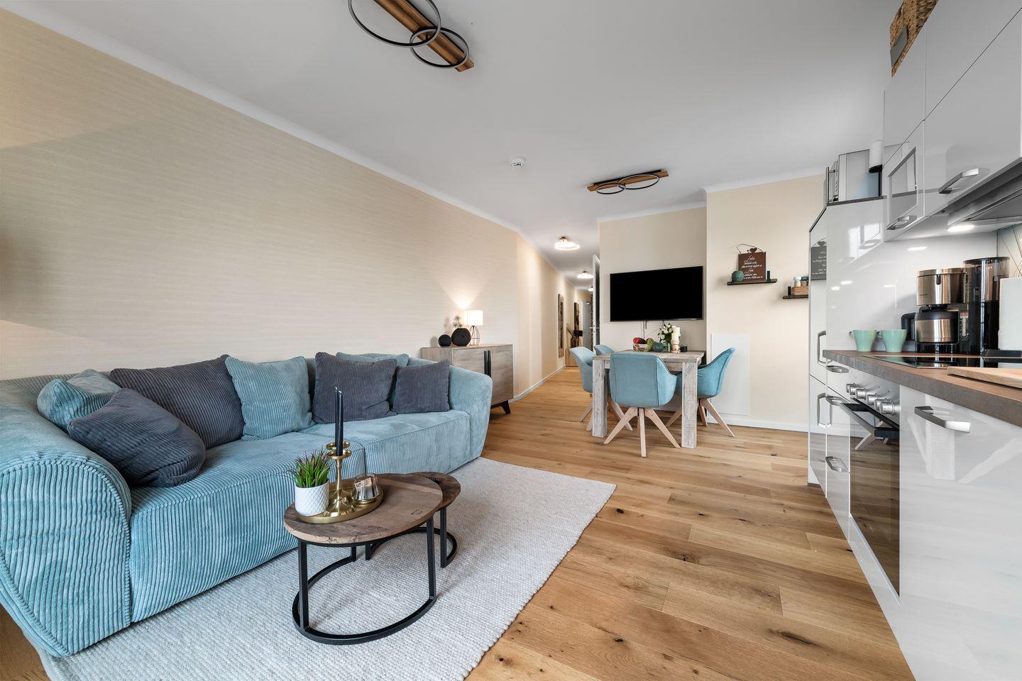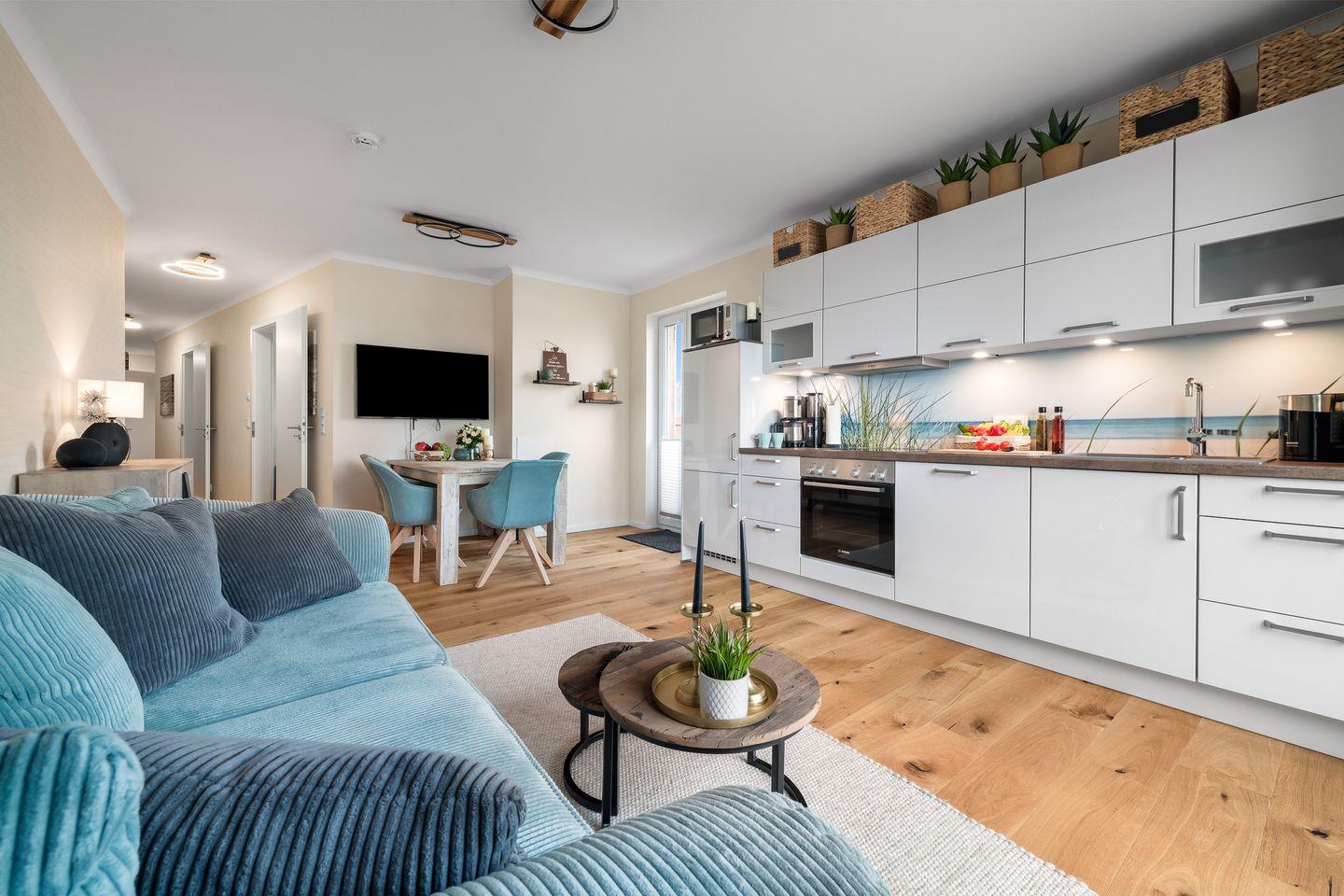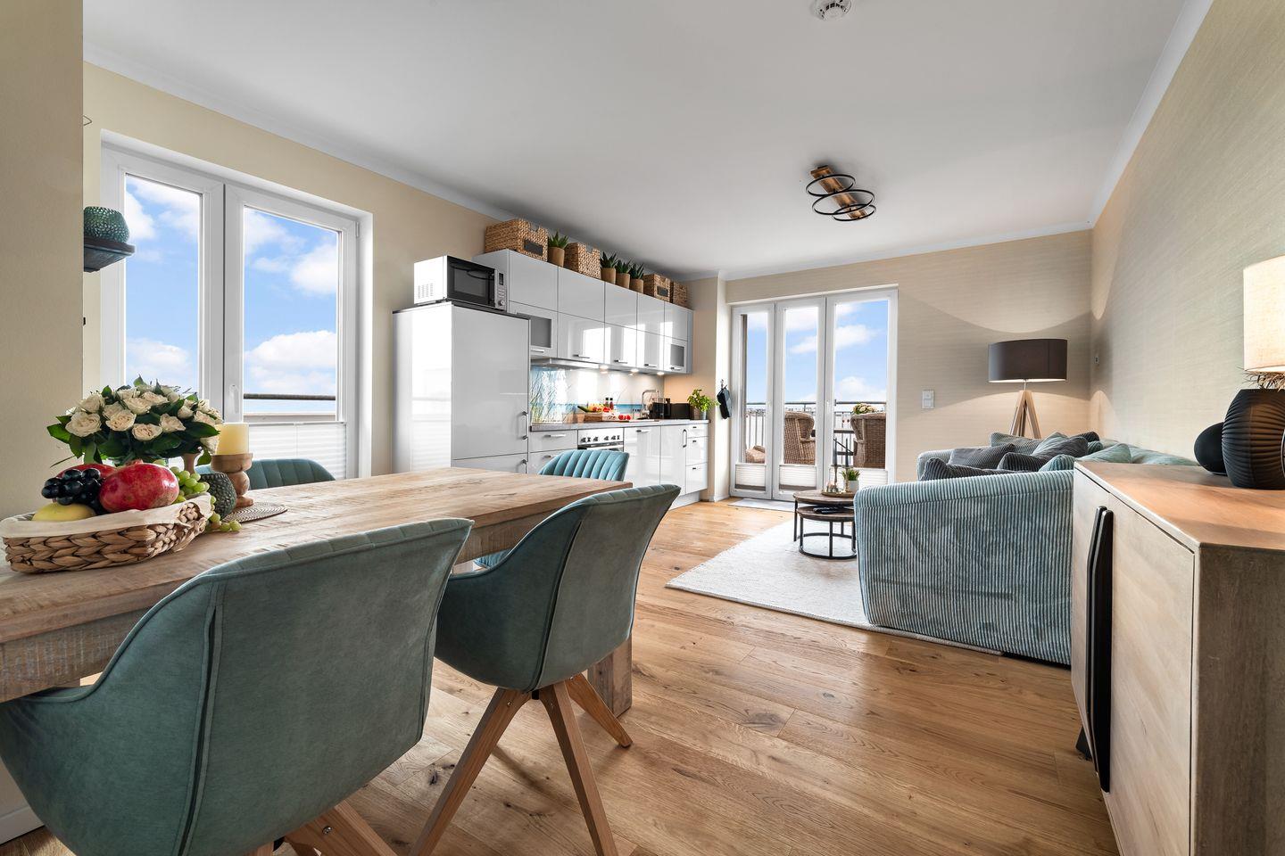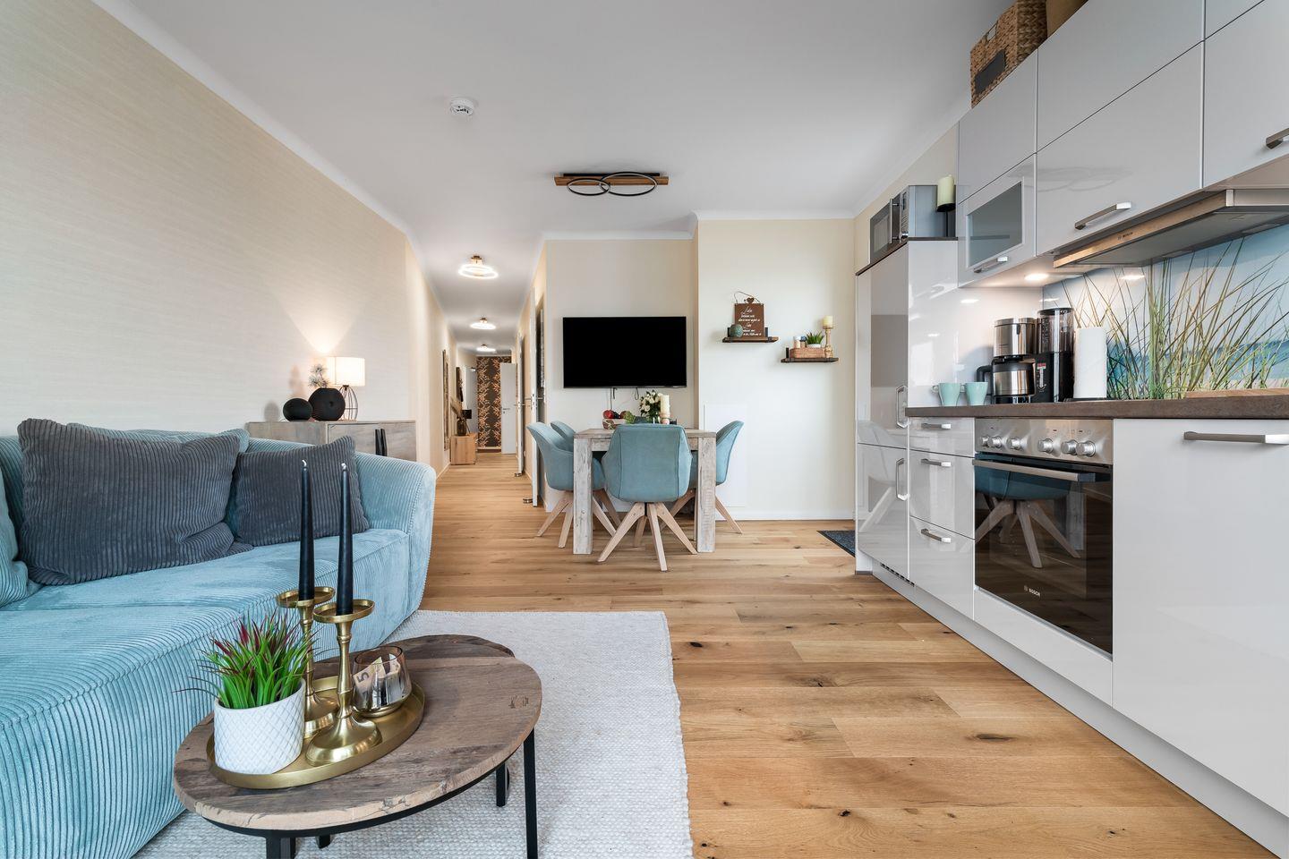 Über einen langen, lichtdurchfluteten Flur gelangen Sie in den warm-maritim gehaltenen Wohn- und Esszimmerbereich. Auf dem gemütlichen Sofa können Sie den erlebten Tag revue passieren lassen und beispielsweise bei einem guten Glas Wein in Ihrem Lieblingsbuch schmökern.