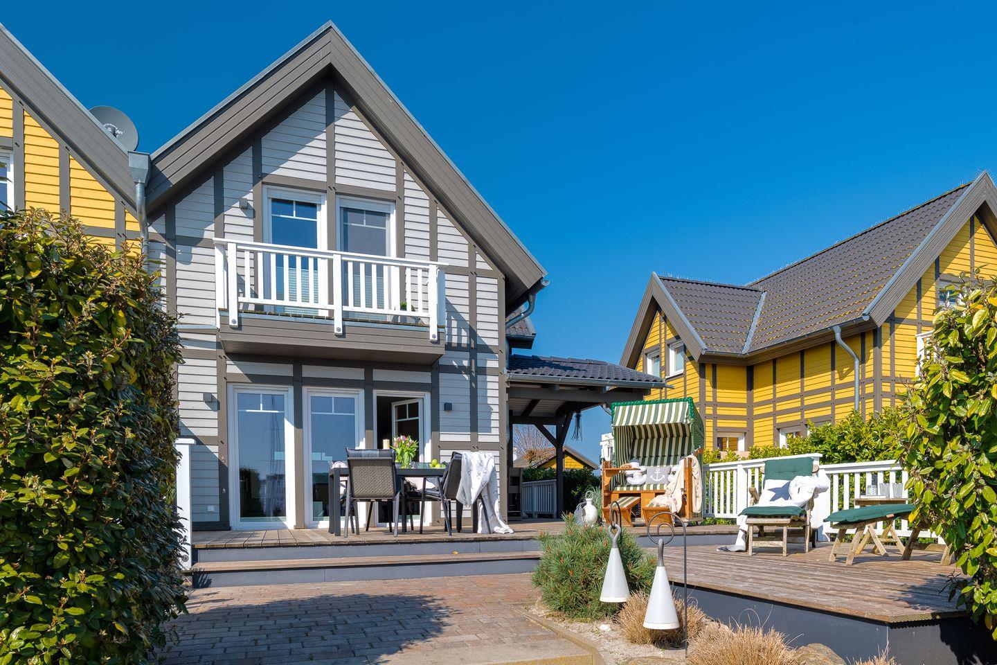 Zwei bodentiefe Fensterfronten lassen viel Licht in das "Bootshaus" und ermöglichen einen Urlaub mit Blick auf die Holzterrassen mit Strandkorb sowie den Yachthafen und die Ostsee. Zum Haus gehören ein eigener Steg mit Badeleiter.