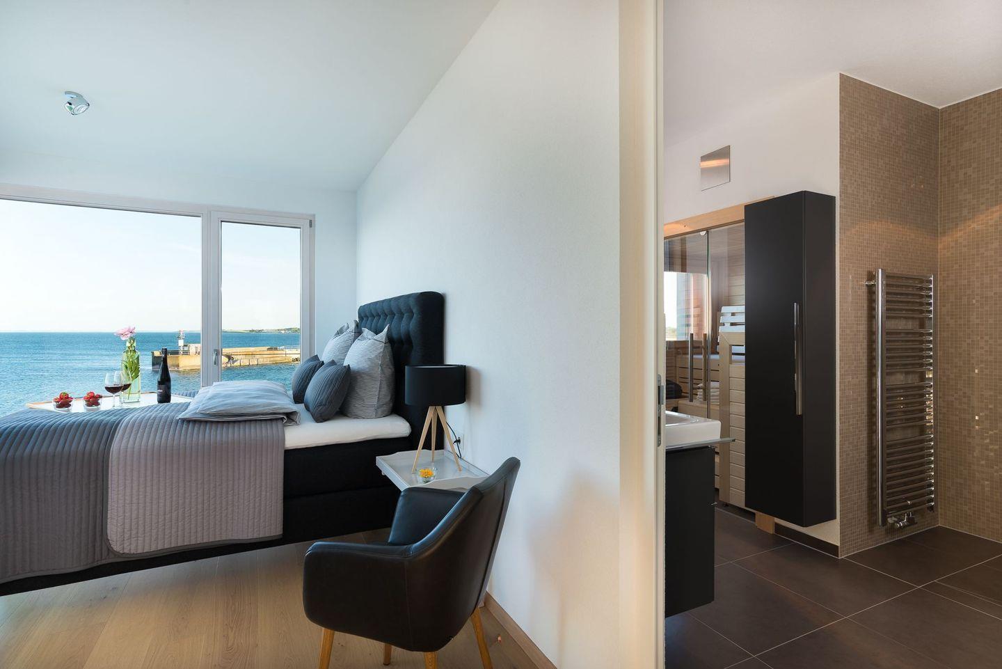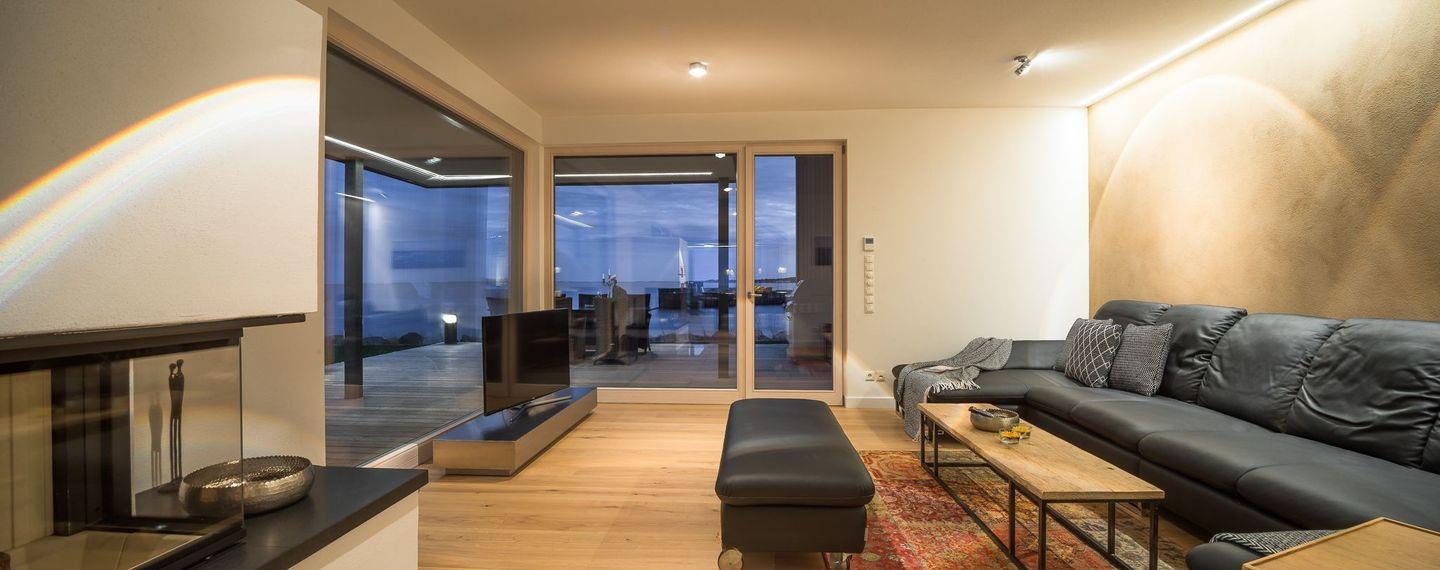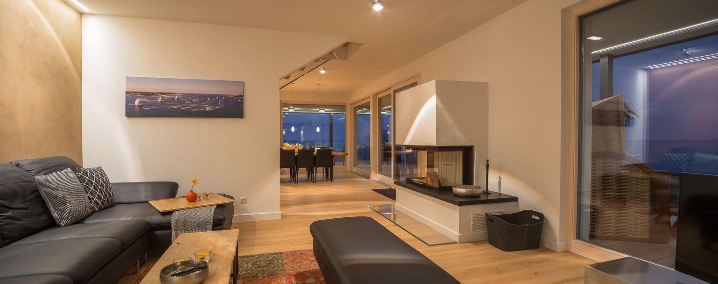Der geschmackvolle Essbereich mit einem großen Esstisch ist direkt an die Küche angeschlossen. Hier finden 8 Personen bequem Platz und alle können beim Essen den Blick auf die Ostsee durch die riesigen Panoramafenster genießen. Herzstück des Erdgeschosses ist der große Wohnbereich mit offenem Kamin und einer großen Ledersitzgruppe, die ebenfalls jedem Gast den Blick auf die Ostsee ermöglicht. Die großen Schiebetüren lassen sich auch hier öffnen und geben den Blick auf die Hafeneinfahrt und den Zugang zur großen Terrasse frei. Ebenfalls befindet sich ein Gäste-WC im Erdgeschoss.