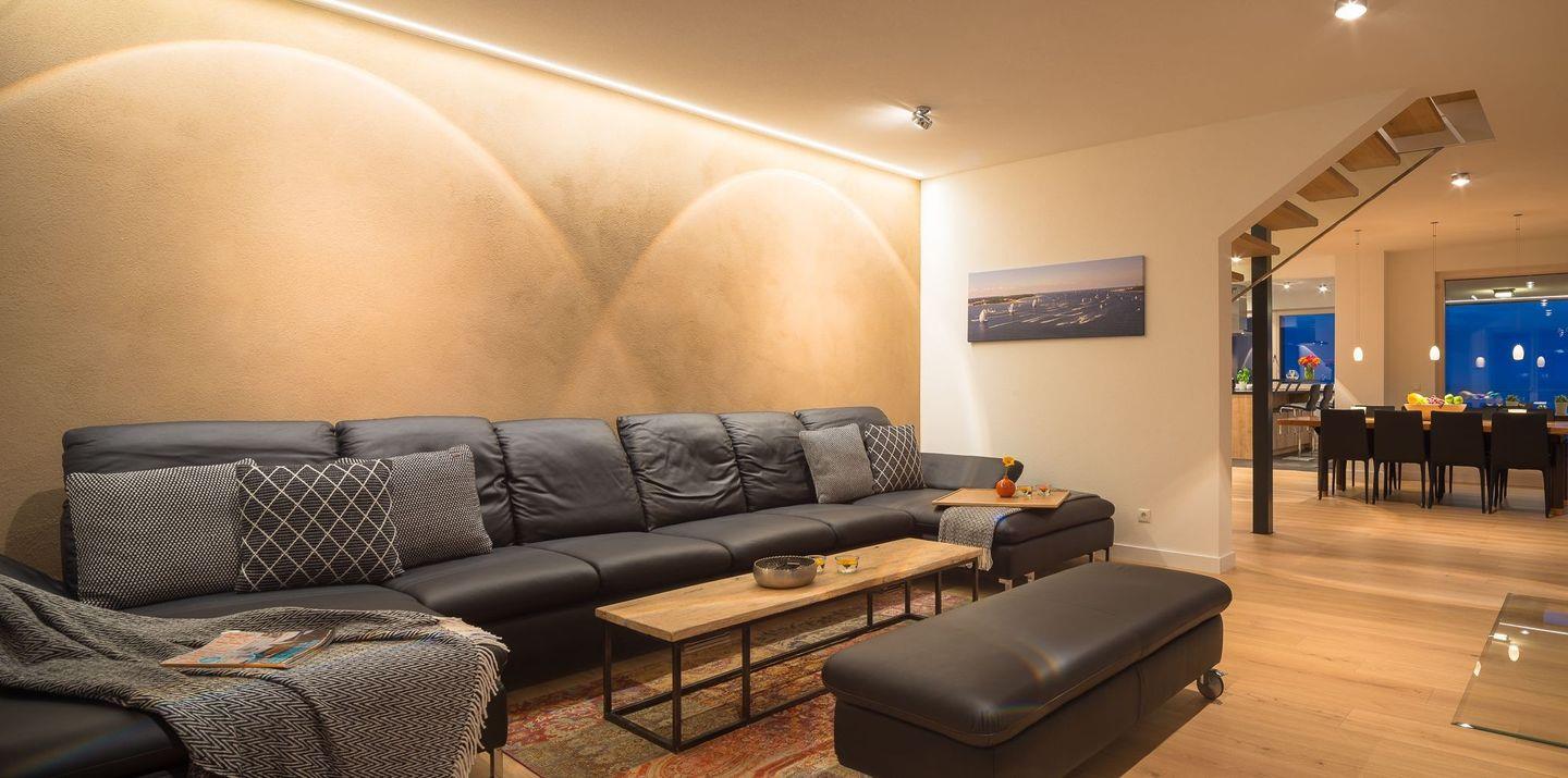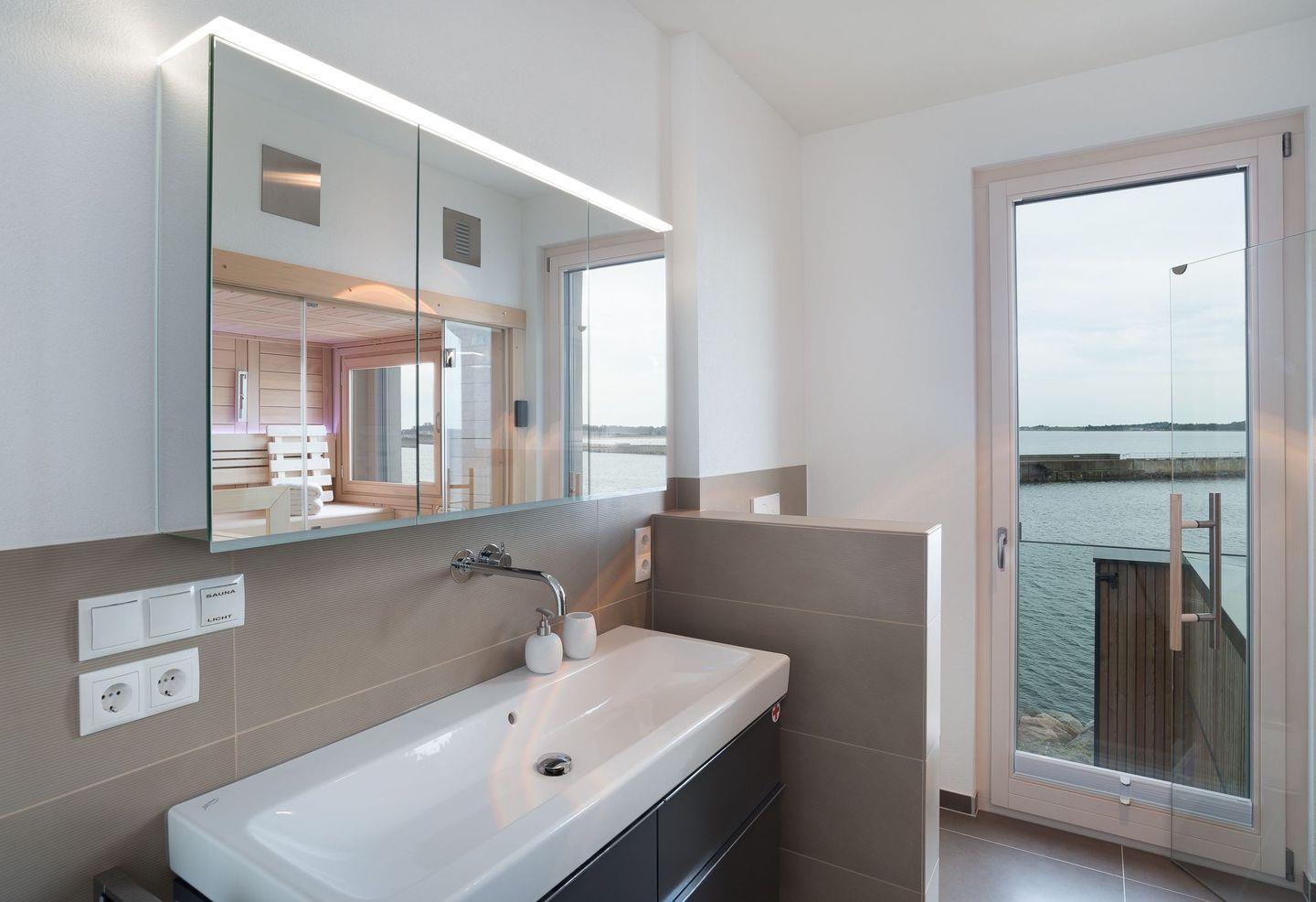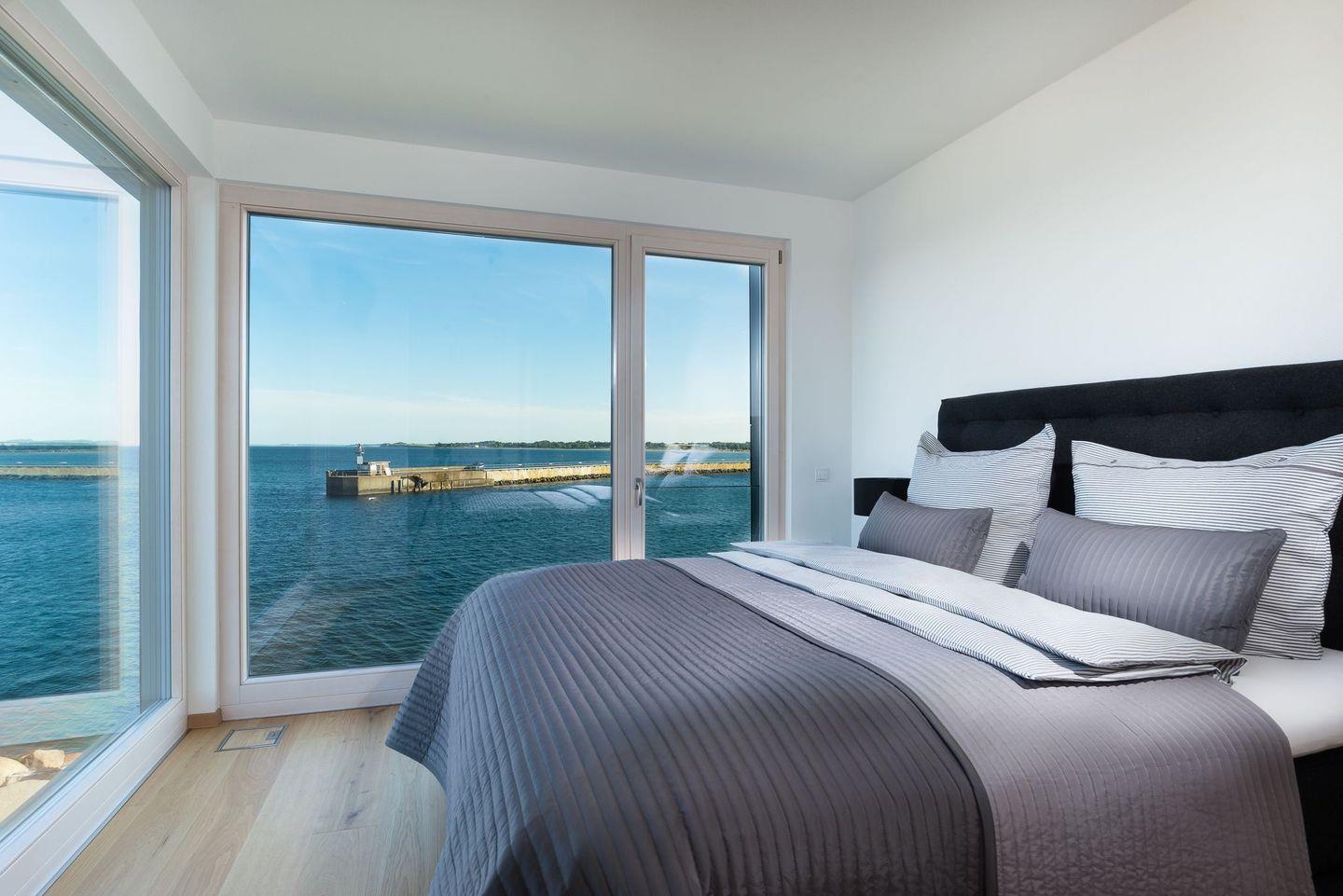 Der geschmackvolle Essbereich mit einem großen Esstisch ist direkt an die Küche angeschlossen. Hier finden 8 Personen bequem Platz und alle können beim Essen den Blick auf die Ostsee durch die riesigen Panoramafenster genießen. Herzstück des Erdgeschosses ist der große Wohnbereich mit offenem Kamin und einer großen Ledersitzgruppe, die ebenfalls jedem Gast den Blick auf die Ostsee ermöglicht. Die großen Schiebetüren lassen sich auch hier öffnen und geben den Blick auf die Hafeneinfahrt und den Zugang zur großen Terrasse frei. Ebenfalls befindet sich ein Gäste-WC im Erdgeschoss.