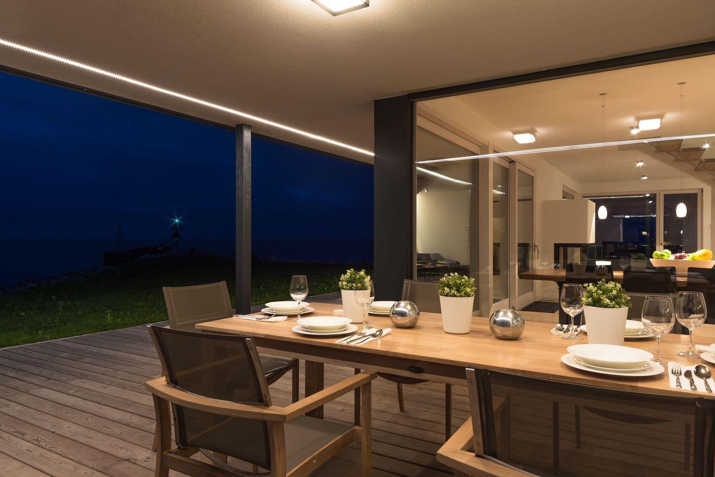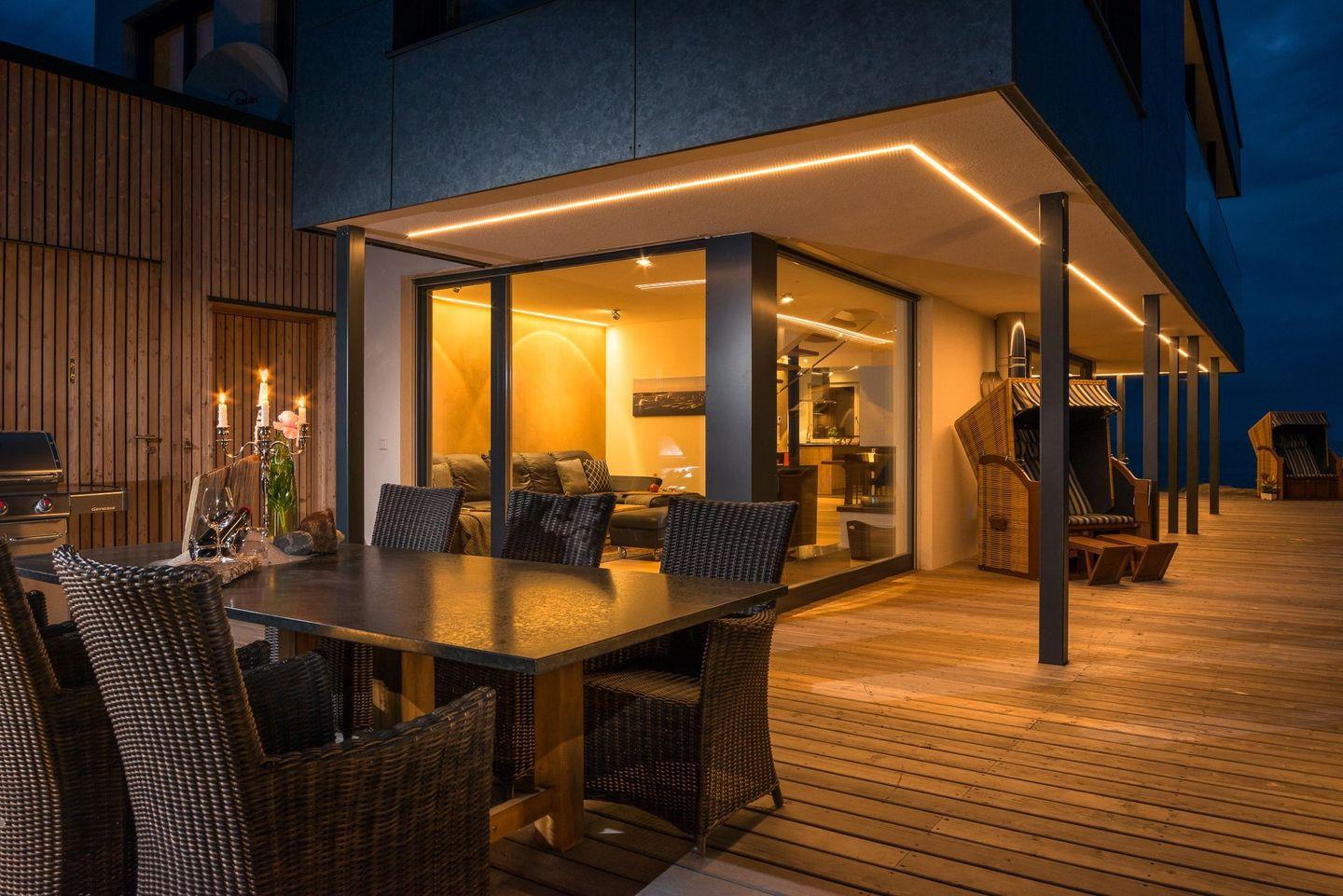 Die Außenküche, welche an die Südterrasse angrenzt, lädt zu kulinarischen Abenden ein und ist ein besonderes Highlight. Für musikalische Begleitung sorgt ein Sonos-Soundsystem, welches sowohl im Außen- als auch im Innenbereich vorhanden ist. Mit Loungemusik den Abend ausklingen lassen und dabei auch an kühleren Abenden nicht frieren. Ein Heizstrahler und ein großer Weber-Gasgrill stehen unseren Gästen hier zur Verfügung. Die Terrasse ist zum Teil überdacht und durch Lichtbänder im Vordach am Abend besonders schön beleuchtet.
