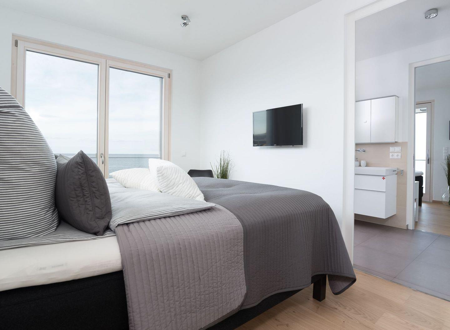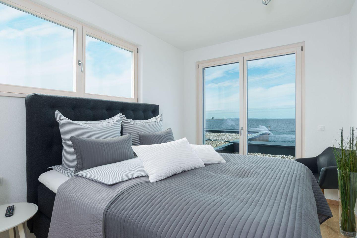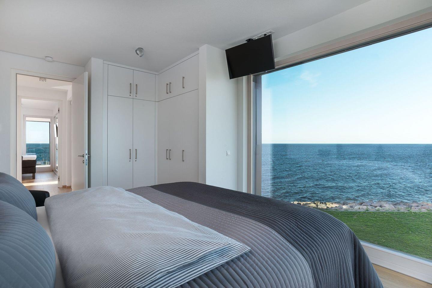 Die drei weiteren Schlafzimmer verfügen ebenfalls über große Boxspringbetten, TV, Einbauschränke und einen grandiosen Meerblick, der unsere Gäste am Morgen gern einen Moment länger im Bett verweilen lässt. Das 4. Schlafzimmer hat zudem noch Zugang zur großen Dachterrasse. Ein weiteres Badezimmer ist ebenfalls mit einem großen Waschtisch, ebenerdiger großer Dusche und WC ausgestattet.
