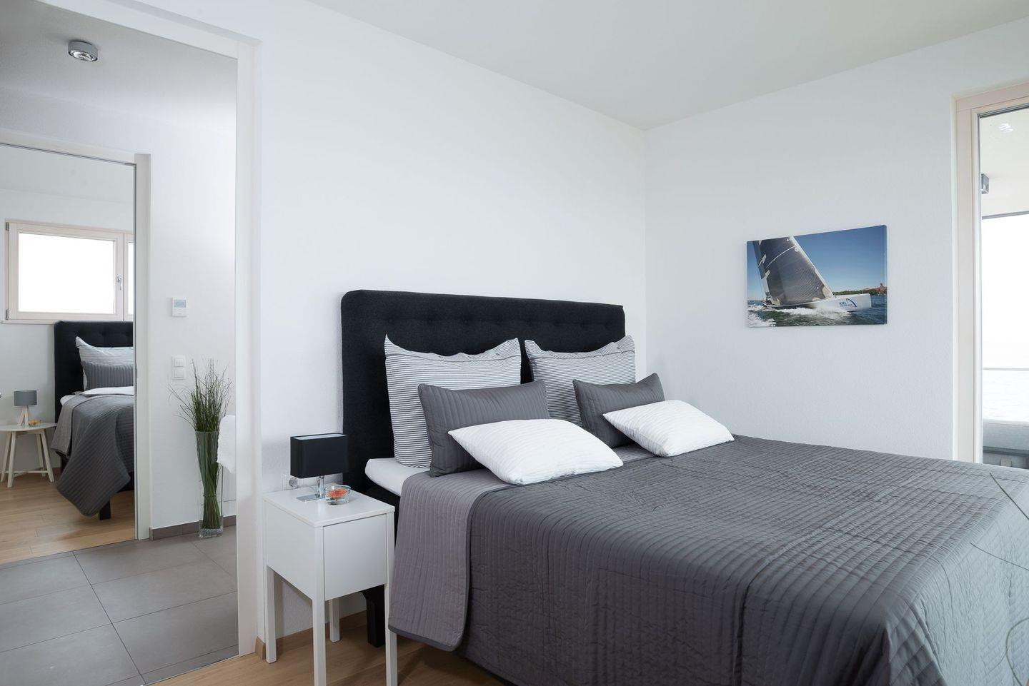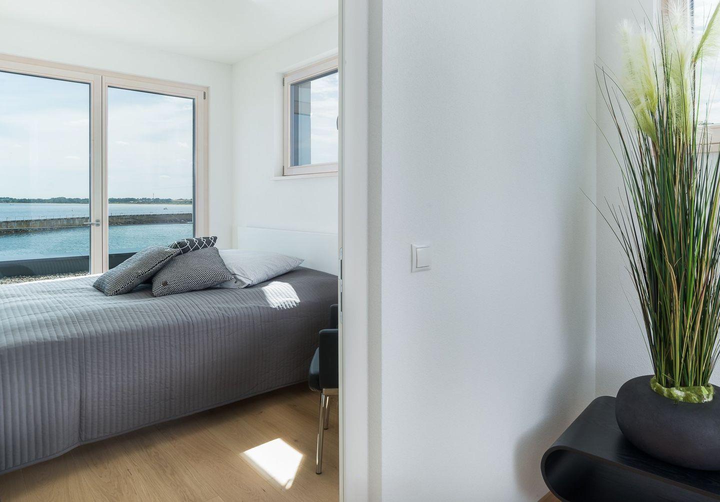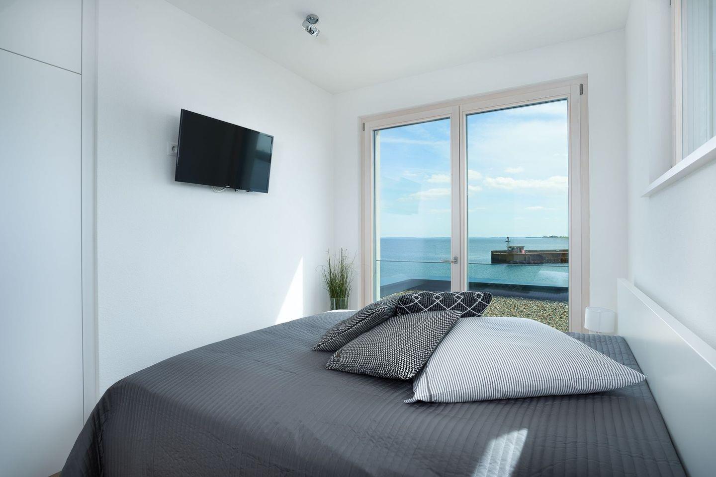 Die drei weiteren Schlafzimmer verfügen ebenfalls über große Boxspringbetten, TV, Einbauschränke und einen grandiosen Meerblick, der unsere Gäste am Morgen gern einen Moment länger im Bett verweilen lässt. Das 4. Schlafzimmer hat zudem noch Zugang zur großen Dachterrasse. Ein weiteres Badezimmer ist ebenfalls mit einem großen Waschtisch, ebenerdiger großer Dusche und WC ausgestattet.
