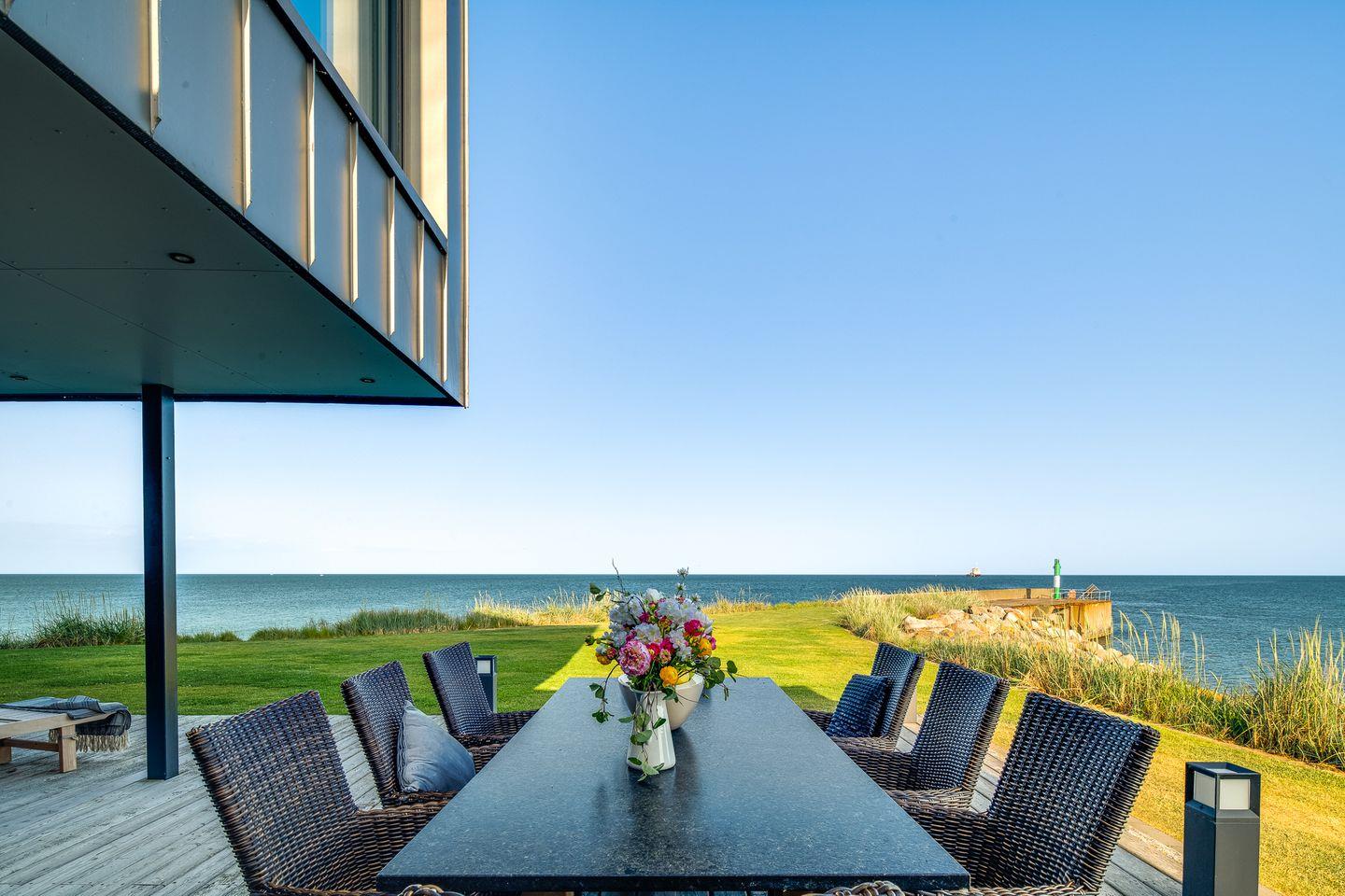 Über die gesamte Breite des Erdgeschosses erschließt sich eine Terrasse mit großer Rasenfläche, welche direkt an die Ostsee grenzt. Die Terrasse ist zu jeder Seite mit einem großen Tisch und bequemer Bestuhlung ausgestattet. Schon beim Frühstück die Sonne genießen, zum Kaffee das Rauschen des Meeres hören und den Sundowner in einem der zwei Strandkörbe genießen.