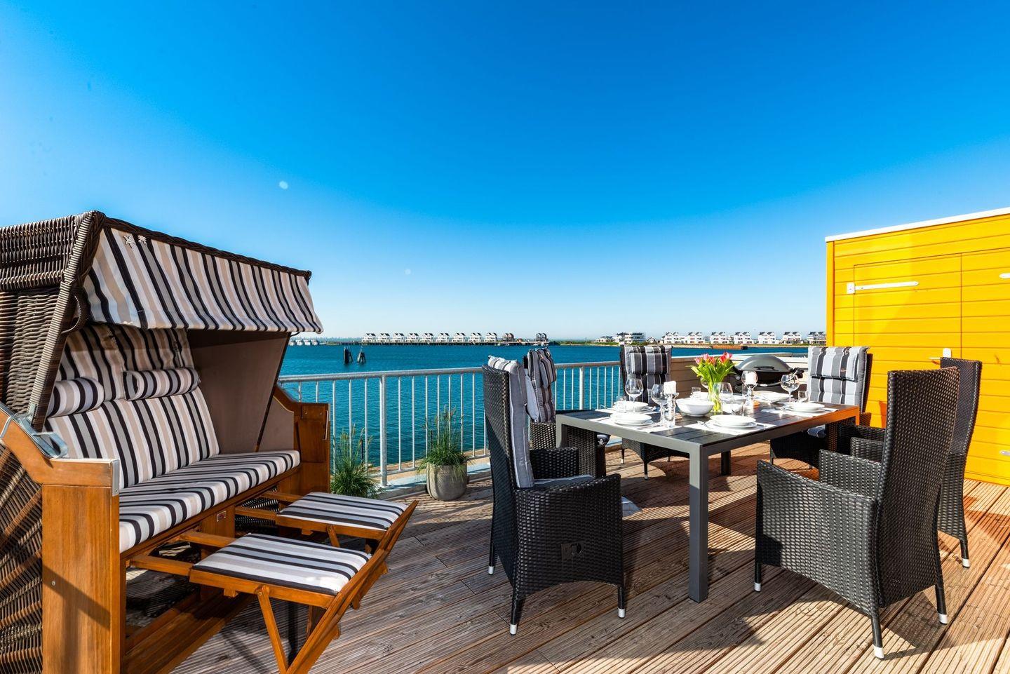 Luxusferienwohnung direkt am Wasser mit Kaminofen, Wellnesssauna, Whirlwanne und hochwertiger Ausstattung. Ein Traumblick auf den Yachthafen und die Ostsee.