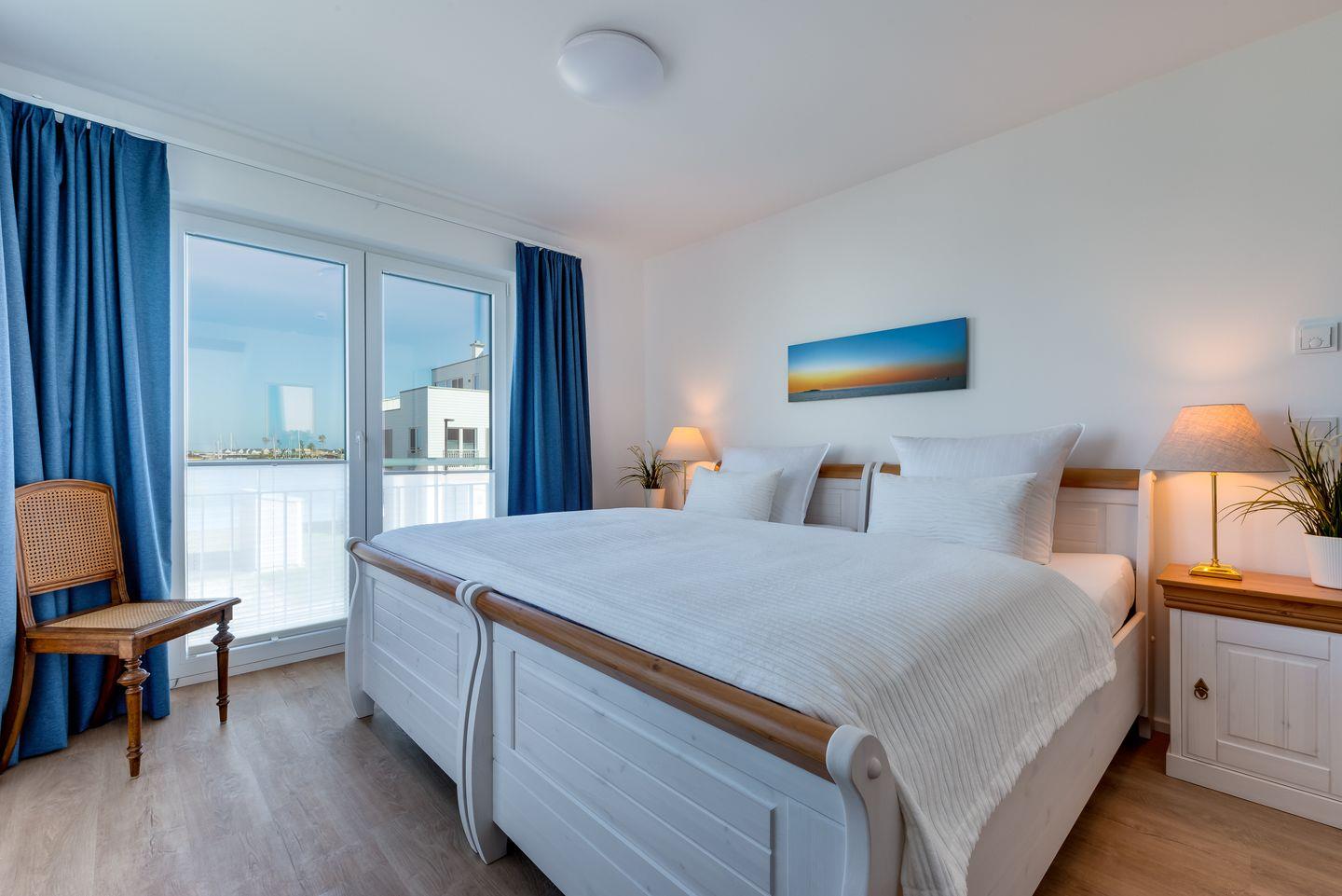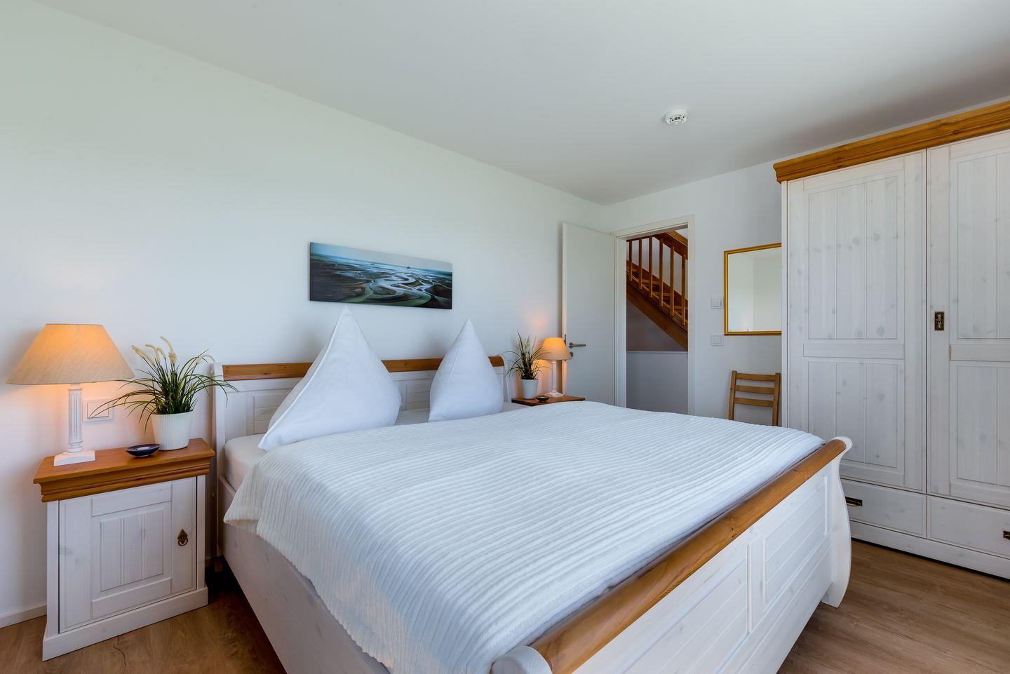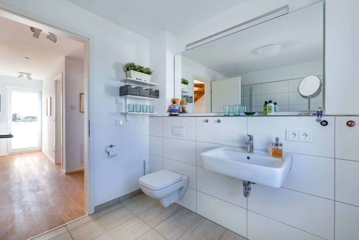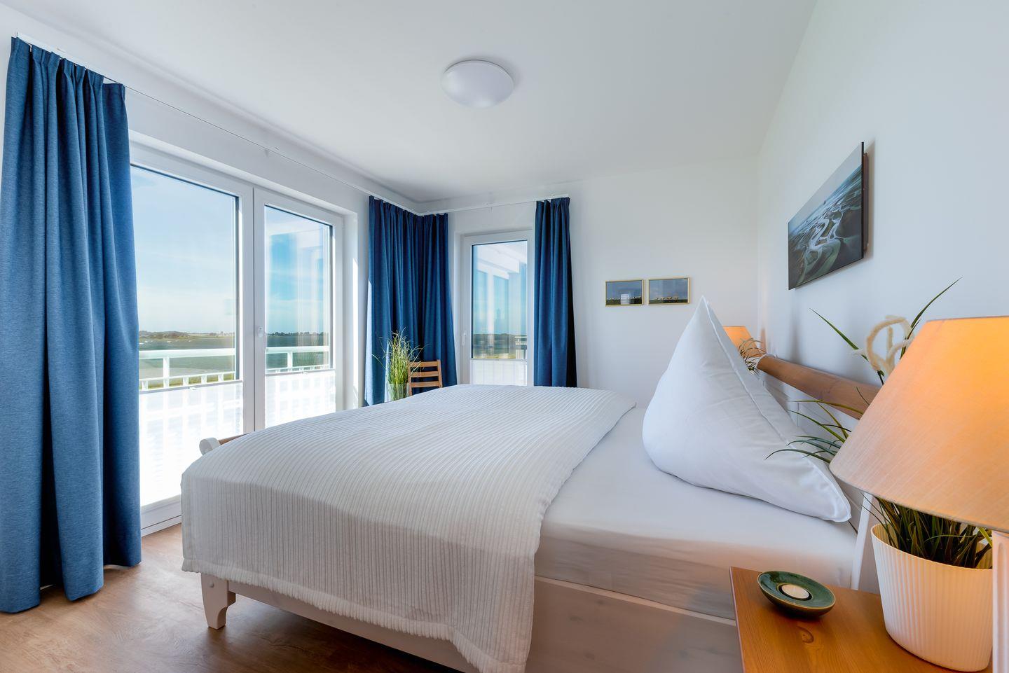 Im ersten OG befinden sich zwei Schlafzimmer mit Doppelbetten: Das erste mit Panoramablick über die Schlei, Schleimünde und die Ostsee, das zweite mit einem beeindruckenden Blick auf das OstseeResort Olpenitz. Das Badezimmer lässt keine Wünsche offen und bietet sowohl eine Dusche als auch eine Badewanne.