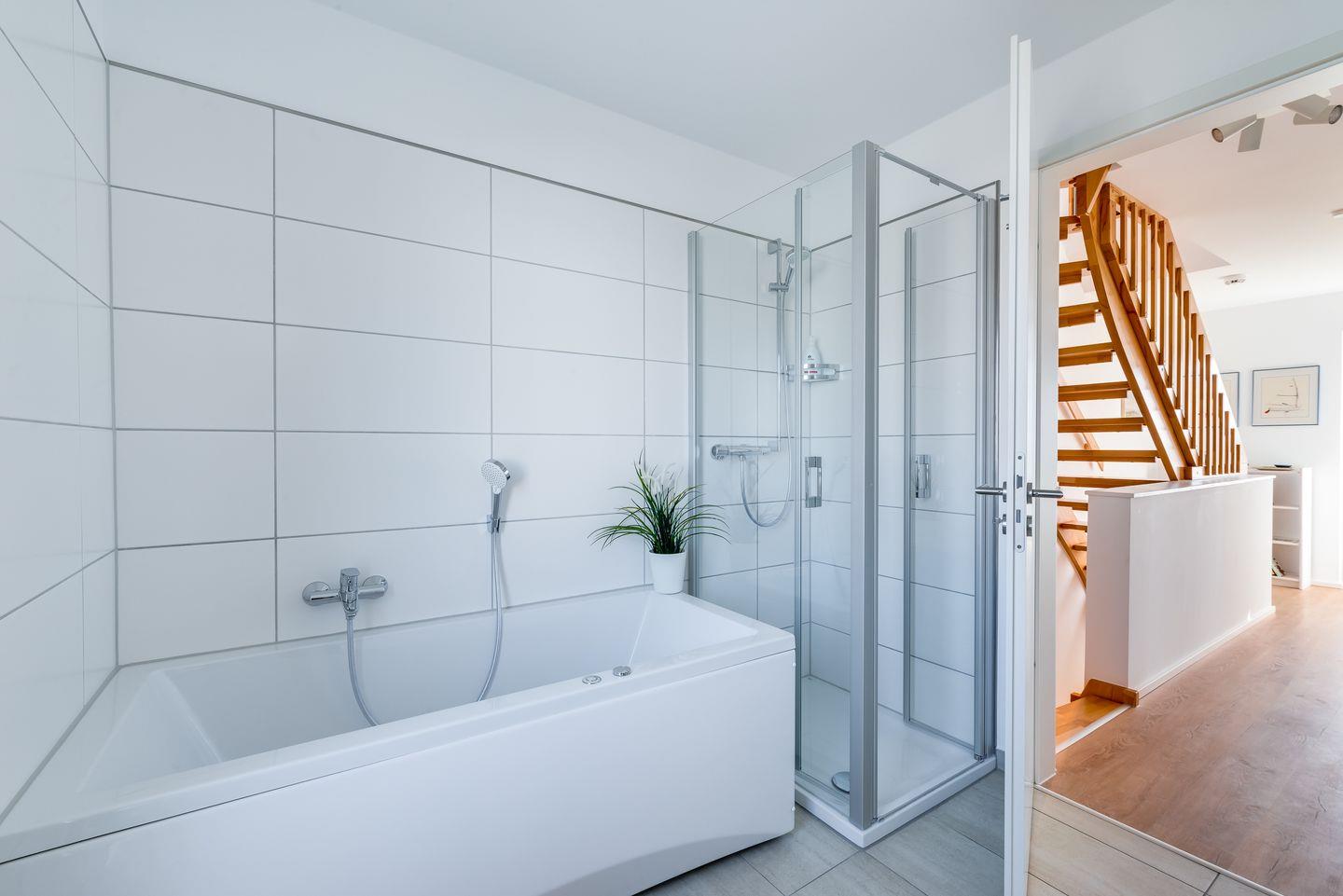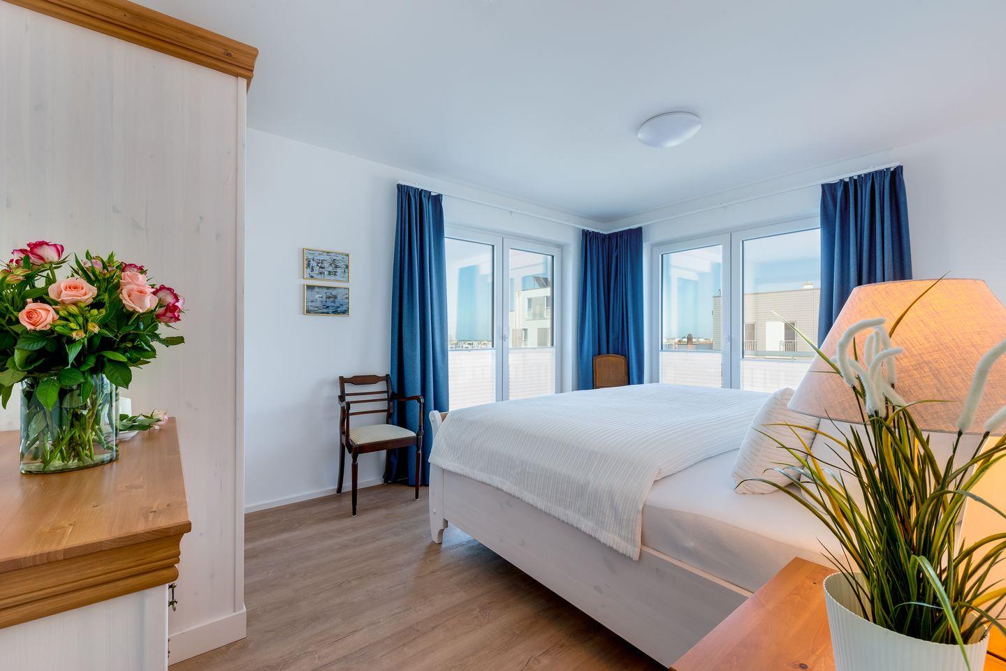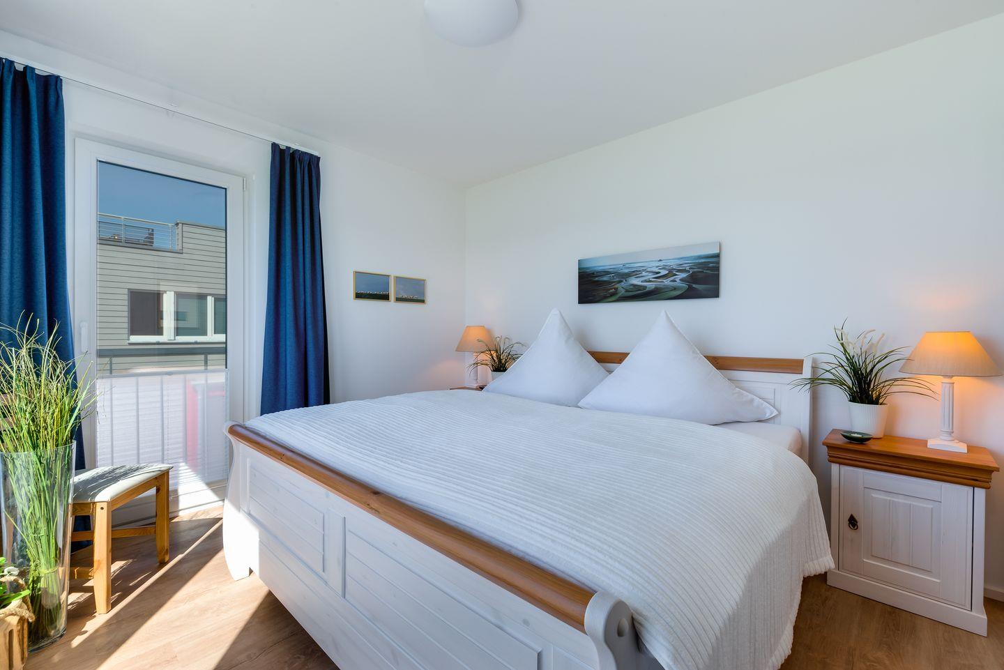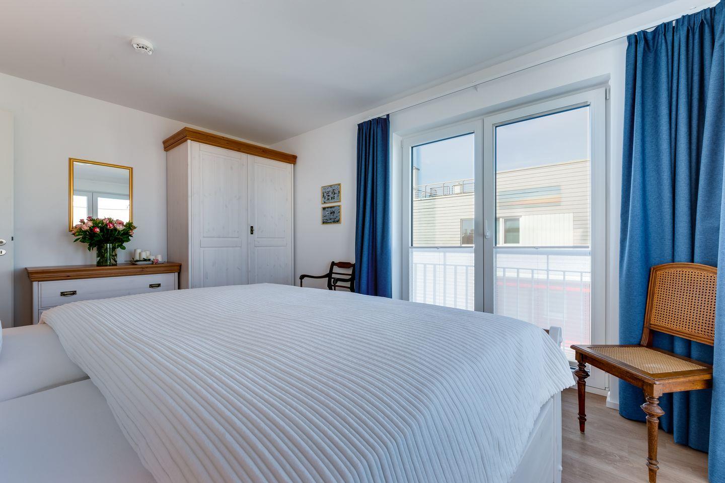 Im ersten OG befinden sich zwei Schlafzimmer mit Doppelbetten: Das erste mit Panoramablick über die Schlei, Schleimünde und die Ostsee, das zweite mit einem beeindruckenden Blick auf das OstseeResort Olpenitz. Das Badezimmer lässt keine Wünsche offen und bietet sowohl eine Dusche als auch eine Badewanne.
